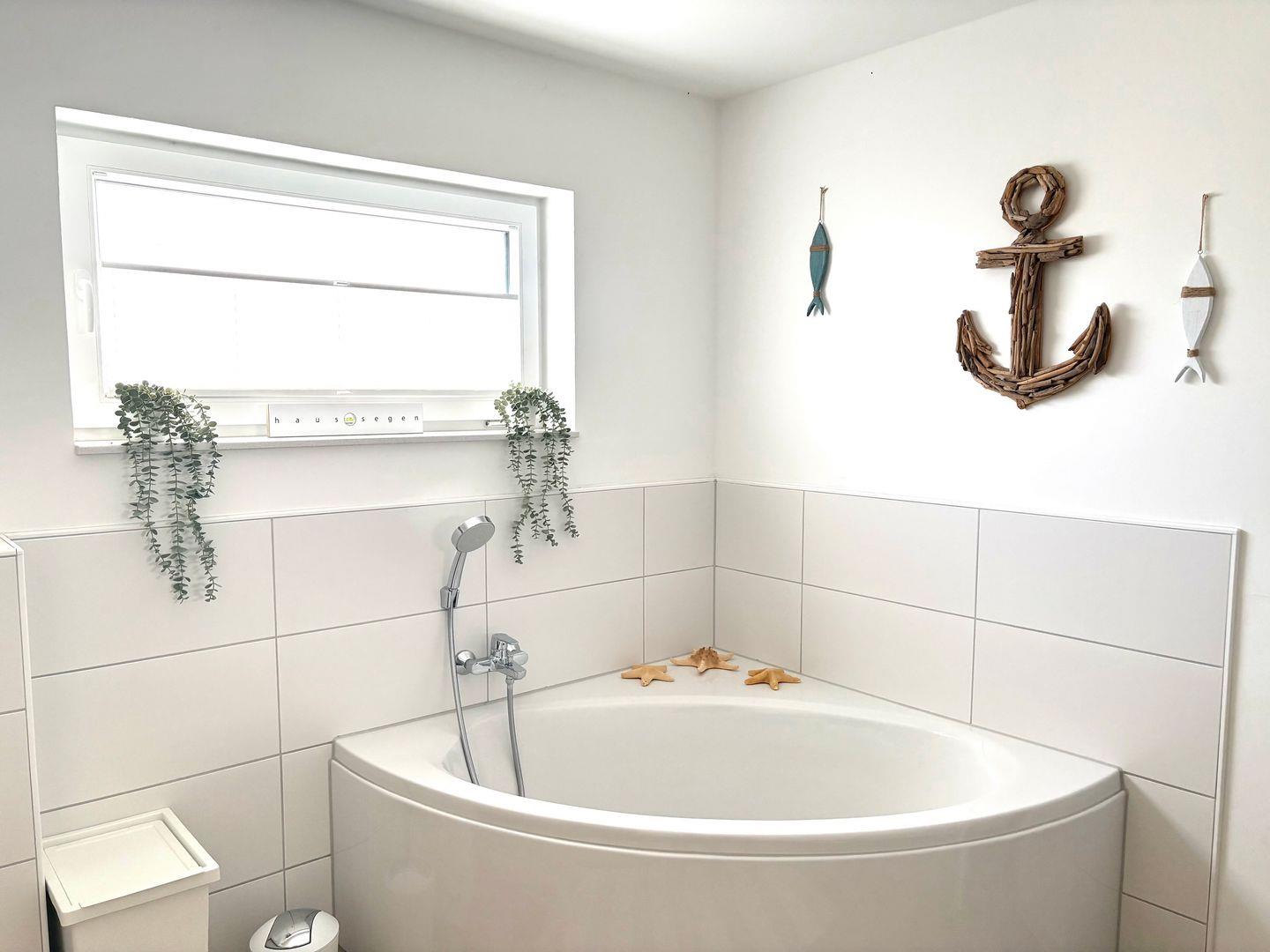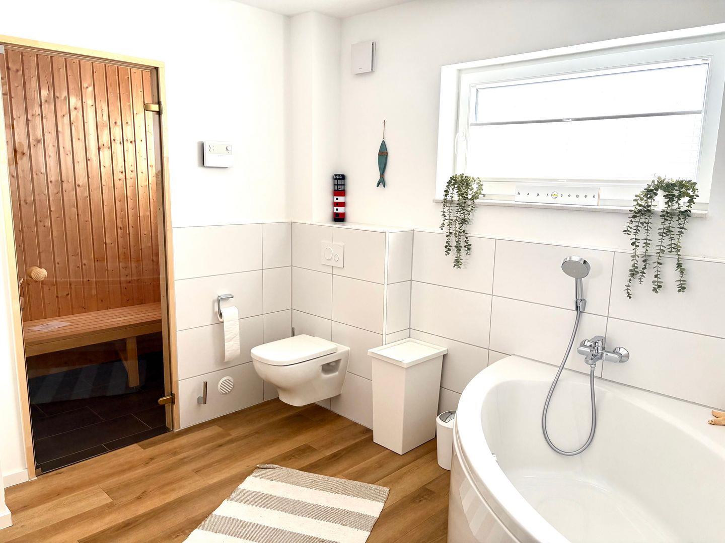 Das großzügige Tageslicht-Badezimmer mit Fußbodenheizung bietet euch eine private Sauna, Badewanne, Regendusche, Waschbecken und WC und verfügt über einen Föhn.