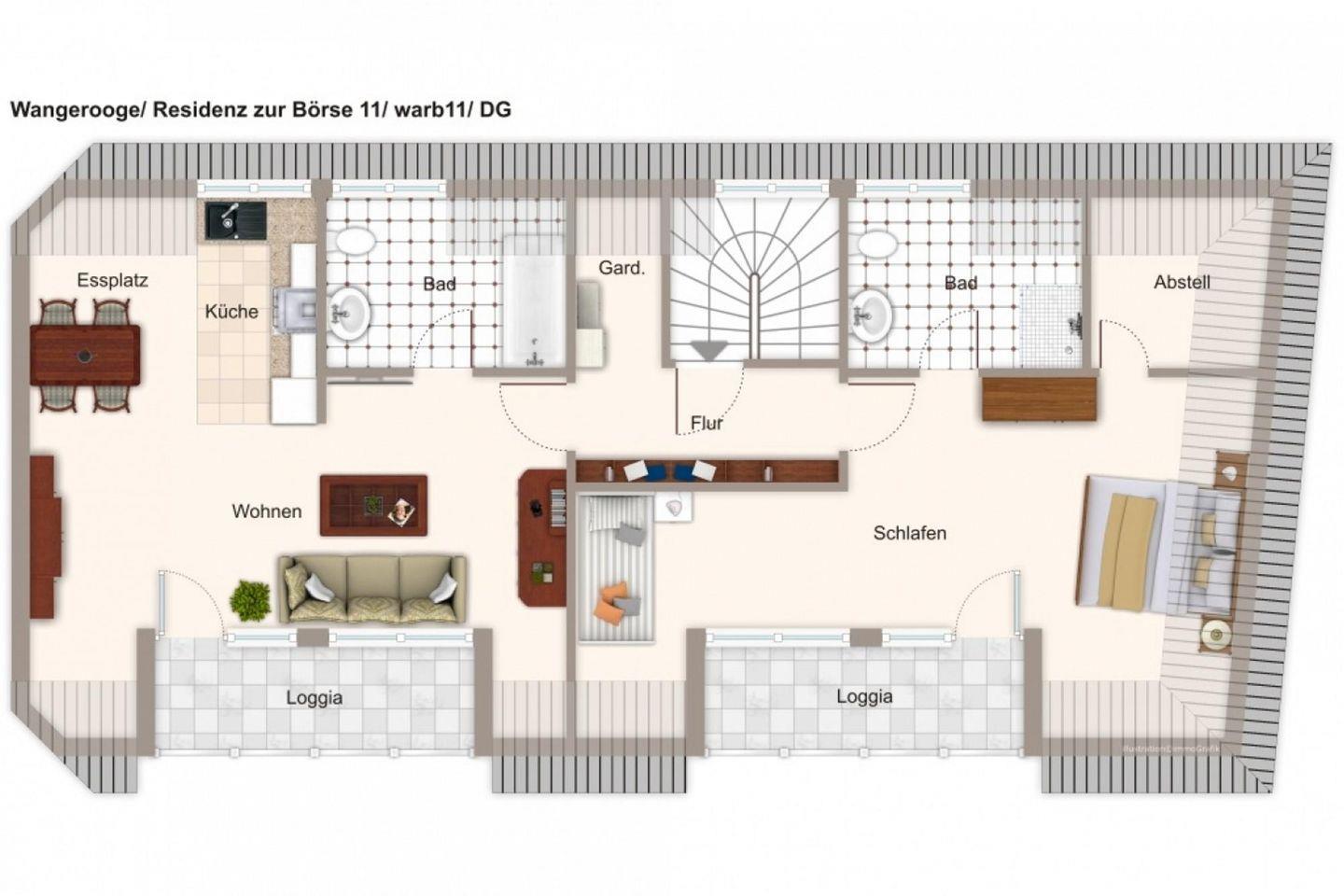 Das moderne und gemütliche Apartment befindet sich im Dachgeschoss der Ferienanlage ‘Residenz zur Börse', in zentraler Lage und 600 Meter vom feinen, weißen Sandstrand der Insel Wangerooge entfernt. In der unmittelbaren Umgebung findet ihr zahlreiche Einkaufsmöglichkeiten, Restaurants und Cafés.