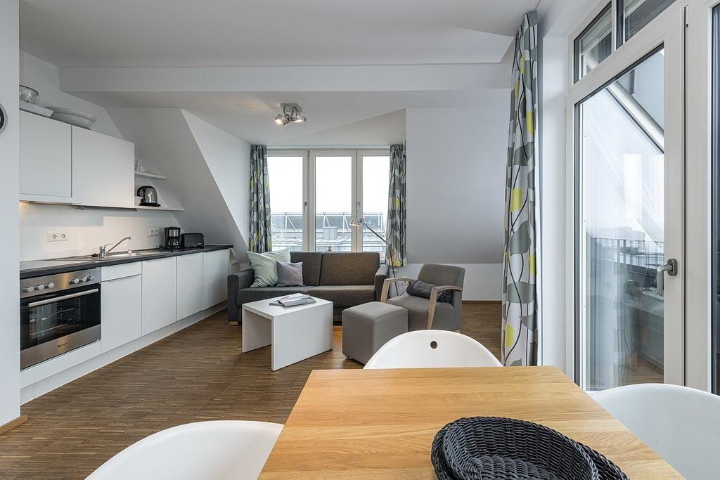 Das überaus gemütliche Apartment ist barrierearm und verfügt über Meerblick. Der Wohn-Schlafraum bietet euch eine voll ausgestattete offene Küche mit Geschirrspüler, Gefrierfach, Kaffeemaschine, Toaster, Wasserkocher und Backofen sowie ein Doppelbett (1,40 m x 2 m), eine Doppelschlafcouch, einen Flatscreen-TV und WLAN. Ein Kinderbett kann gegen Entgelt aufgestellt werden. Im modernen und hellen Badezimmer befinden sich eine begehbare Dusche sowie ein Waschtisch mit Föhn und Kosmetikspiegel. Auf der geschützten Loggia in West-Lage könnt ihr den Urlaubstag bei einem Sundowner in der Abendsonne ausklingen lassen.