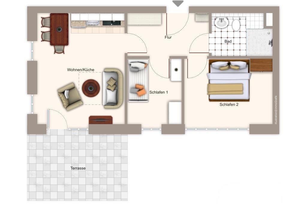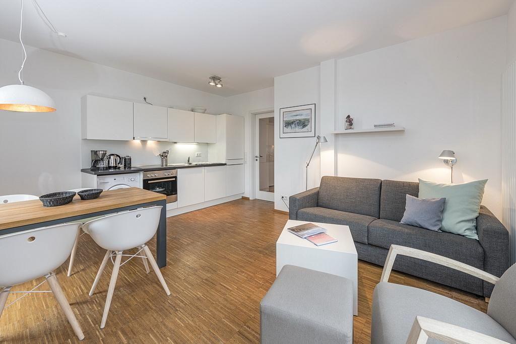 Das barrierefreie und helle Apartment verfügt über kostenfreies WLAN. Die offene Küche bietet euch u. a. Gefrierfach, Kaffeemaschine, Toaster, Wasserkocher, Backofen und eine eigene Waschmaschine. Im modernen Badezimmer befinden sich eine große begehbare Dusche sowie ein Waschtisch mit Föhn und Kosmetikspiegel. Eines der beiden Schlafzimmer verfügt über ein Doppelbett, das zweite über ein Einzelbett, im Wohnzimmer stehen euch ein Flatscreen-TV und eine Einzelschlafcouch zur Verfügung. Ein Kinderbett kann gegen Entgelt aufgestellt werden. Die sonnige Süd-Terrasse macht den Nordsee-Urlaub hier perfekt.