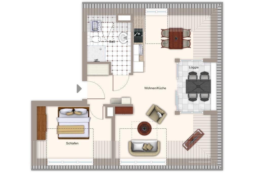 Die 49 m² große 2-Zimmer Ferienwohnung ist für bis zu 4 Personen geeignet. Besonders hervorzuheben ist der geschützte Loggia in Ost-Lage.