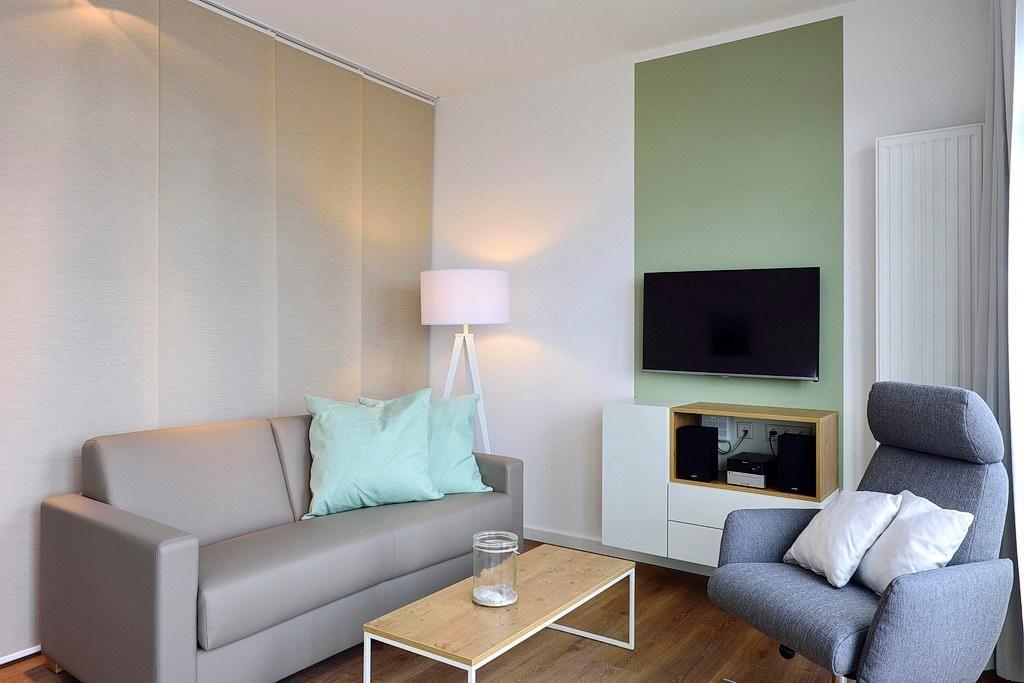Das Apartment verfügt über ein Doppelbett, ein Etagenbett, einen großen Flatscreen-TV und eine HiFi-Anlage. Ein Kinderbett kann gegen Entgelt im Wohnbereich aufgestellt werden. Nach einem erholsamen Urlaubstag lässt sich auf dem westseitig gelegenen Balkon herrlich entspannen. Neben Gartenmöbeln für 4 Personen steht euch hier auch ein eigener Strandkorb zur Verfügung.