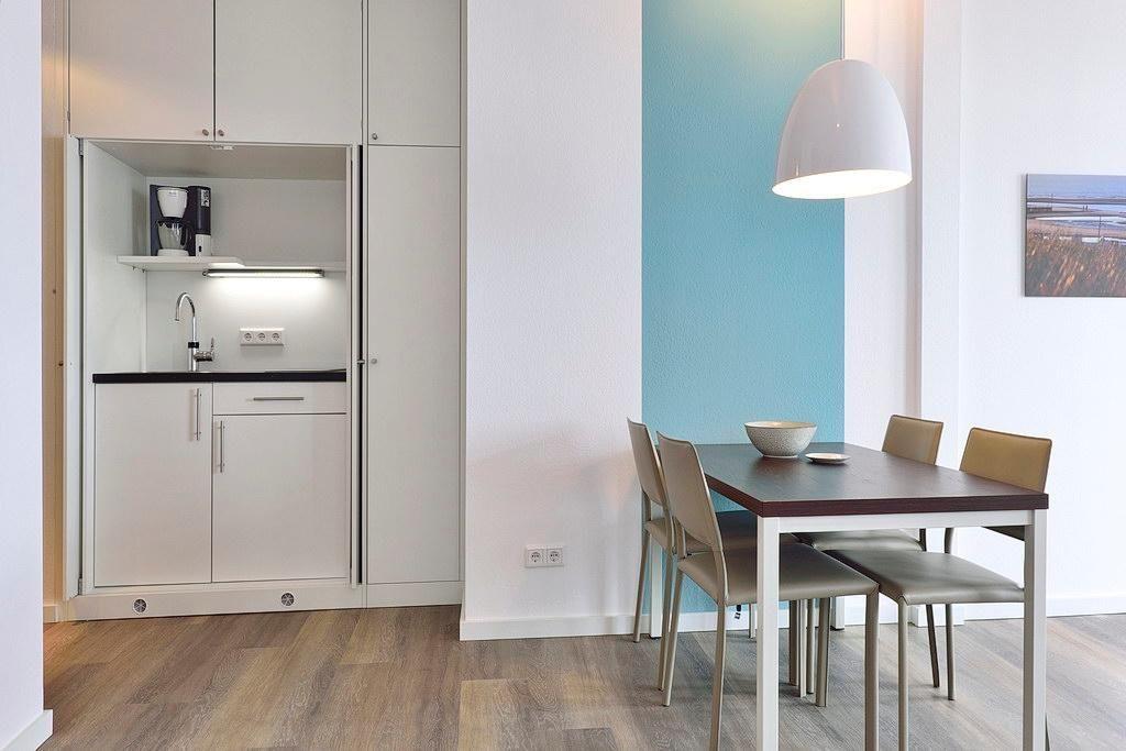 Das barrierearme Apartment ist mit einer kleinen, aber feinen Pantryküche ausgestattet. Diese verfügt u. a. über ein Gefrierfach, eine Kaffeemaschine, einen Toaster und einen Wasserkocher. Im stilvollen Badezimmer befinden sich eine große, begehbare Dusche sowie ein Waschtisch mit Föhn und Kosmetikspiegel.