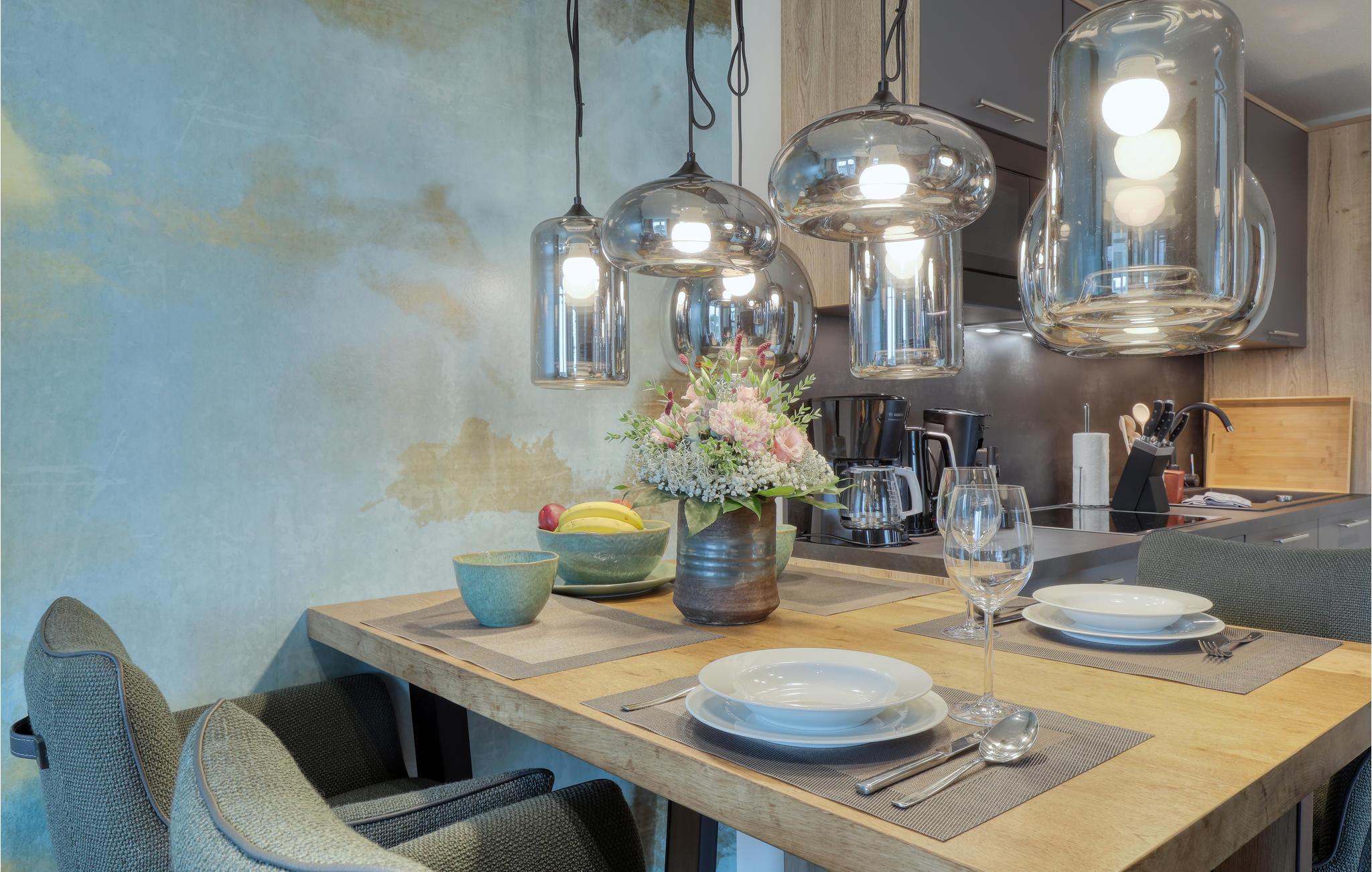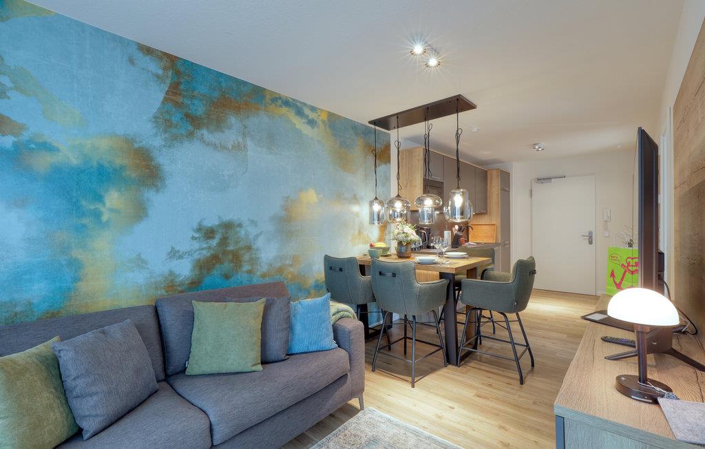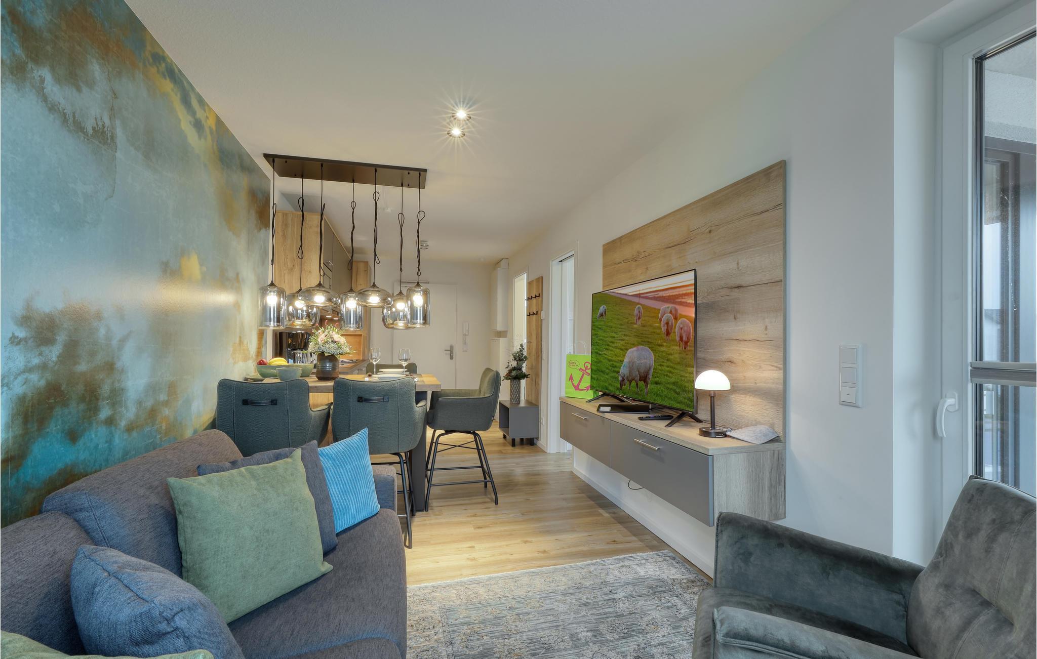 Herzlich willkommen auf Nordstrand, einer traumhaften Halbinsel an der schleswig-holsteinischen Nordseeküste im UNESCO Weltnaturerbe Wattenmeer. Das moderne Haus mit mehreren Ferienwohnungen ist ein wahres Juwel inmitten der Natur, die Lage direkt hinter dem Deich lässt das Herz eines jeden Nordseefans höherschlagen. Der moderne maritime Ausdruck der exklusiven Ferienwohnung versetzt Sie sofort in Urlaubsstimmung. Großzügige Fensterfronten lassen viel Tageslicht herein und bieten einen atemberaubenden Blick auf die umliegende Landschaft, den Sie schon beim Aufwachen genießen können. Mit seinem Fokus auf Nachhaltigkeit ist das Ferienhaus der ideale Ort für Urlauber, die Wert auf Erholung in Einklang mit der Natur legen. Beginnen Sie Ihren Tag mit einem leckeren Frühstück im gemütlichen Wohnzimmer mit offener Küche.