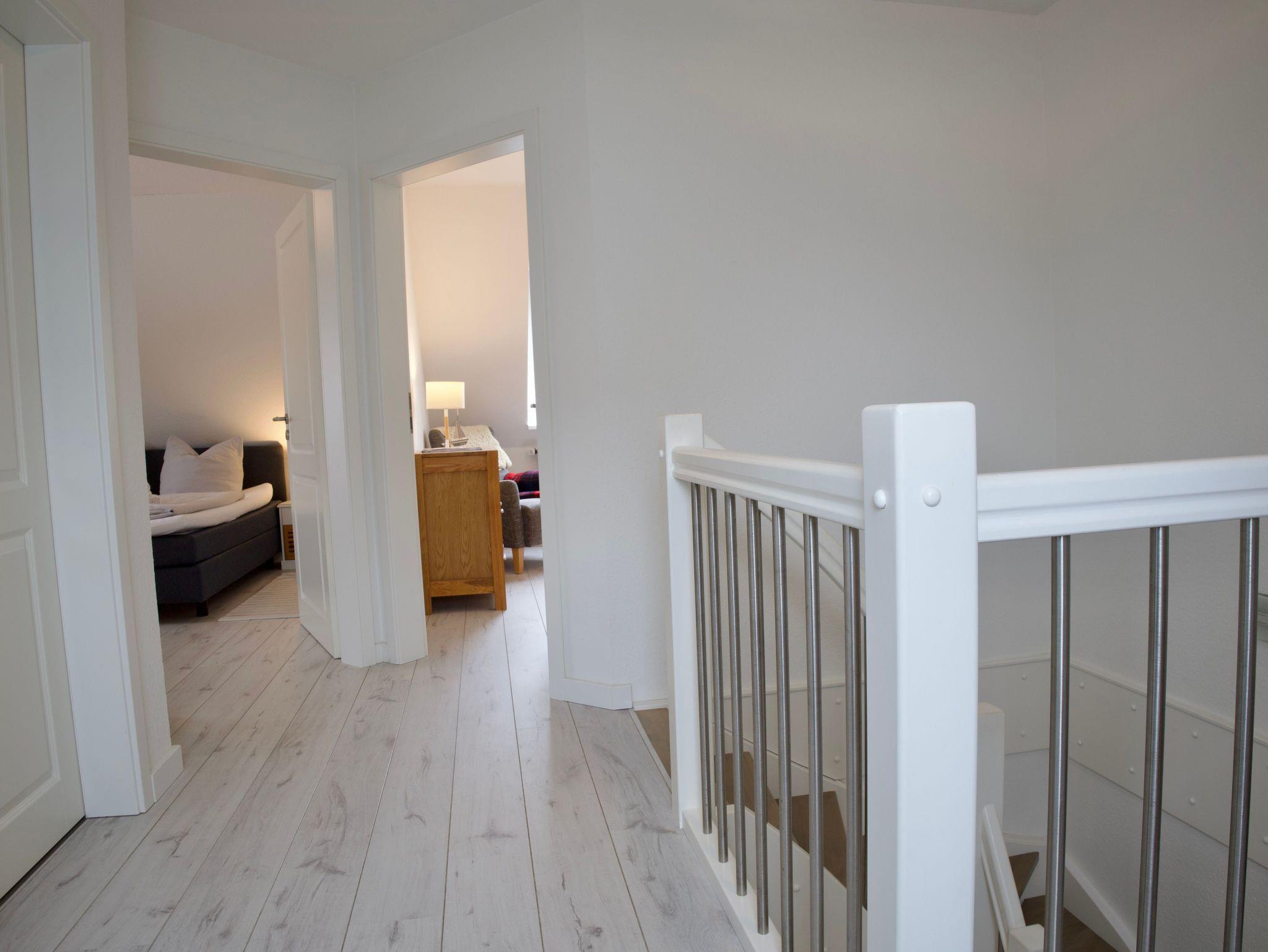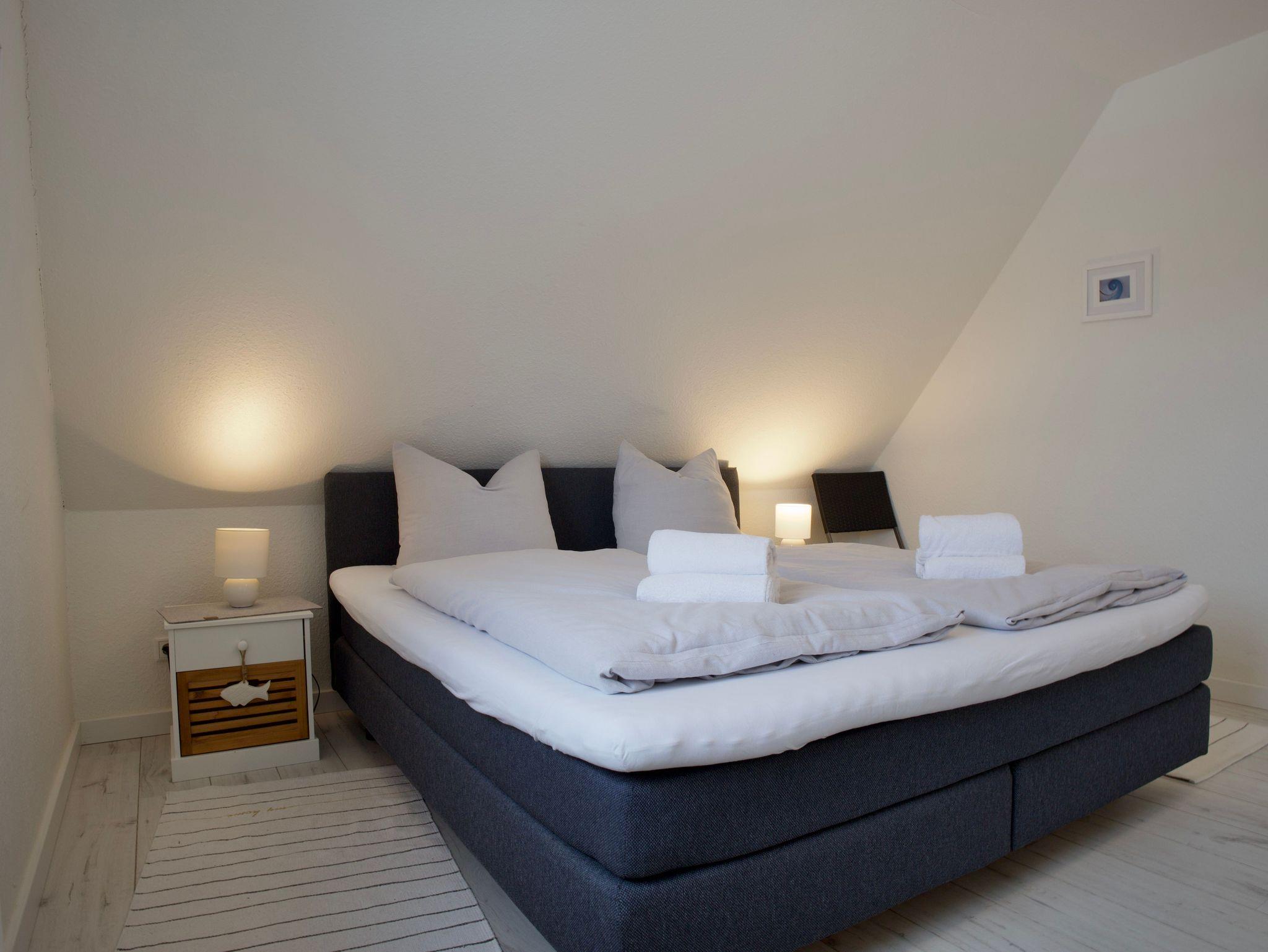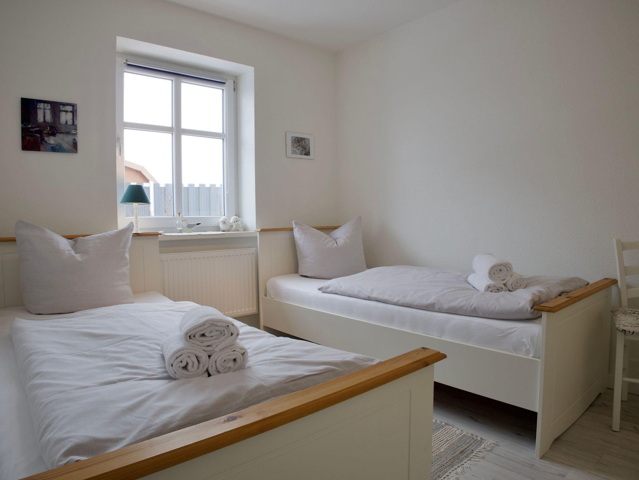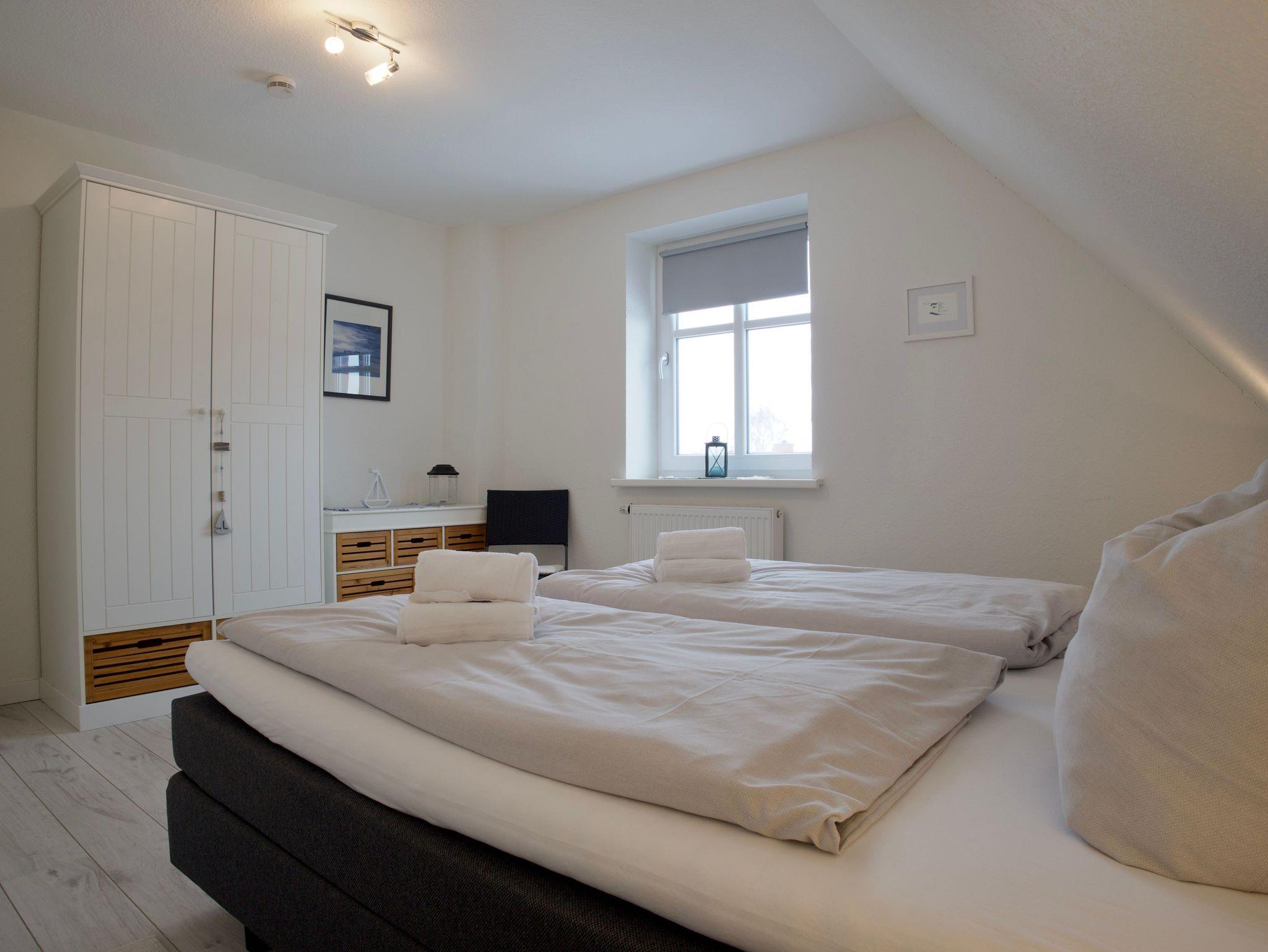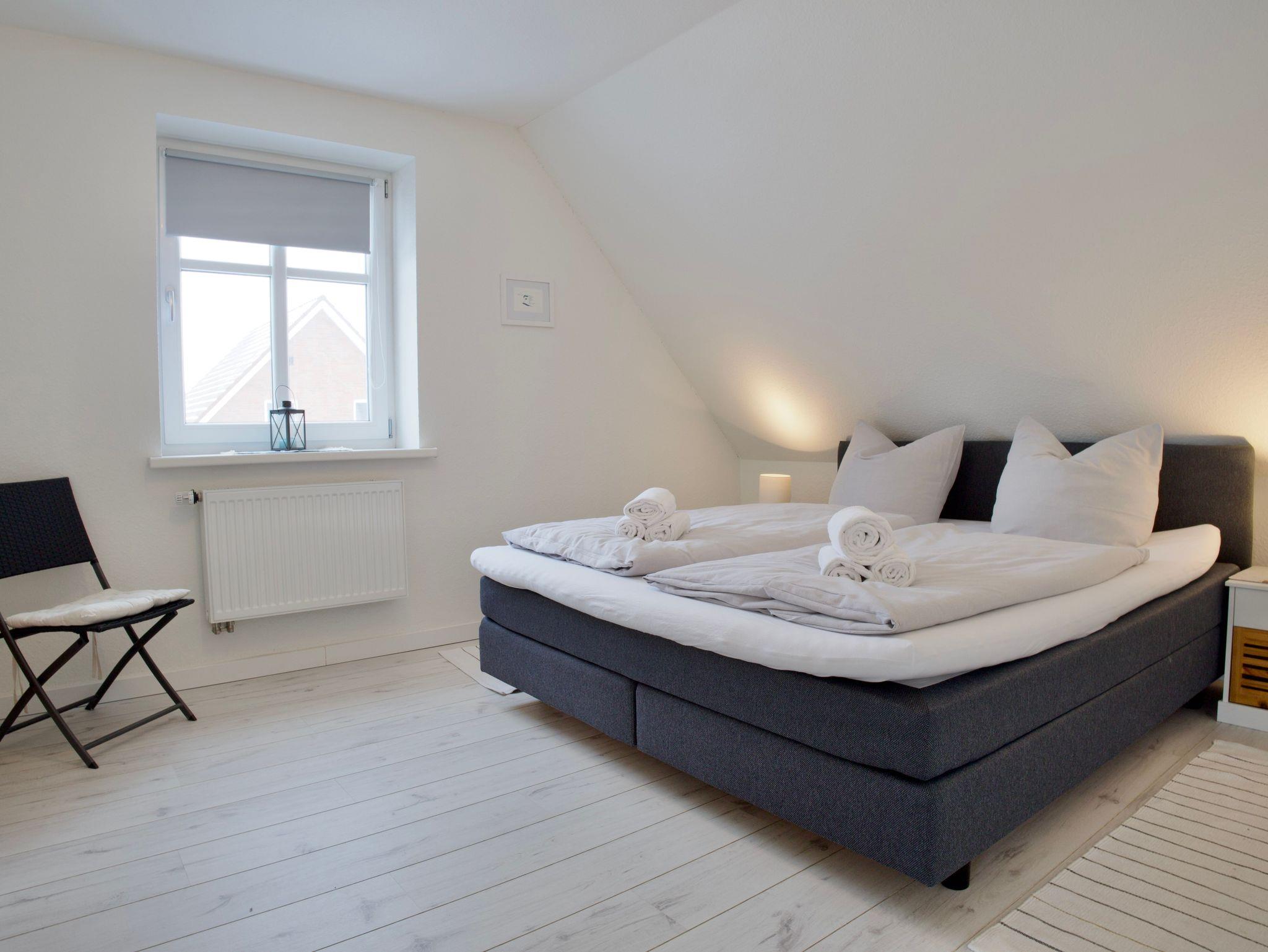 Das Haus verfügt über drei Schlafzimmer. Eines ist mit einem komfortablen Boxspringbett ausgestattet, ein weiteres mit zwei Einzelbetten, das dritte Schlafzimmer bietet ein Einzelbett. Alle Schlafräume sind hell, klar gestaltet und bieten ruhige Rückzugsorte für erholsame Nächte.