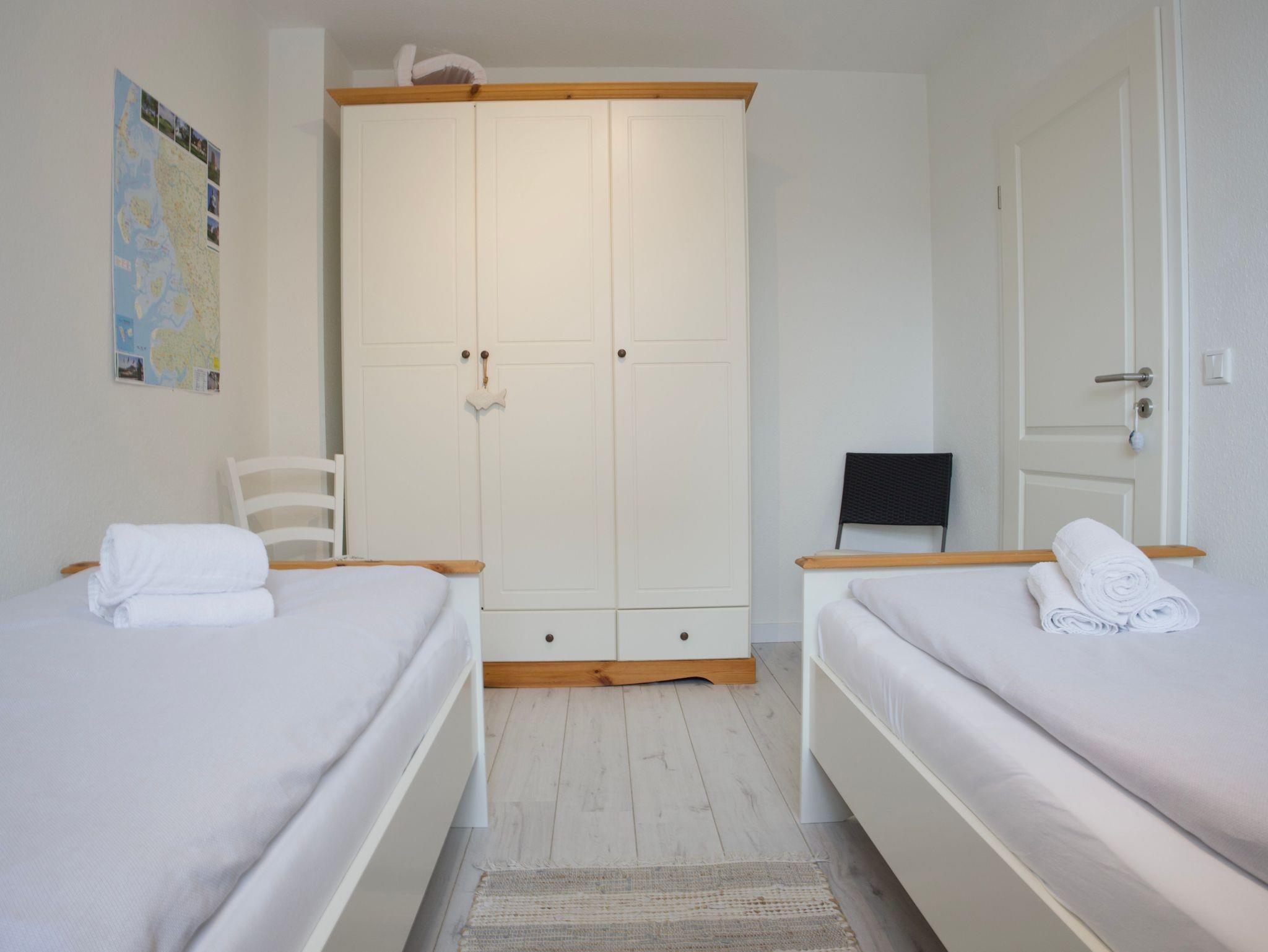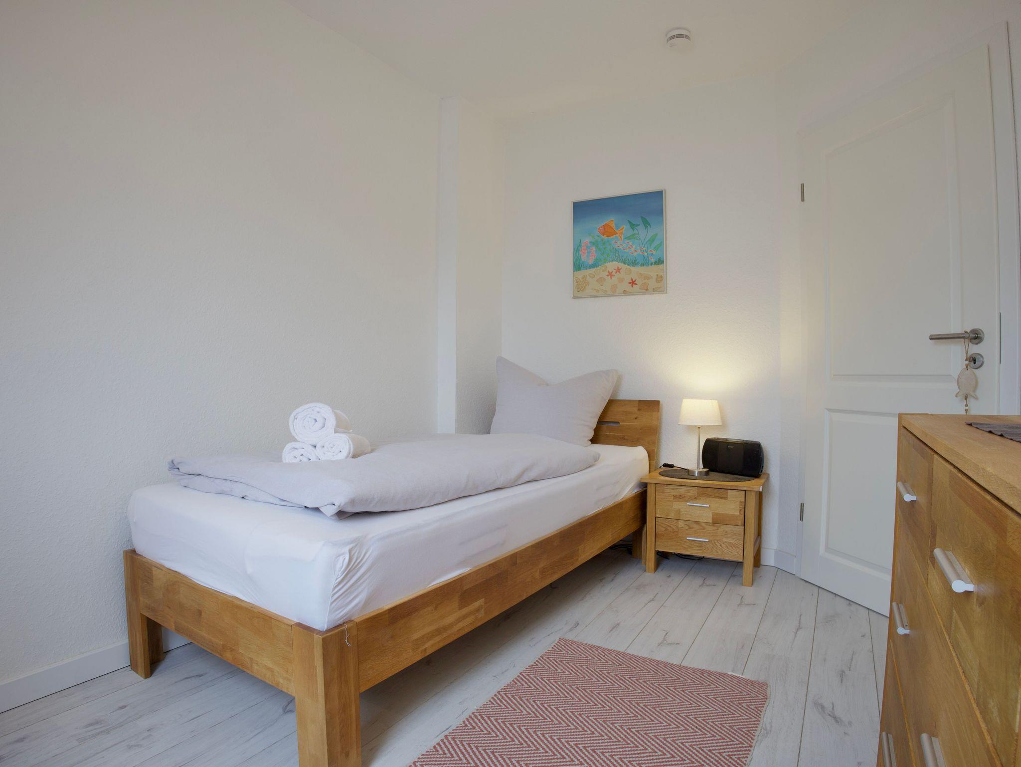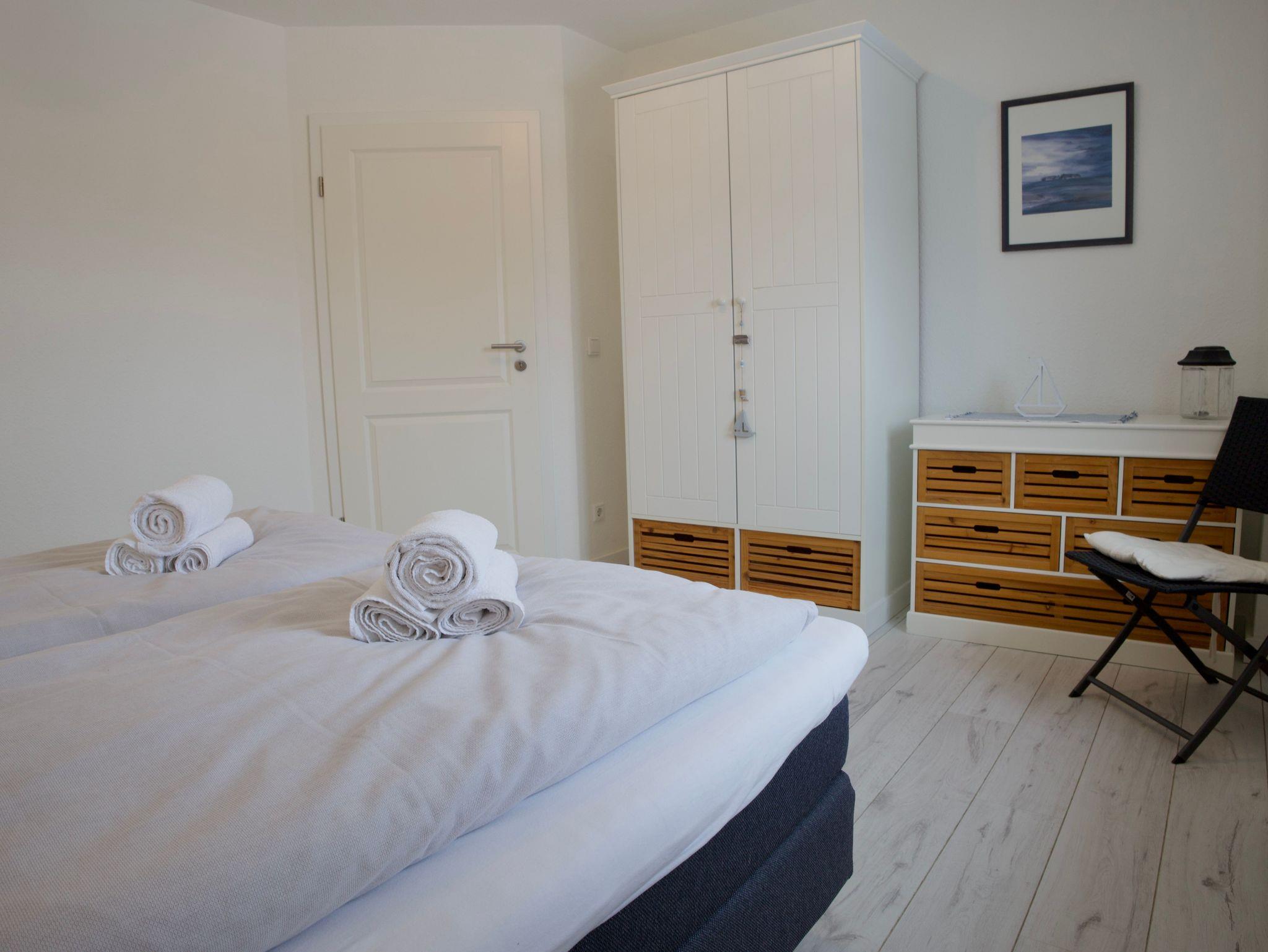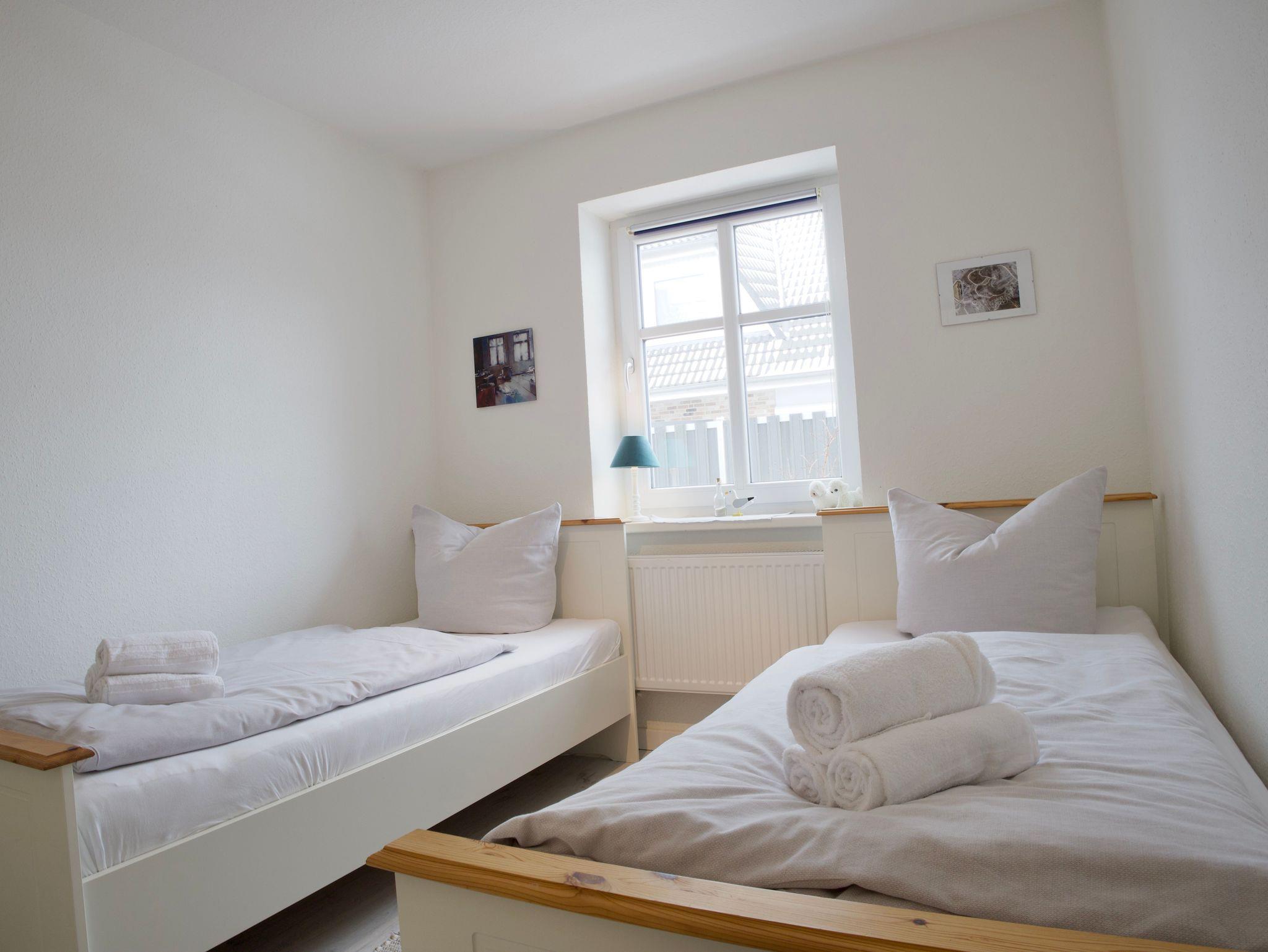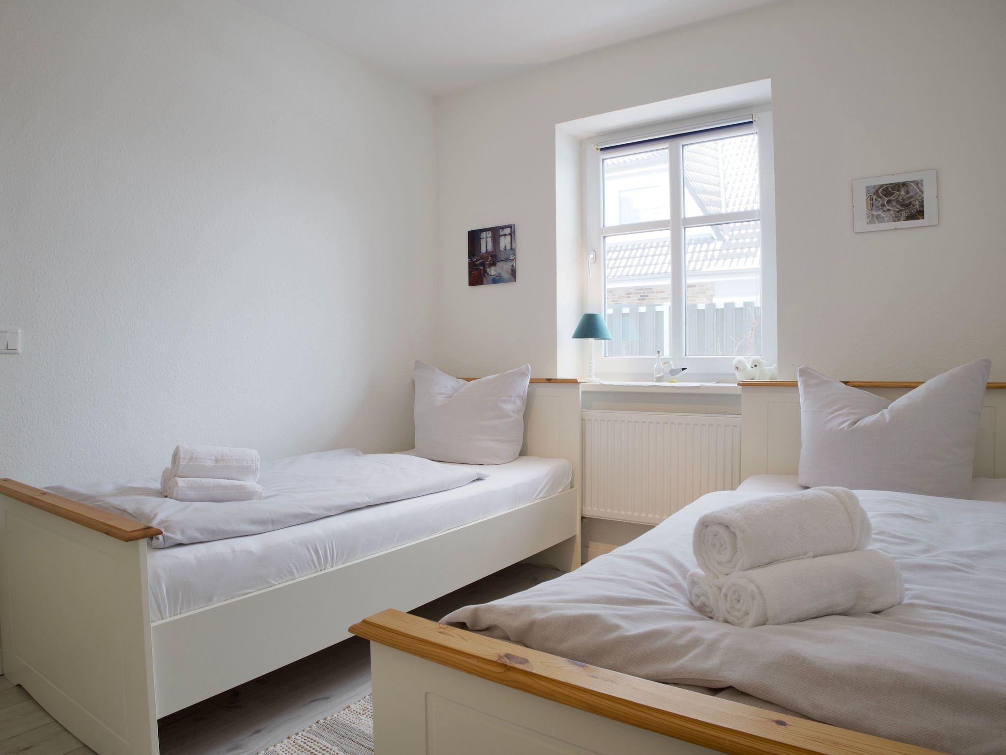 Das Haus verfügt über drei Schlafzimmer. Eines ist mit einem komfortablen Boxspringbett ausgestattet, ein weiteres mit zwei Einzelbetten, das dritte Schlafzimmer bietet ein Einzelbett. Alle Schlafräume sind hell, klar gestaltet und bieten ruhige Rückzugsorte für erholsame Nächte.