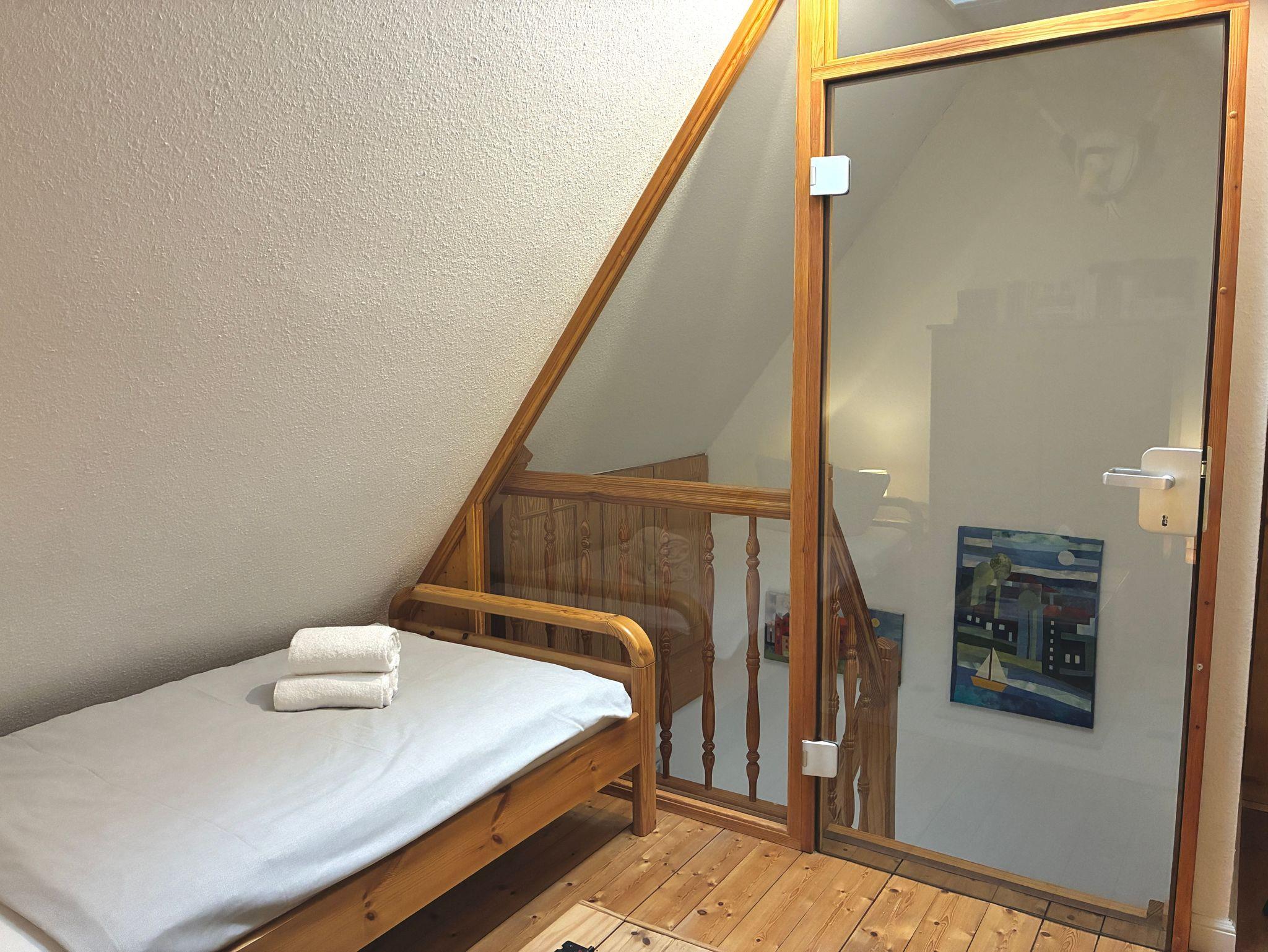 Der Wohn- und Essbereich bildet das Herzstück des Hauses und bietet Raum für gemeinsame Zeit. TV und WLAN stehen zur Verfügung. Im ersten Obergeschoss befinden sich zwei Schlafzimmer, eines mit Doppelbett und eines mit Einzelbett. Im oberen Geschoss steht ein weiteres Schlafzimmer mit zwei Einzelbetten zur Verfügung.
