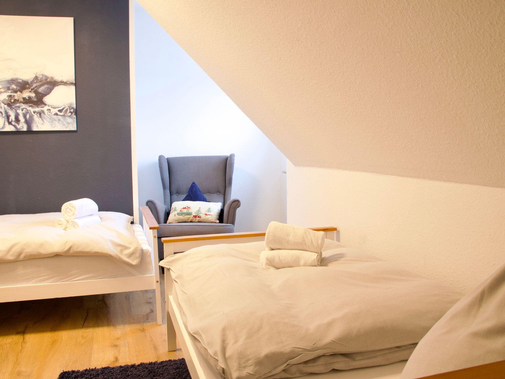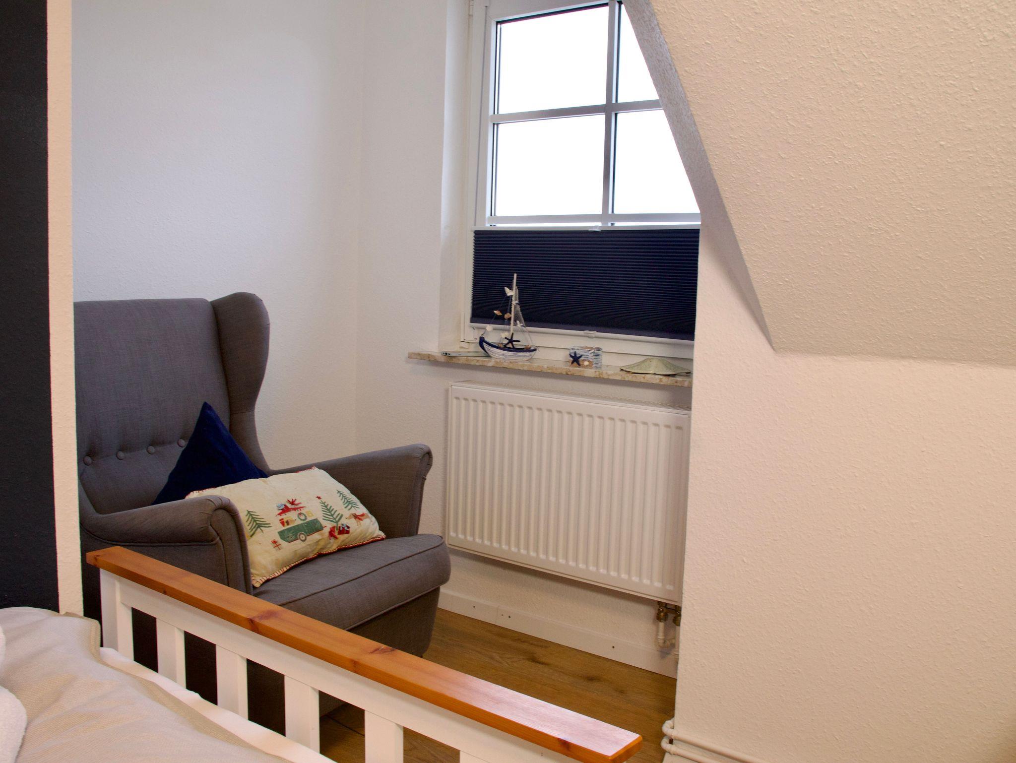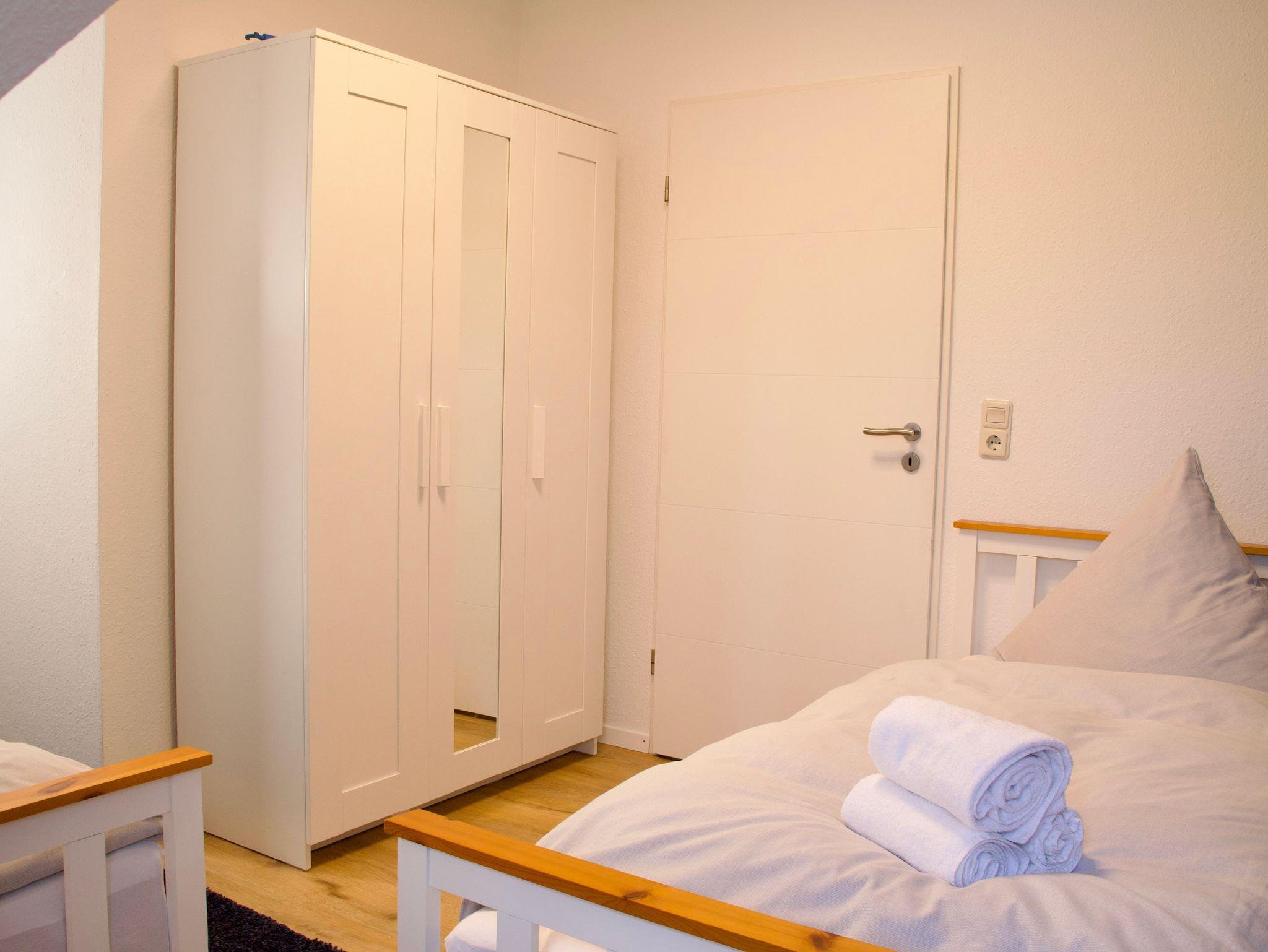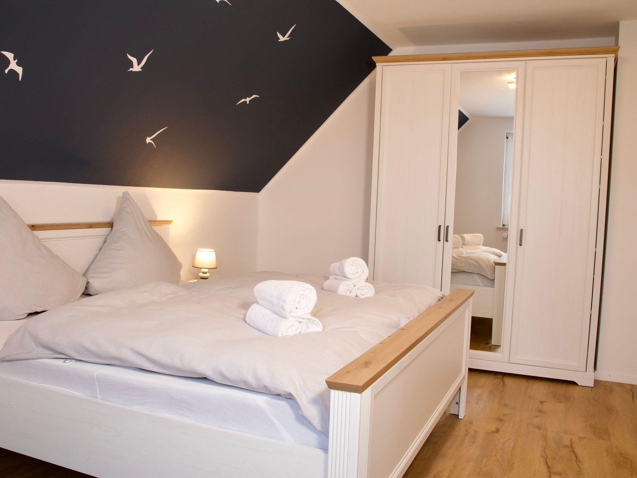 Im Obergeschoss befinden sich zwei Schlafzimmer sowie das Badezimmer. Ein Schlafzimmer ist mit einem Doppelbett in der Größe 180 x 200 Zentimeter ausgestattet, das zweite verfügt über zwei Einzelbetten mit den Maßen 90 x 200 Zentimeter. Das moderne Badezimmer bietet eine Walk-In-Dusche und ergänzt das Raumangebot zeitgemäß und funktional.