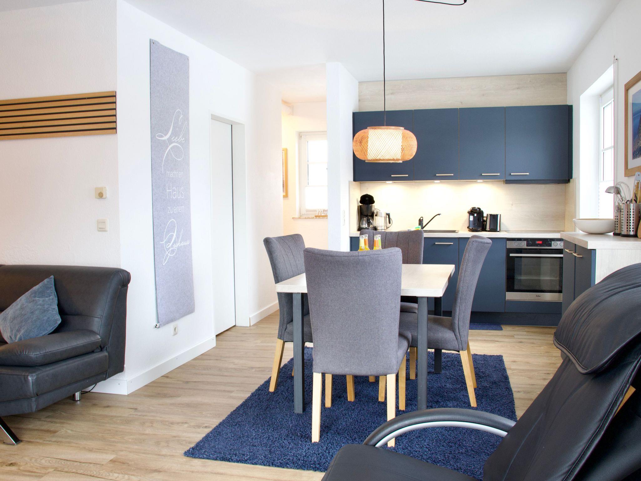 Die Küche ist modern und funktional ausgestattet und bietet alles, was für die Selbstversorgung benötigt wird. Eine Spülmaschine, eine Gefriermöglichkeit sowie eine Kaffeemaschine stehen zur Verfügung. Ein großes Fenster mit Blick auf den Deich unterstreicht den offenen, hellen Charakter des Raumes. Zusätzlich befindet sich im Erdgeschoss ein Gäste-WC.