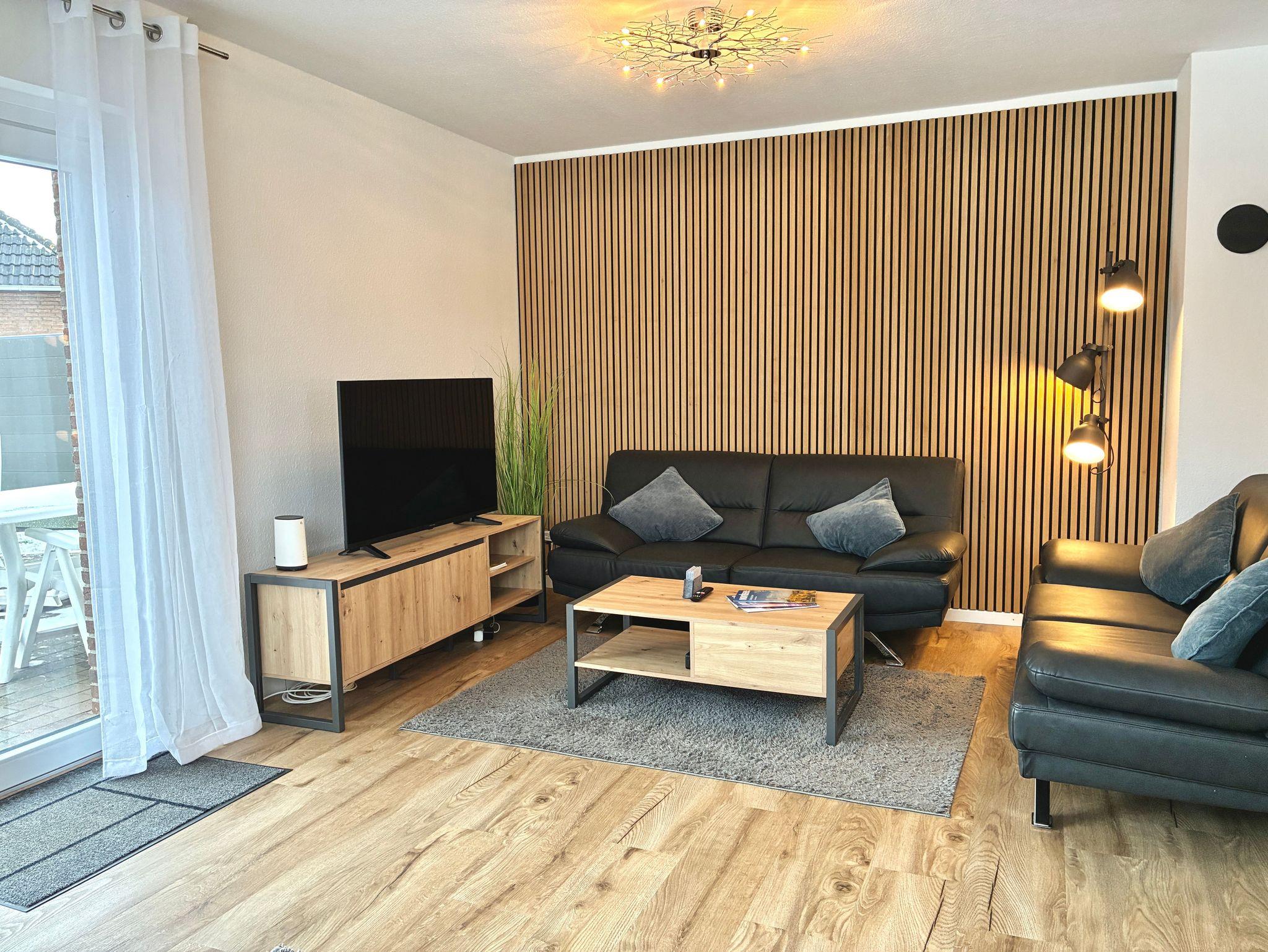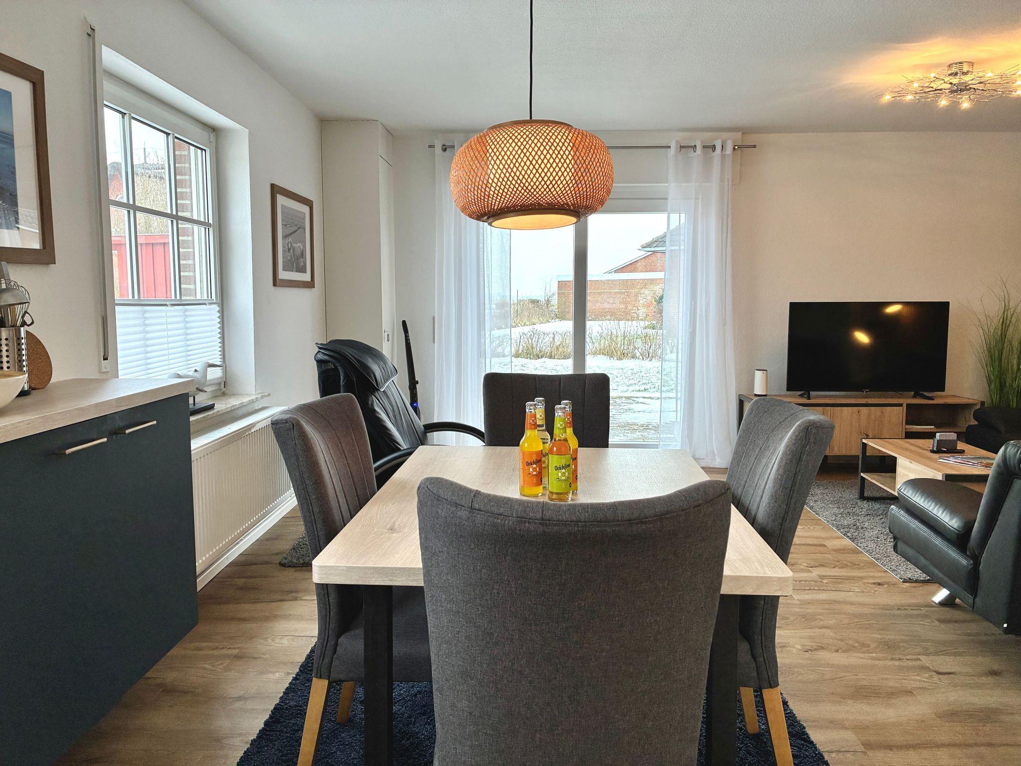 Im Erdgeschoss befindet sich die großzügige Wohnküche mit offenem Wohn- und Essbereich. Große Fenster sowie der direkte Zugang zur Terrasse sorgen für viel Tageslicht und eröffnen den Blick ins Grüne sowie auf den Deich. Der Wohnbereich ist mit moderner Holzvertäfelung gestaltet und vermittelt eine warme, zugleich stilvolle Atmosphäre. Ein Smart-TV ergänzt den Wohnbereich und lädt zu entspannten Abenden ein.