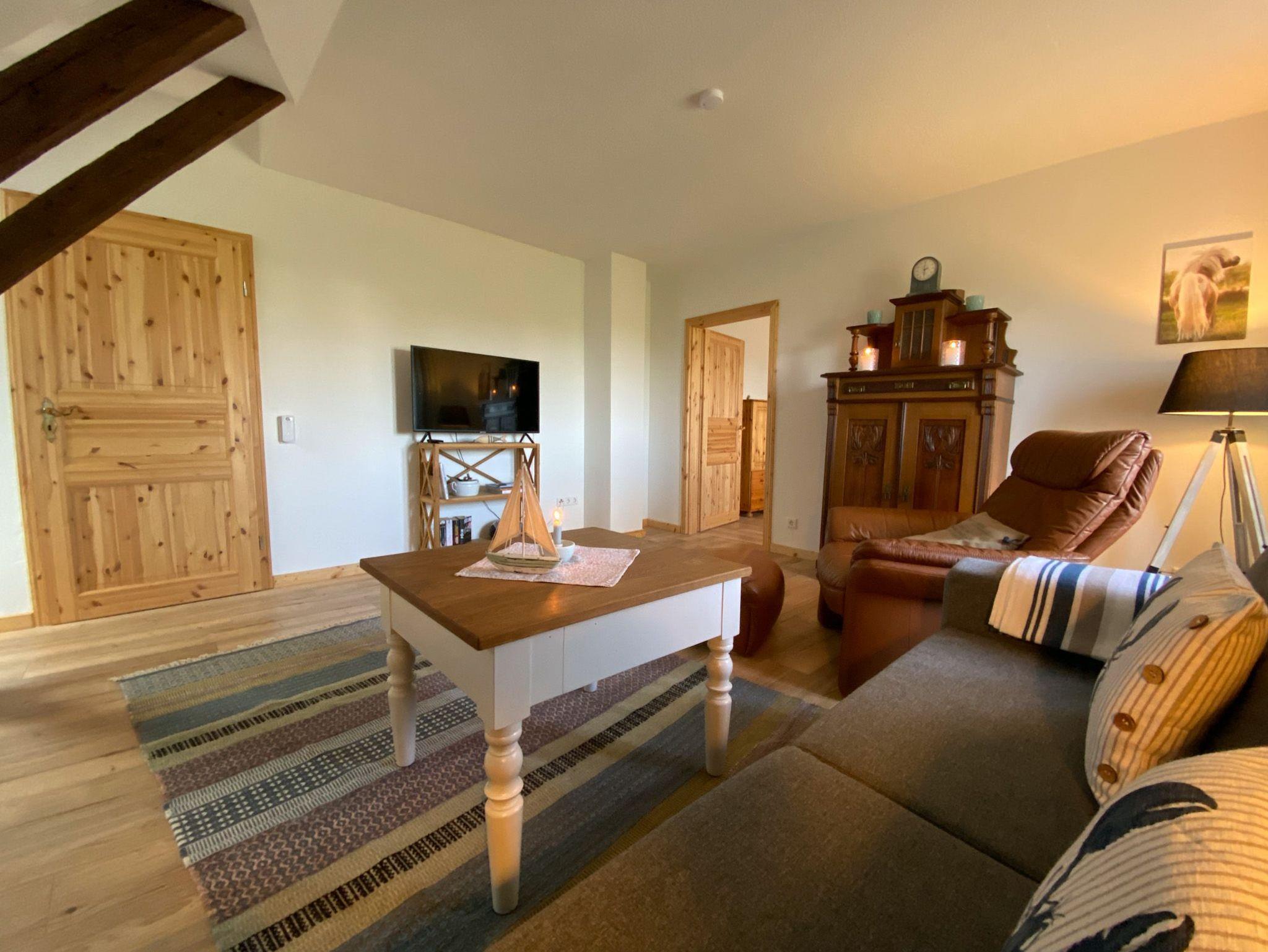 Ihr betretet die Wohnung hin zum Wohnzimmer im gemütlichen Landhausstil, mit einer durch