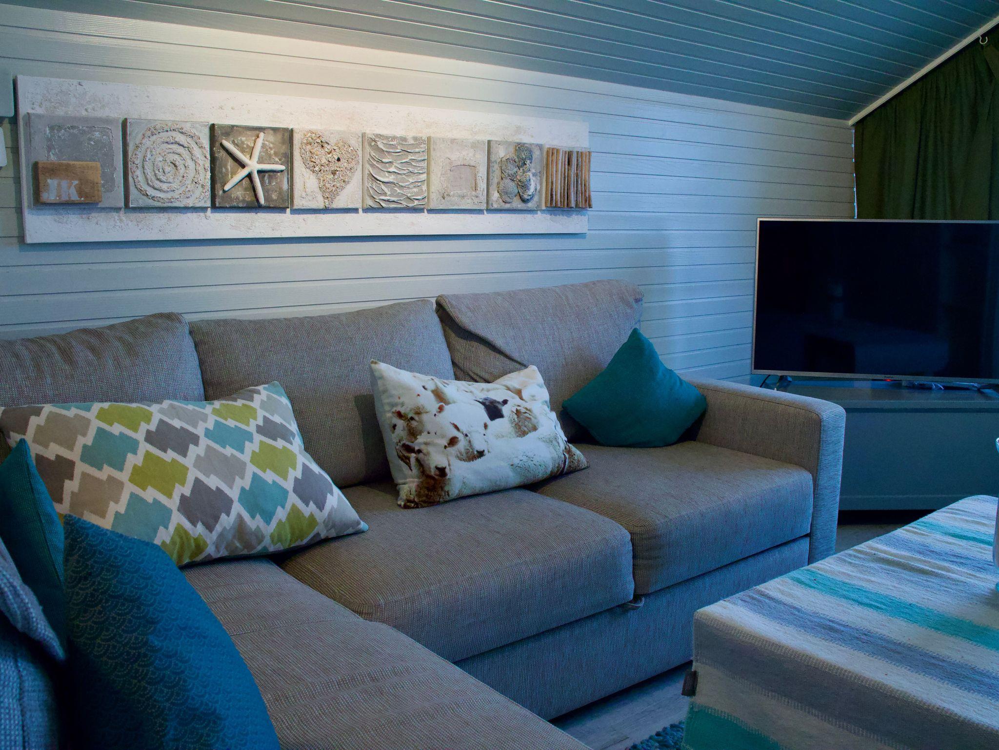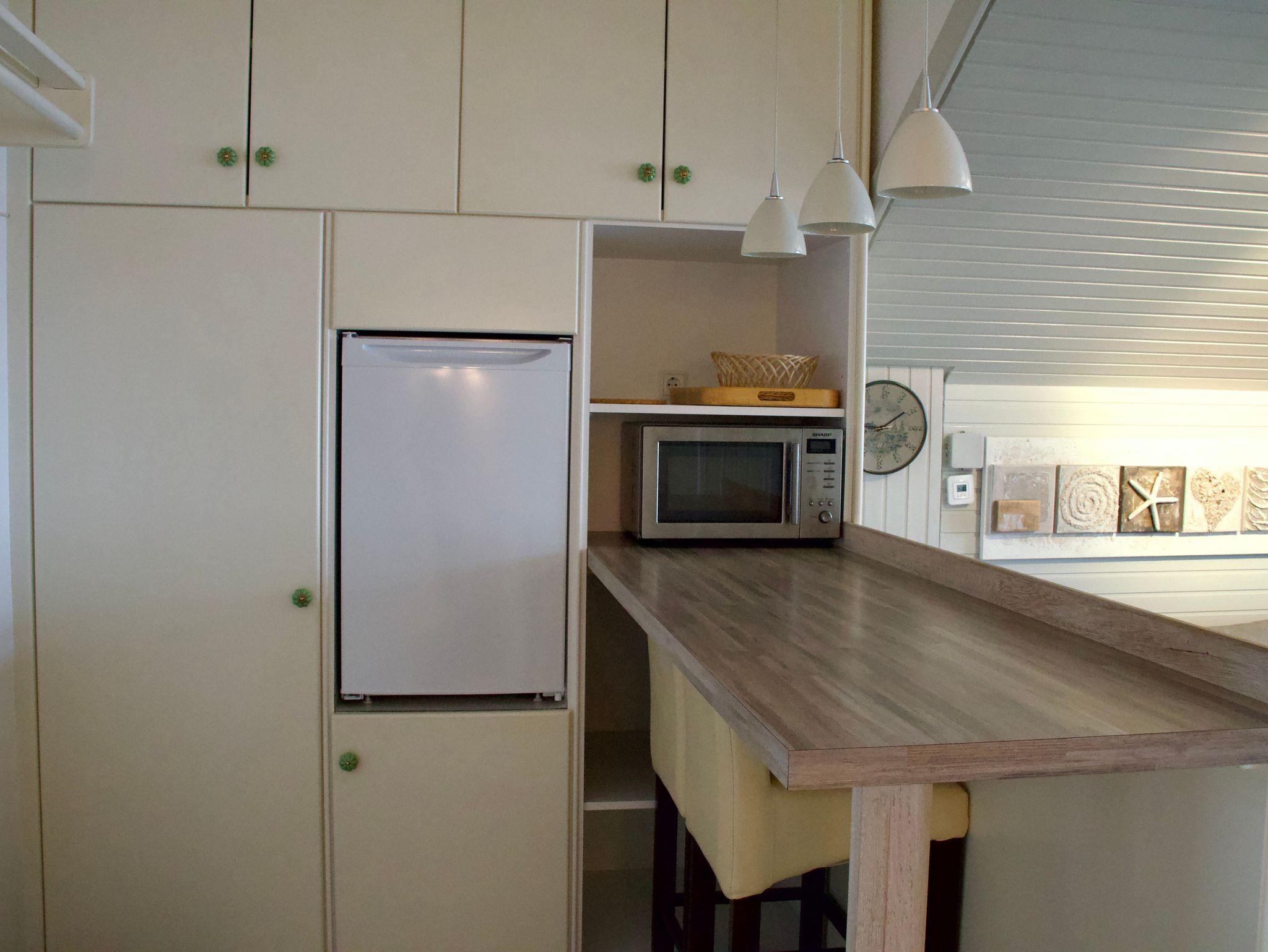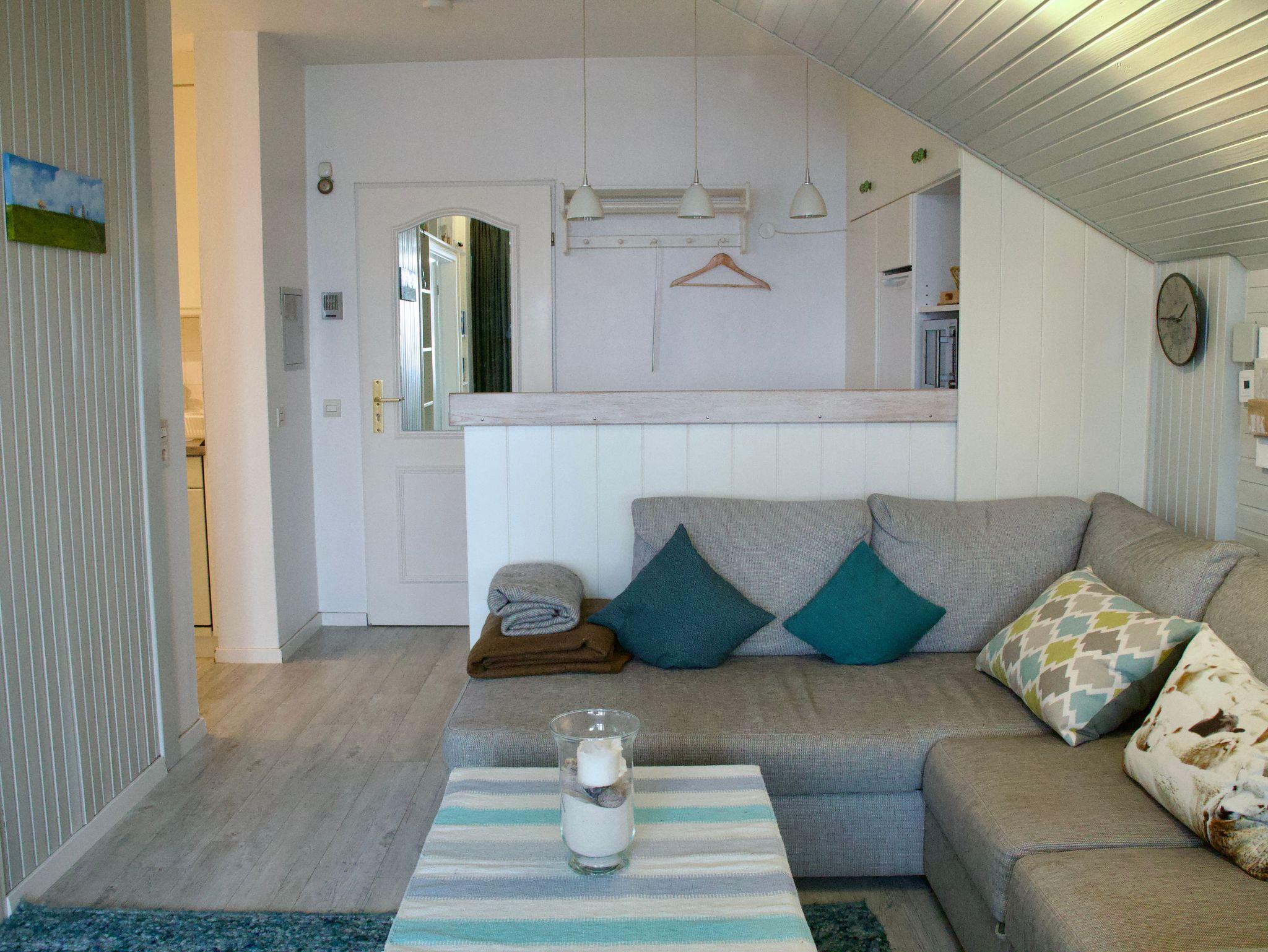 Wohn- und Schlafzimmer können durch eine verglaste Flügeltür miteinander verbunden werden und ermöglichen eine flexible Nutzung der Räume. Das Ecksofa im Wohnbereich kann bei Bedarf als zusätzliche Schlafgelegenheit genutzt werden und verfügt über eine Liegefläche von etwa 180 × 200 Zentimetern. Die Küchennische ist funktional gestaltet und vollständig eingerichtet. Eine Kaffeemaschine sowie eine Gefriermöglichkeit stehen zur Verfügung und unterstützen die Selbstversorgung im Urlaub.