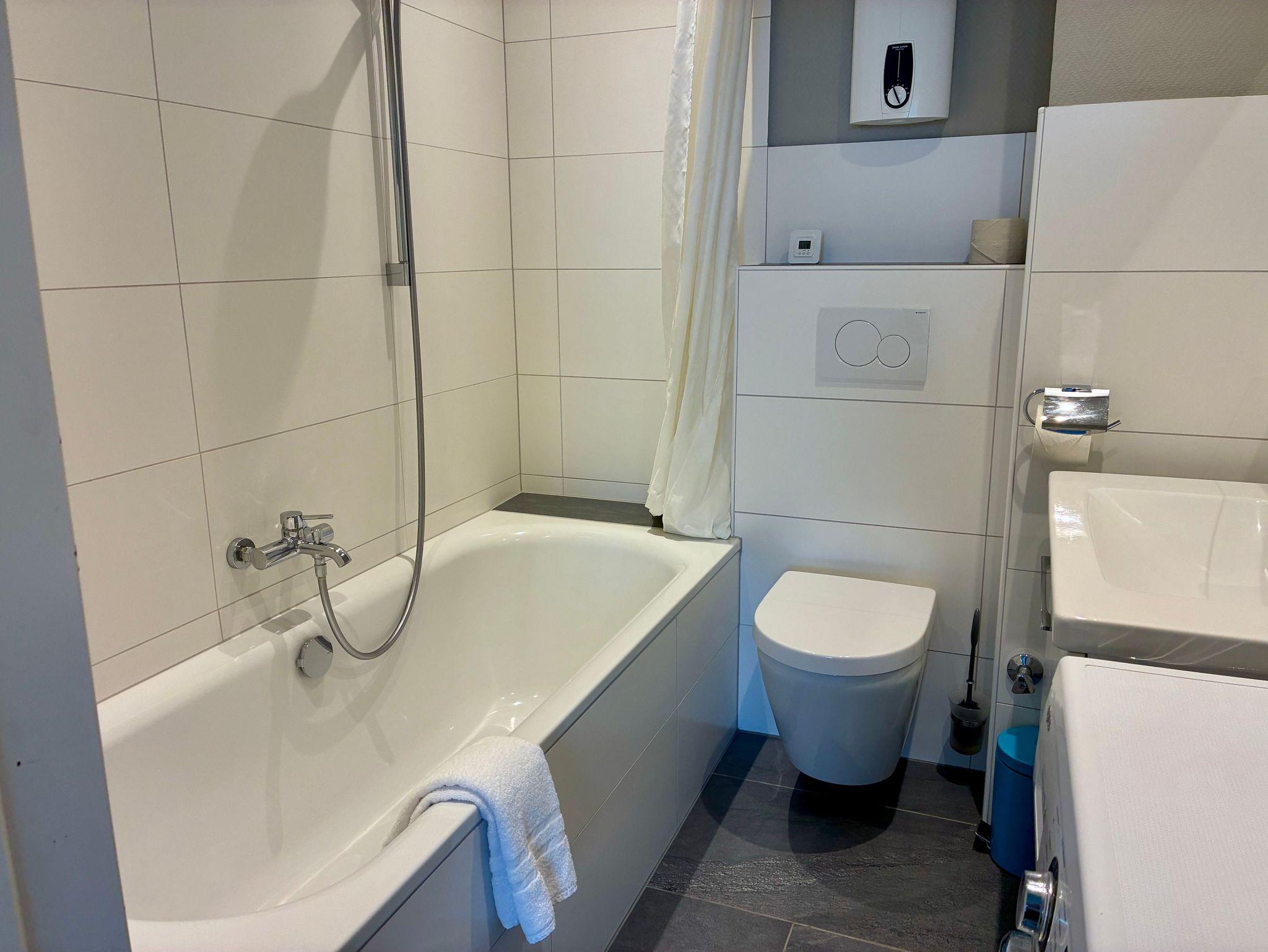 Das Badezimmer ist mit einer Badewanne mit Duschmöglichkeit sowie einer Waschmaschine ausgestattet und bietet auch bei längeren Aufenthalten zusätzlichen Komfort. WLAN steht kostenfrei zur Verfügung, ebenso ein Smart-TV und eine Stereoanlage. Haustiere sind in dieser Wohnung herzlich willkommen.
