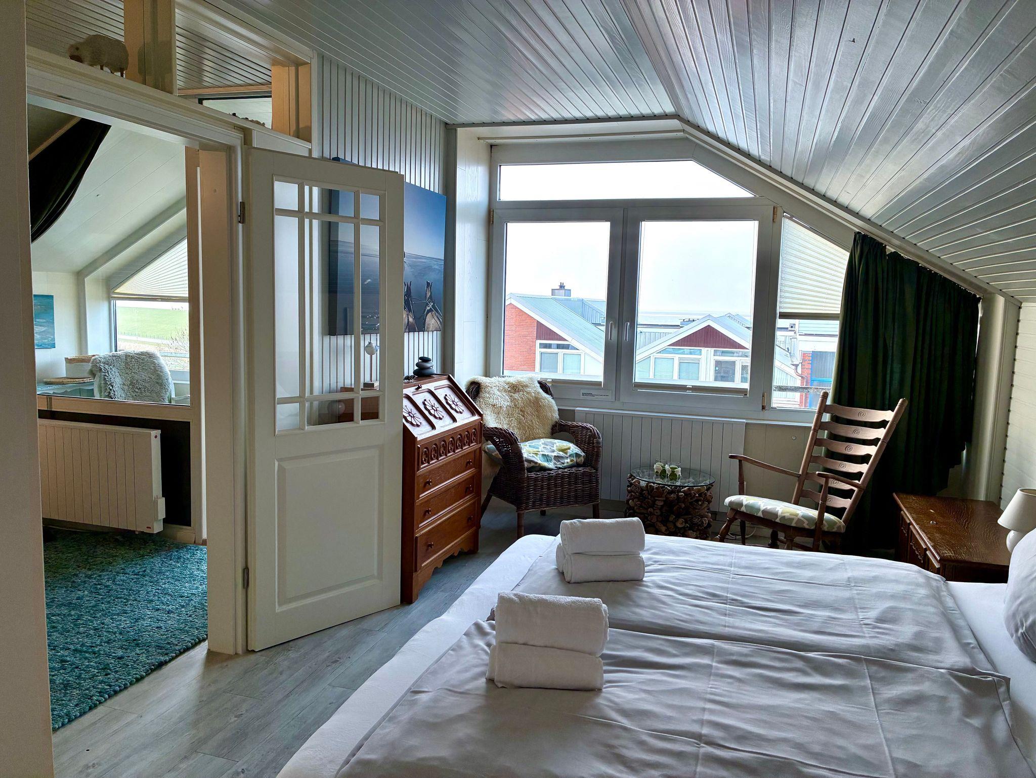 Die helle und liebevoll eingerichtete Wohnung greift den Charakter der nordfriesischen Küstenlandschaft auf und wirkt ruhig und einladend. Viele Fenster sorgen für eine freundliche Atmosphäre und lassen viel Tageslicht in die Räume. Eine ruhige Essecke an der Fensterfront bietet einen angenehmen Platz, um den Blick nach draußen schweifen zu lassen.