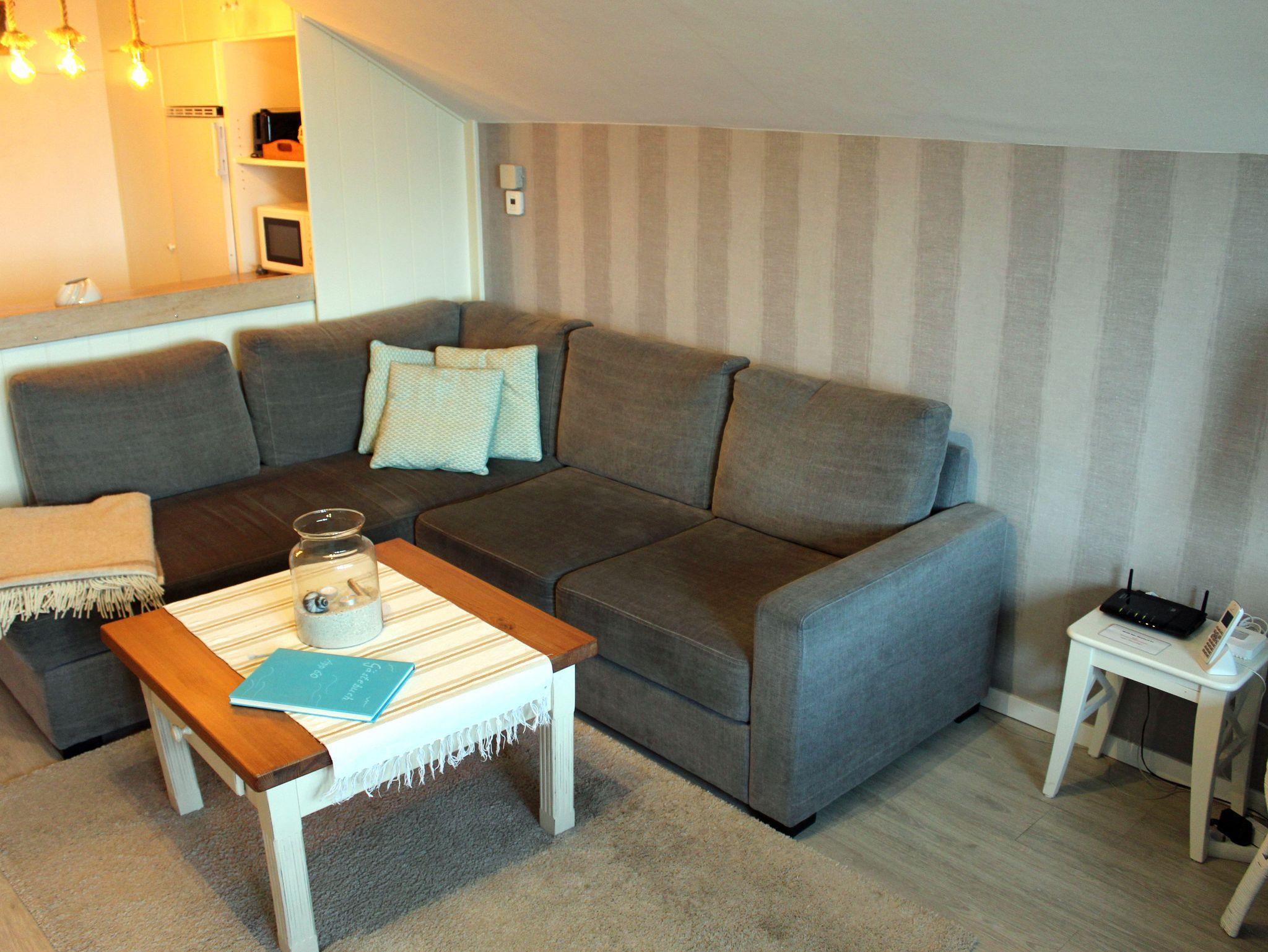 Wohn- und Schlafzimmer können durch das Öffnen einer verglasten Flügeltür mit einander verbunden werden. Das Ecksofa kann als zusätzliche Schlafgelegenheit mit einer Liegefläche von 180x200cm genutzt werden.