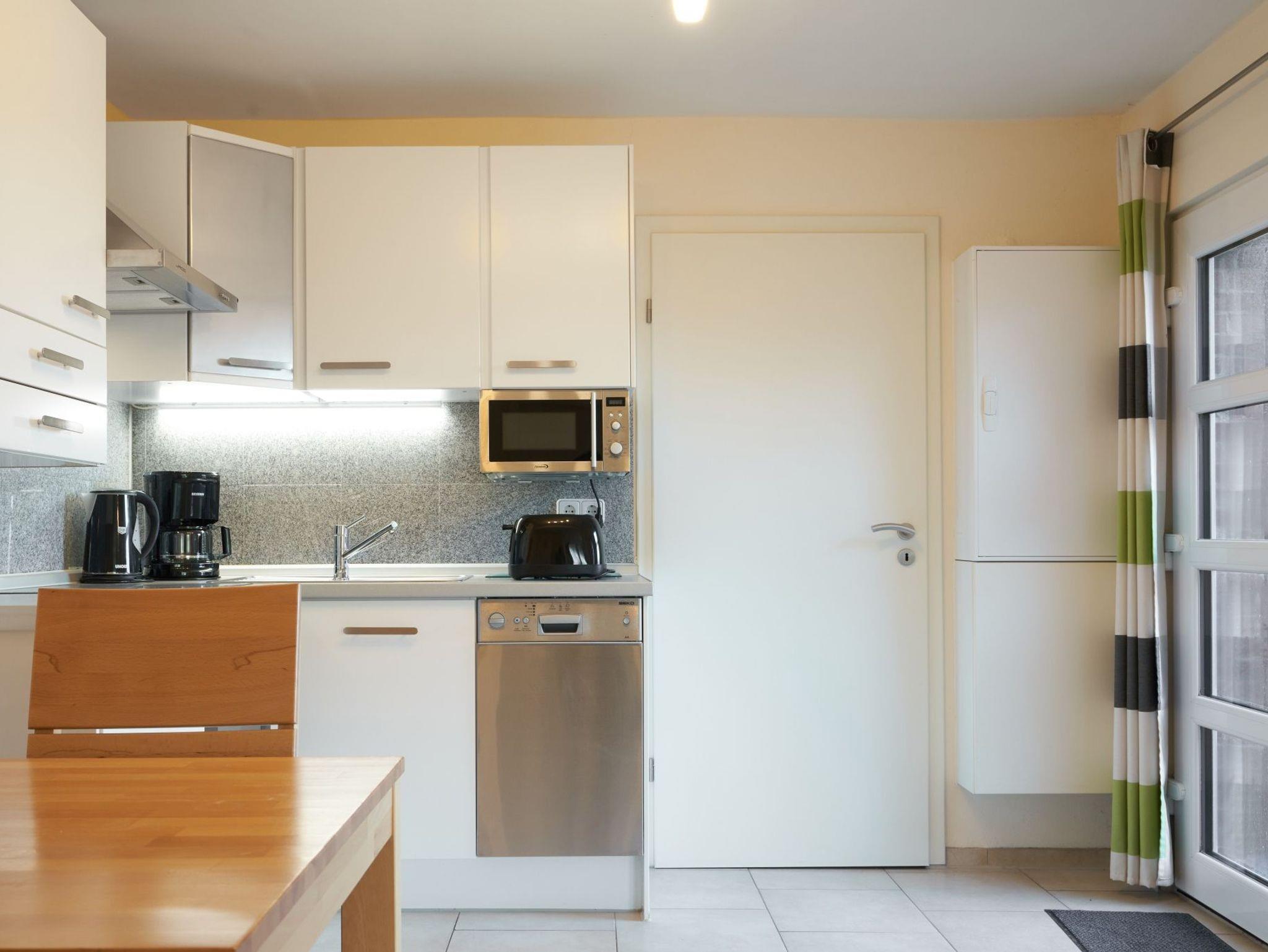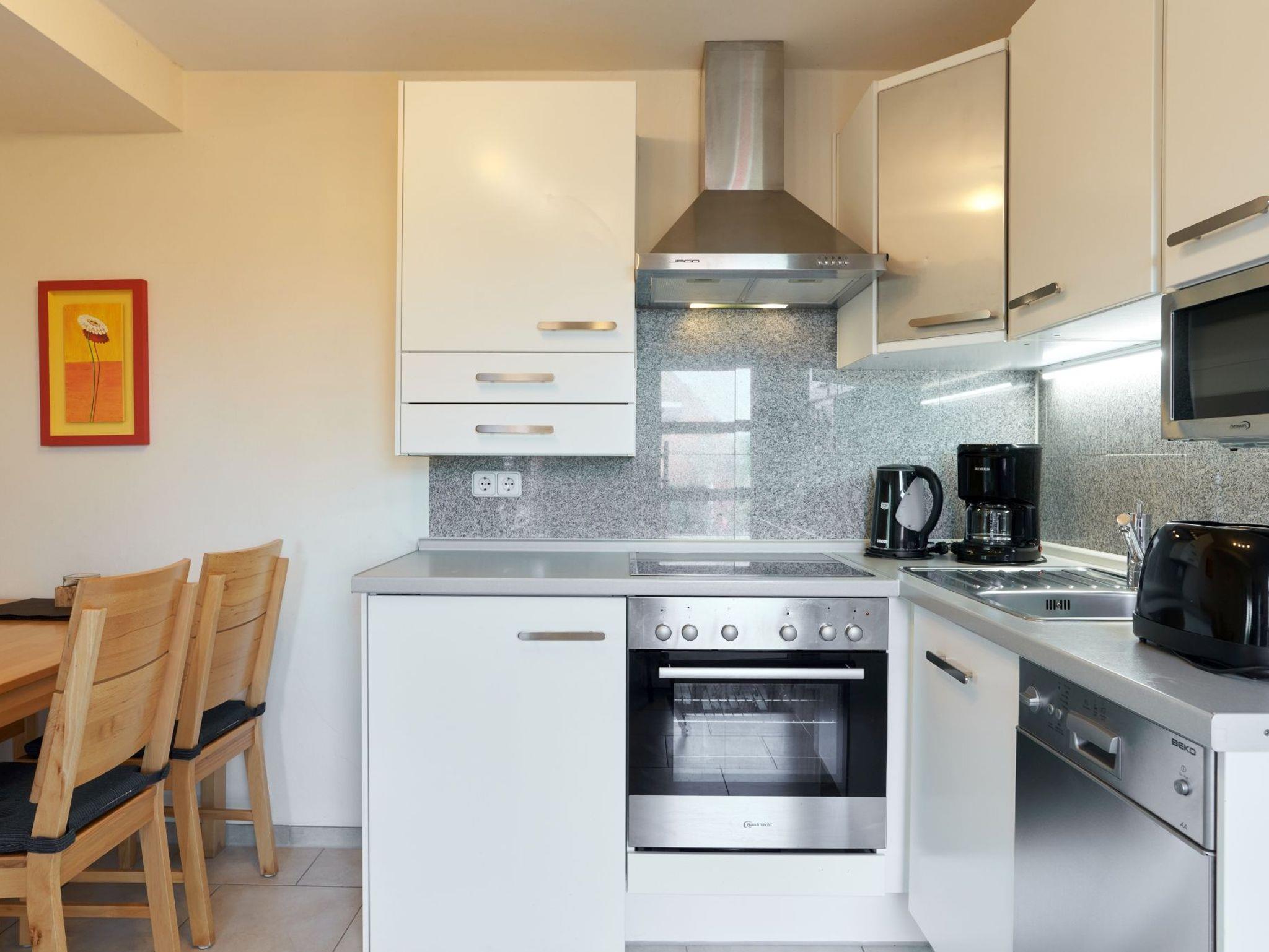 Die Küchenzeile ist hervorragend ausgestattet: Cerankochfeld, Backofen, Geschirrspülmaschine, Mikrowelle und Kaffeemaschine (Filtergröße 4). Der Essbereich und das Duschbad runden das Bild ab.