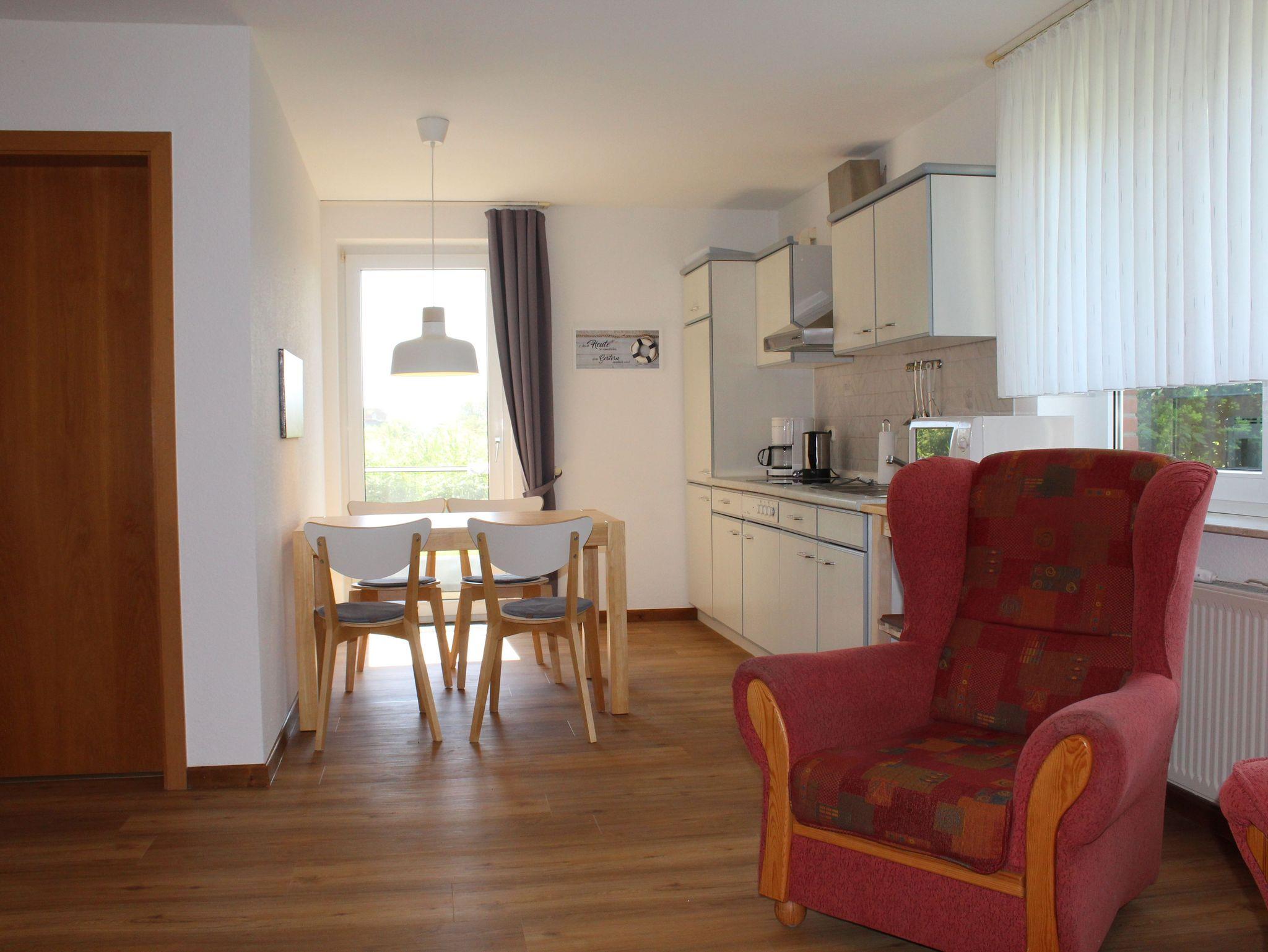 Diese Wohnung ist ca. 45 qm groß und liegt im Erdgeschoss mit anschließender Terrasse. Sie ist ausgestattet für 2 mit einem Schlafzimmer mit Doppelbett (1,8 x 2 m) einem Wohn- und Esszimmer mit Pantryküche, sowie einem Duschbad. Die Terrasse ist vollmöbliert inkl. Strandkorb und direkt von der Wohnung aus zu betreten. Parkplätze gibt es ausreichend direkt am Haus.