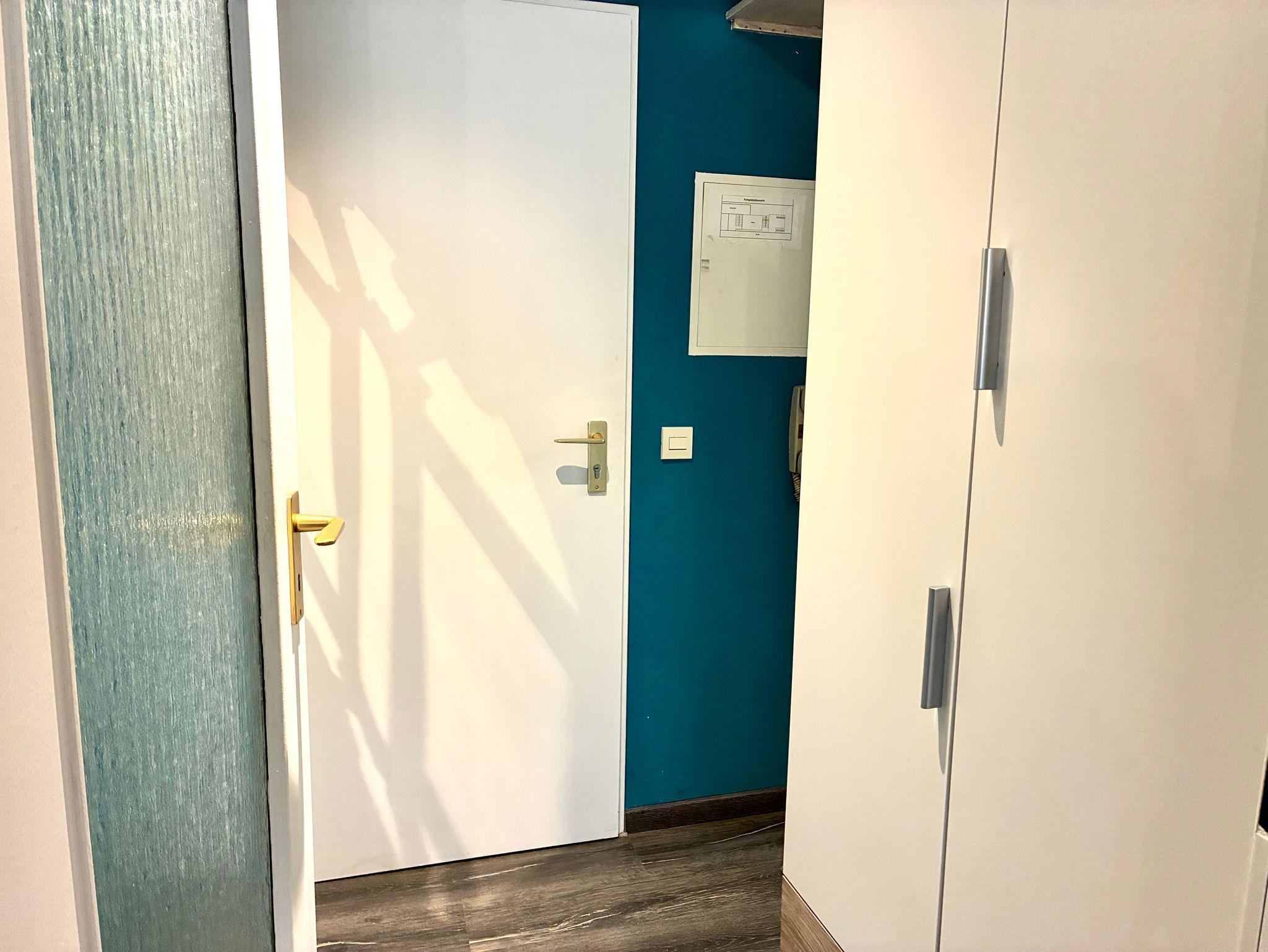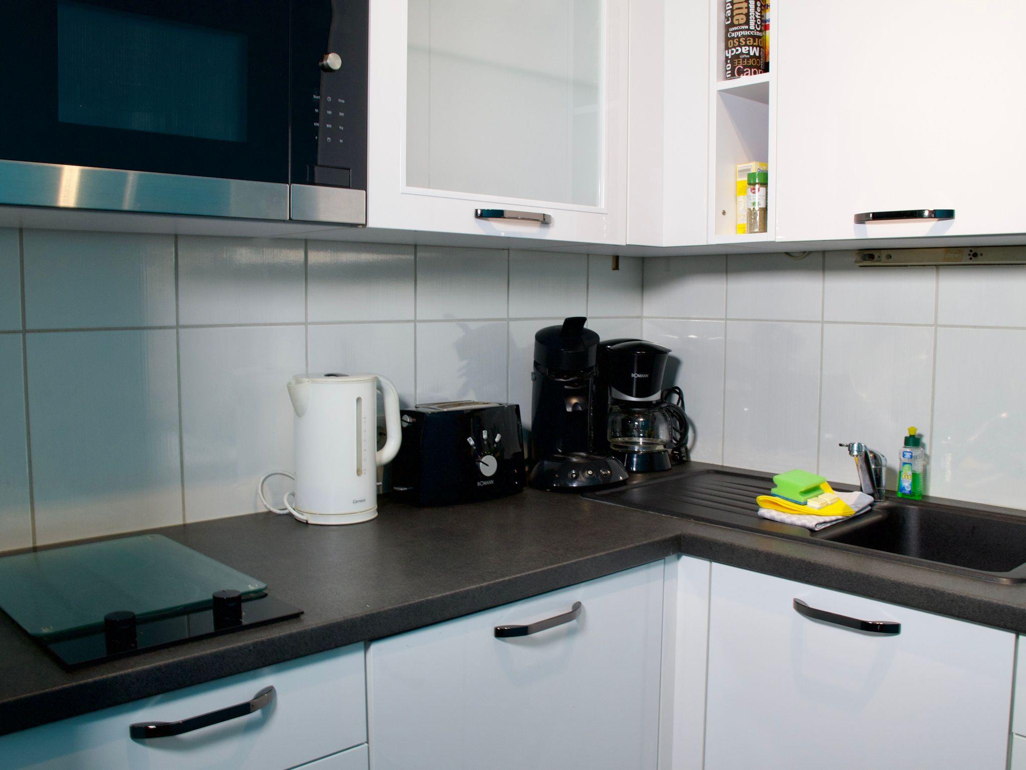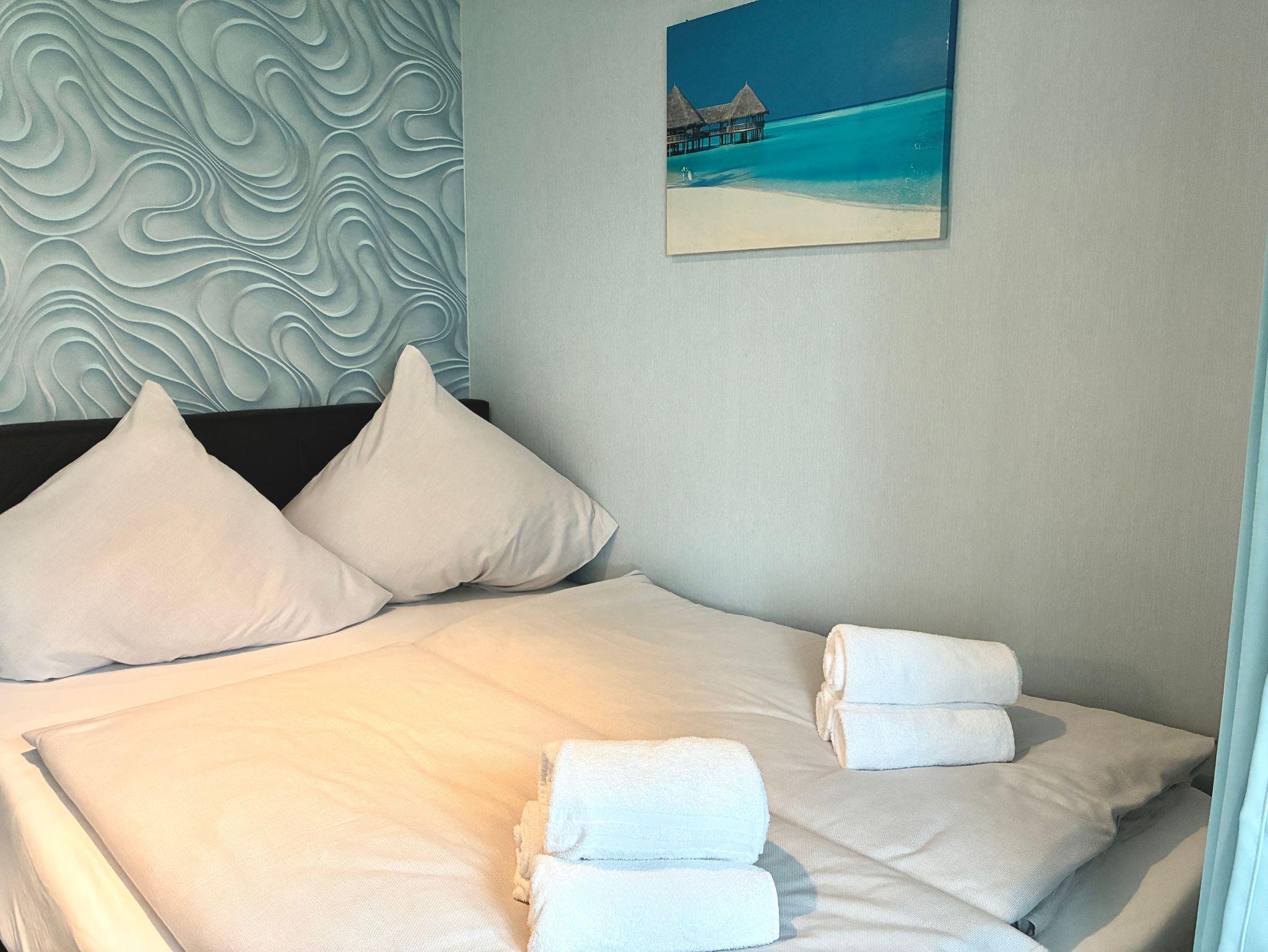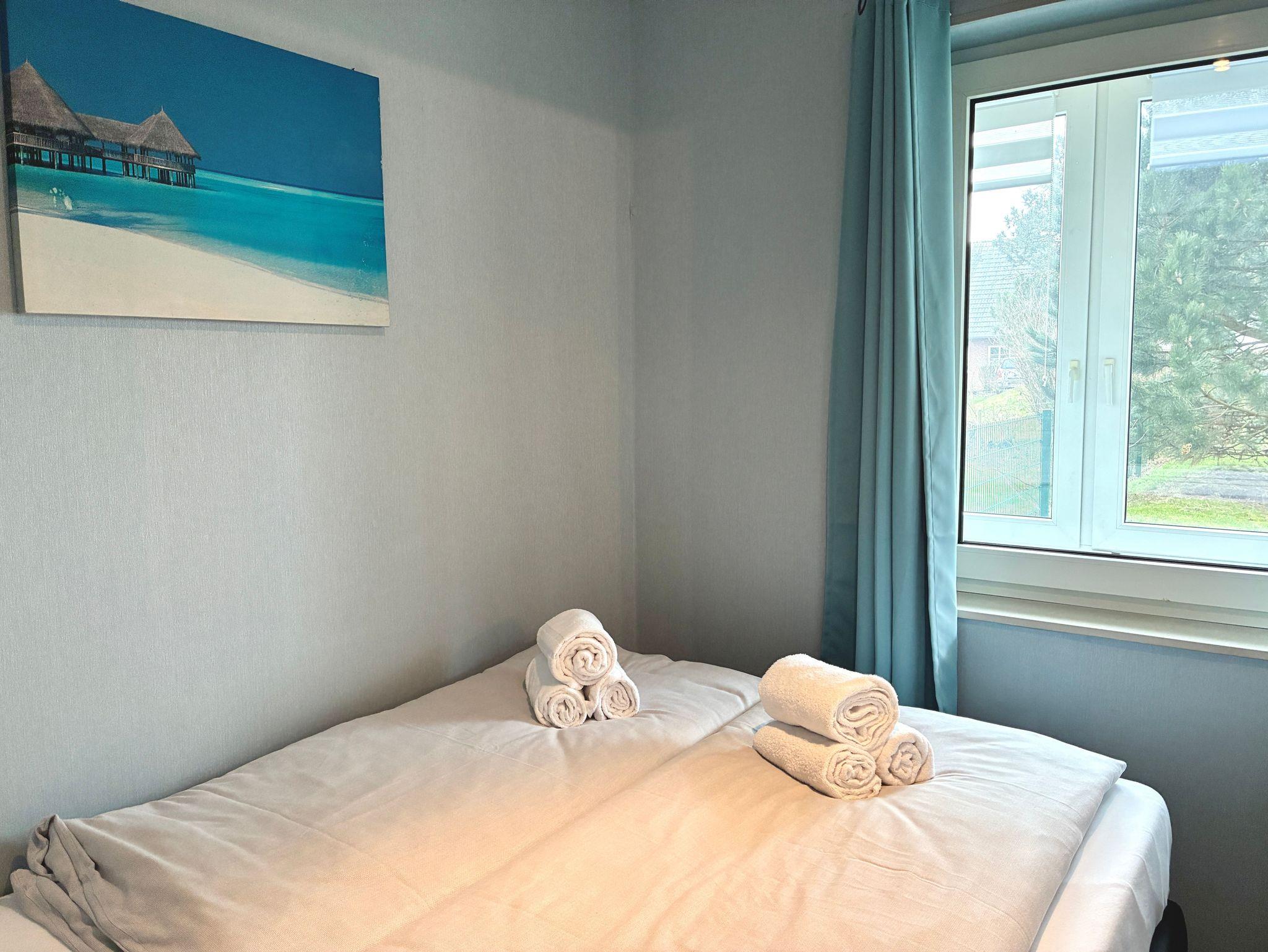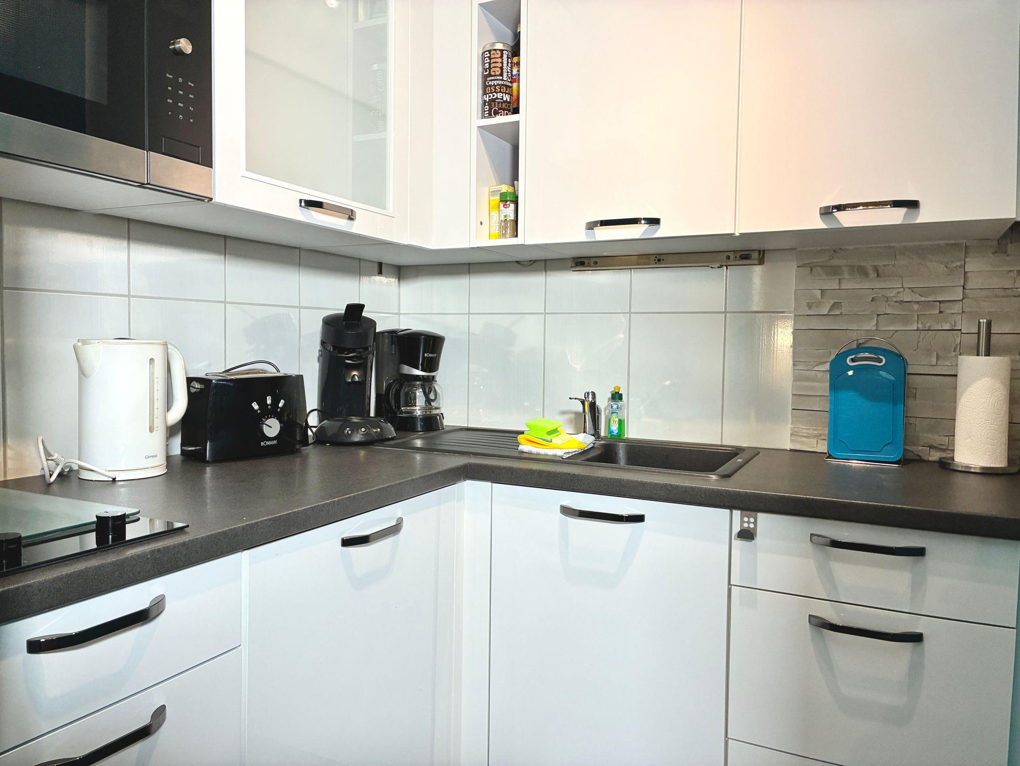Das Schlafzimmer ist mit einem Boxspringbett in der Größe 140 × 200 cm ausgestattet. Das geschmackvoll gestaltete Duschbad fügt sich stimmig in das Gesamtbild der Wohnung ein. Die offene Küche ist vollständig eingerichtet und bietet alles, was für die Selbstversorgung im Urlaub benötigt wird, einschließlich einer Kaffeemaschine und Gefriermöglichkeiten.
