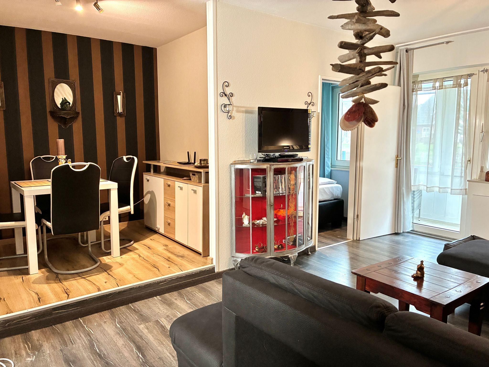 Der Wohnraum ist gemütlich eingerichtet und bietet eine bequeme Sitzgruppe sowie einen Fernseher mit Blu-ray-Player. Der Esstisch steht leicht erhöht in einer separaten Nische und bildet einen ruhigen Platz für gemeinsame Mahlzeiten oder einen entspannten Start in den Tag. Auch Hunde sind hier willkommen, ein Hundebett steht bereit.