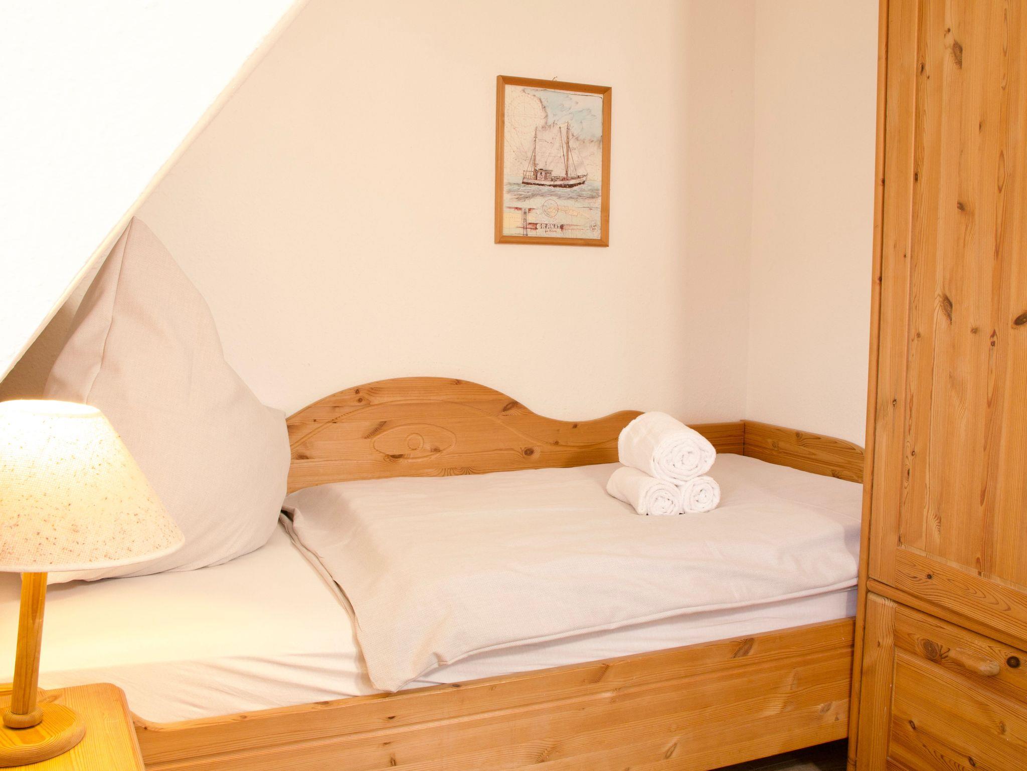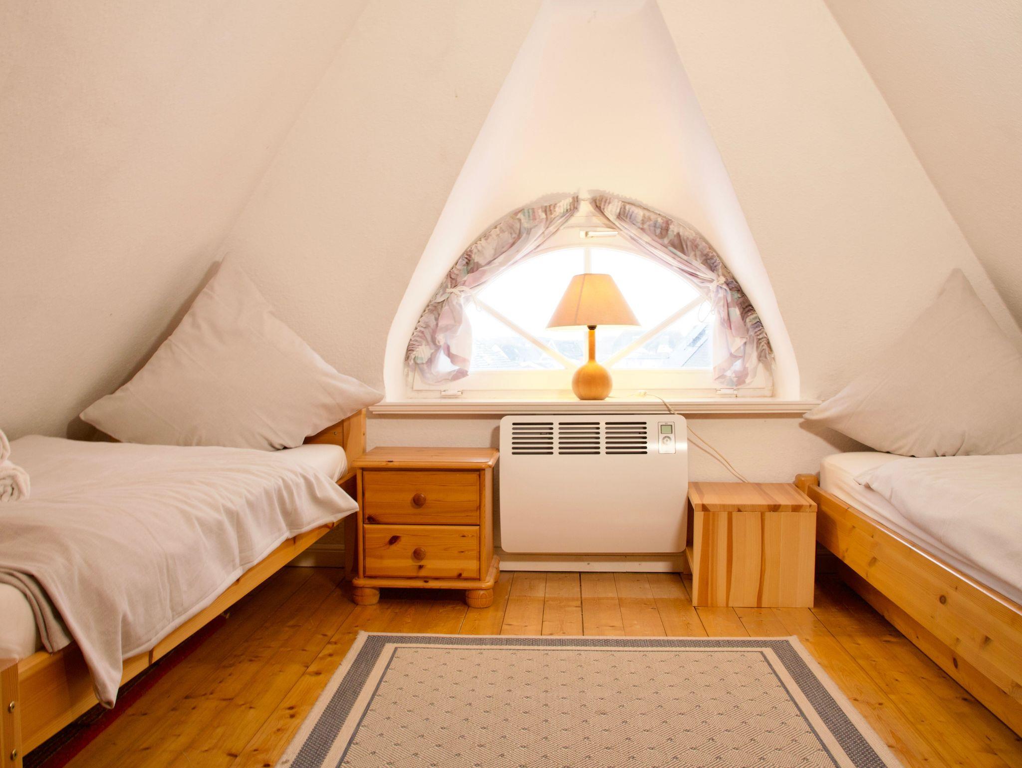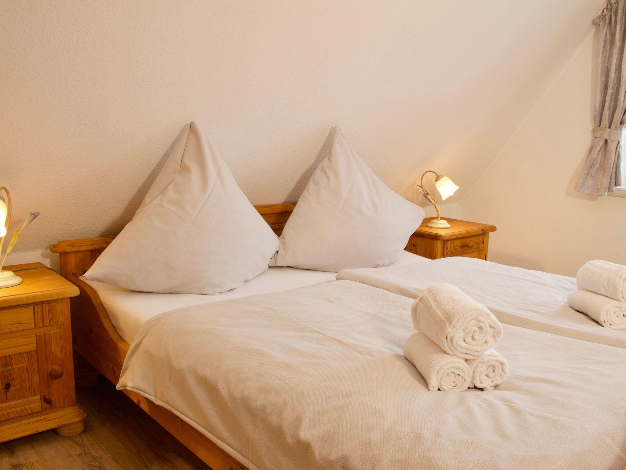 Im Obergeschoss befinden sich drei Schlafräume, die über eine Holztreppe erreichbar sind. Ein Schlafzimmer ist mit einem Doppelbett ausgestattet, die beiden weiteren verfügen jeweils über zwei Einzelbetten und bieten ausreichend Raum für erholsame Nächte.