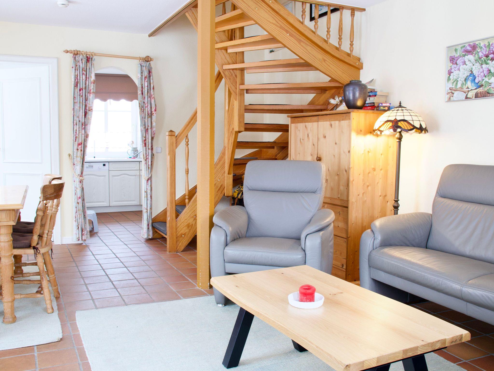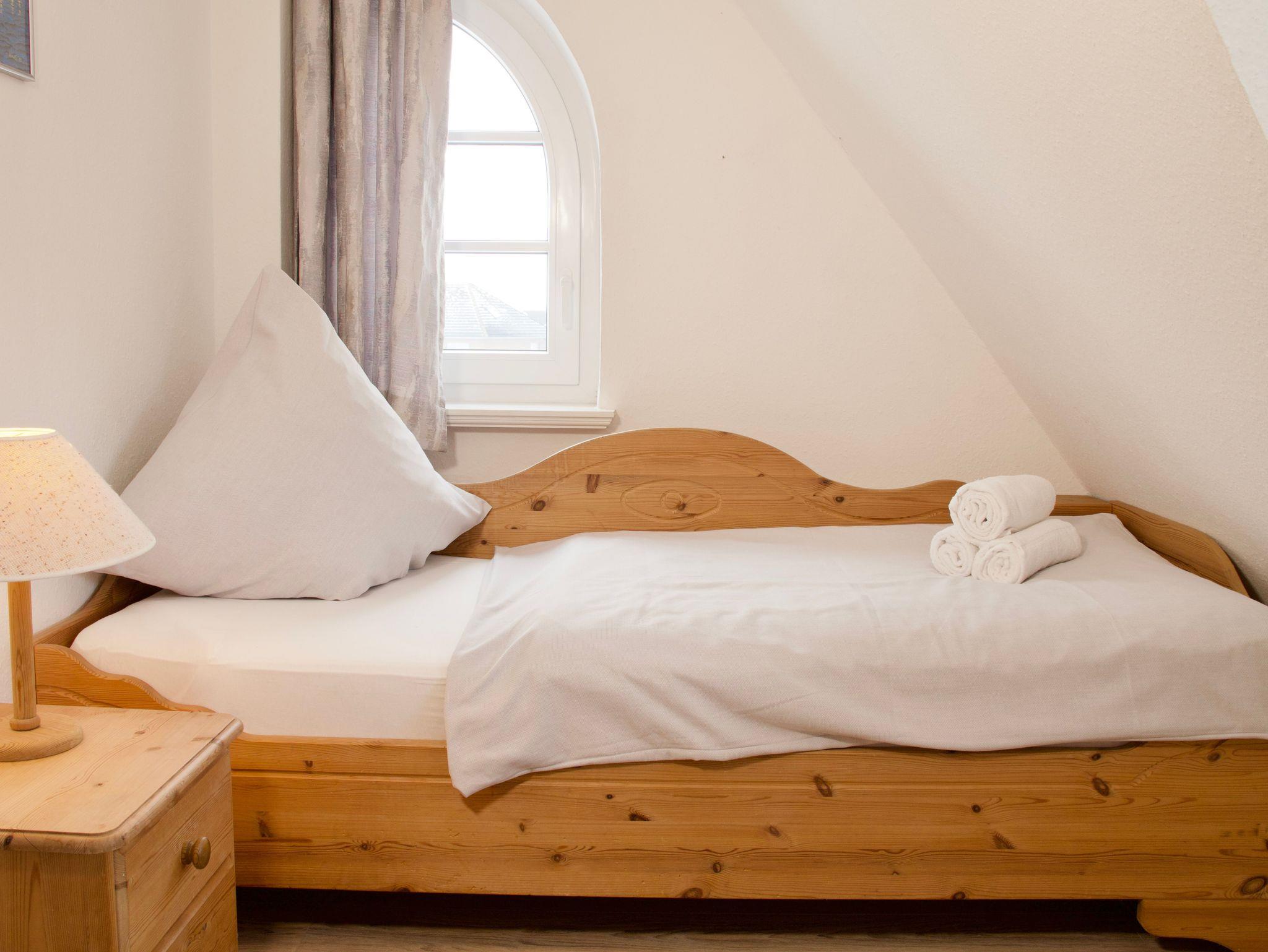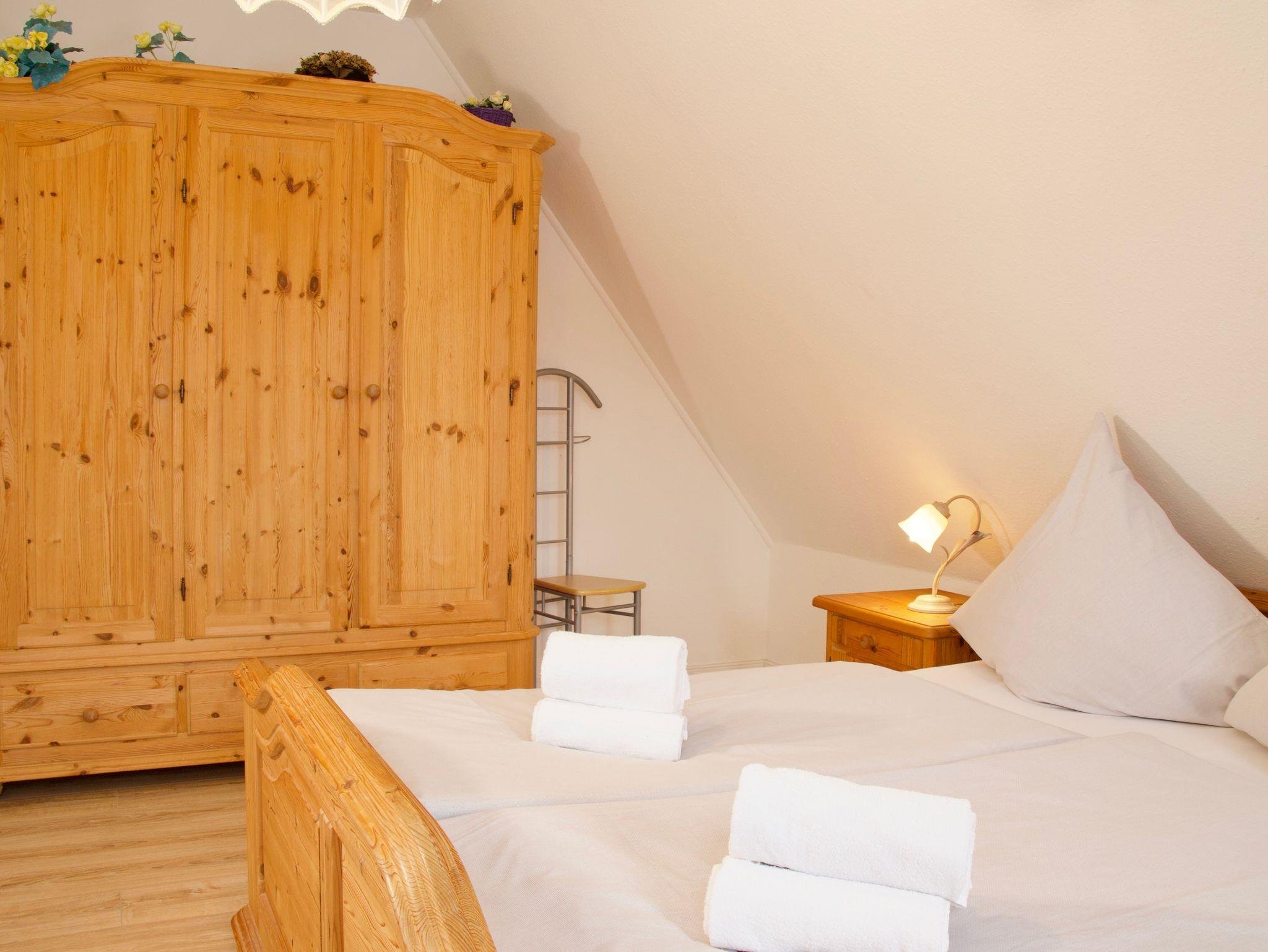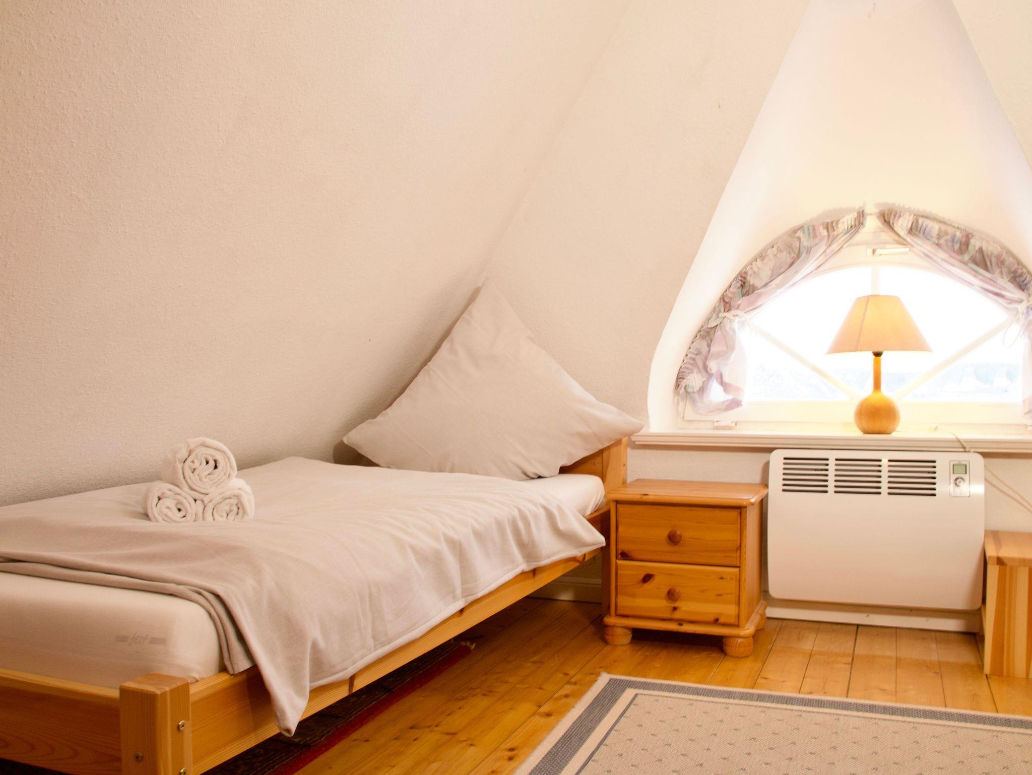 Im Obergeschoss befinden sich drei Schlafräume, die über eine Holztreppe erreichbar sind. Ein Schlafzimmer ist mit einem Doppelbett ausgestattet, die beiden weiteren verfügen jeweils über zwei Einzelbetten und bieten ausreichend Raum für erholsame Nächte.