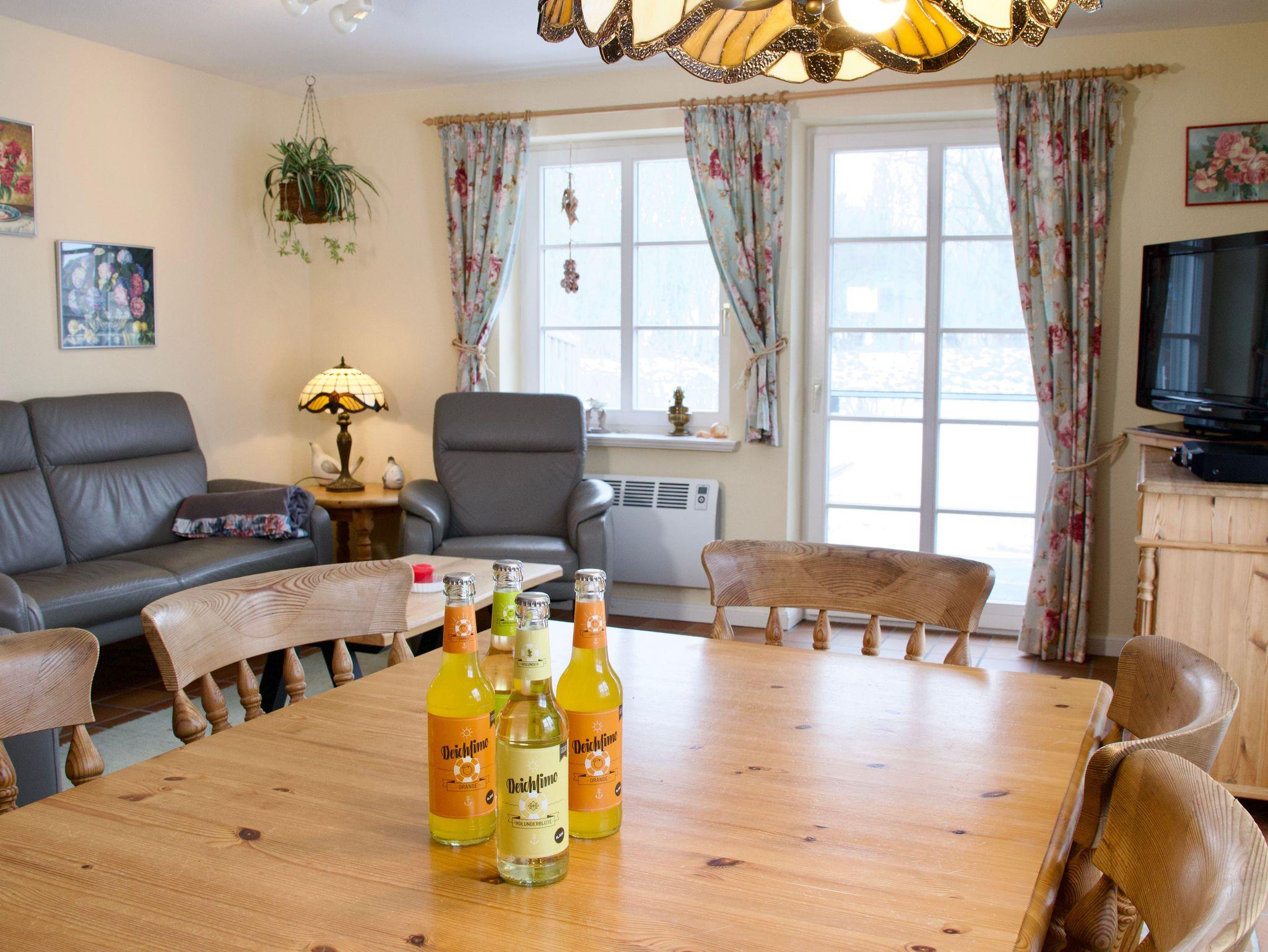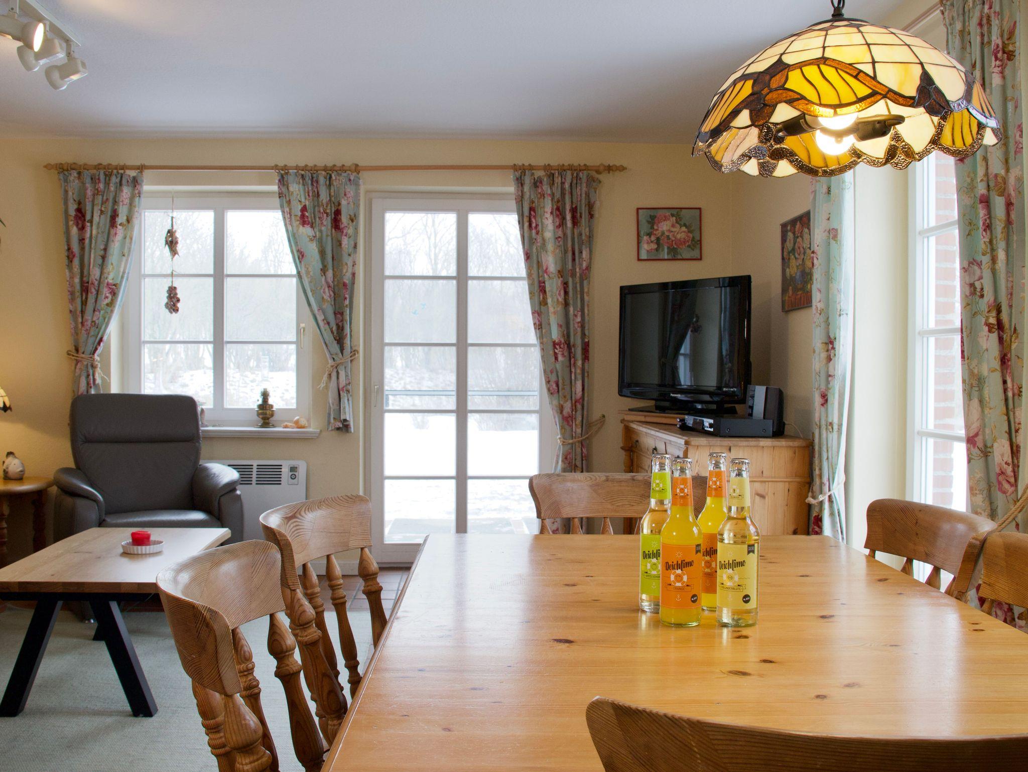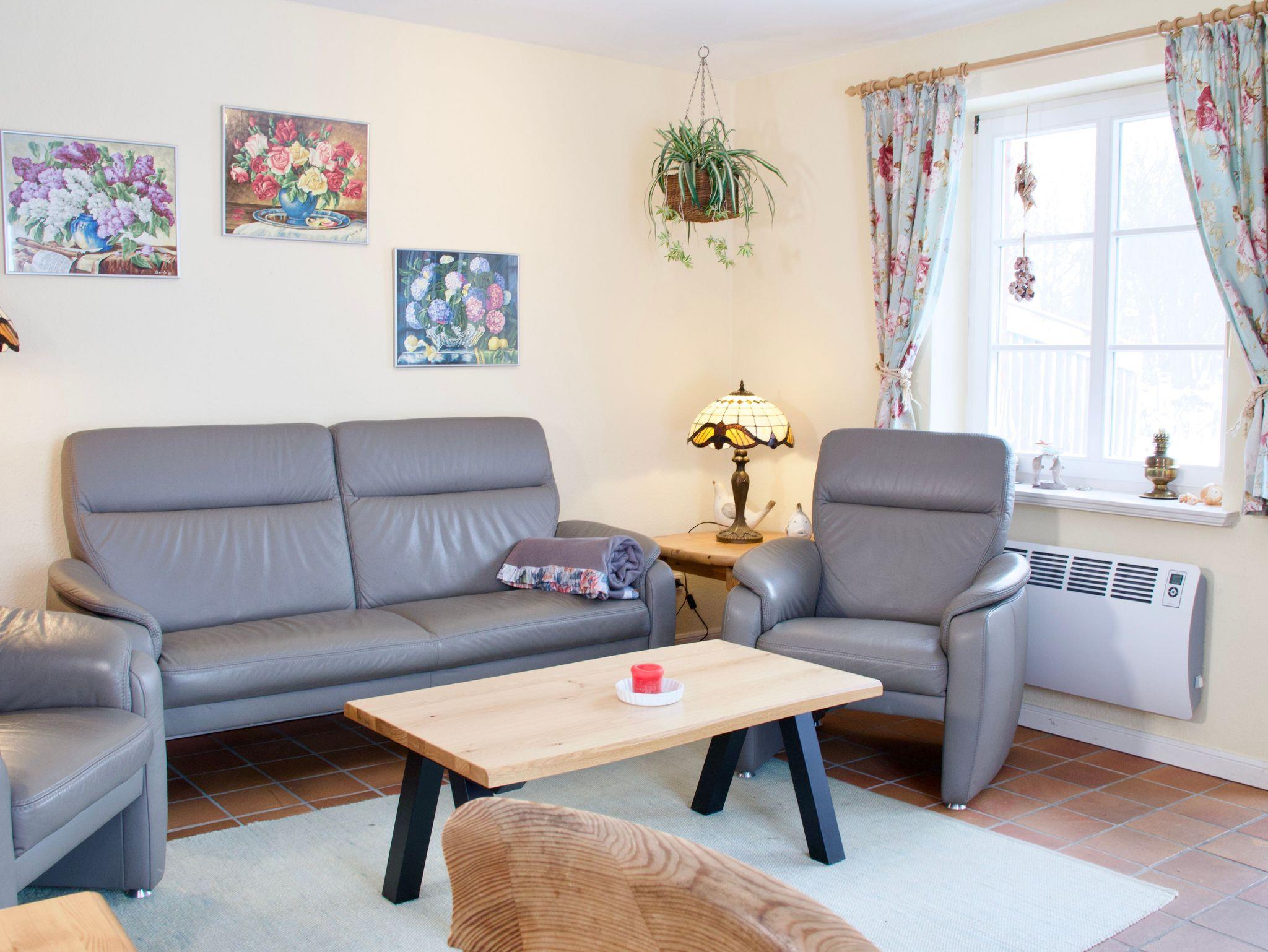 Herzstück des Hauses ist das helle Wohnzimmer mit großzügigem Wohnbereich, TV und WLAN. Große Fenster lassen viel Tageslicht in den Raum und öffnen den Blick zur Terrasse. Der separate Essbereich schließt sich harmonisch an und bietet ausreichend Platz für gemeinsame Mahlzeiten und entspannte Abende.