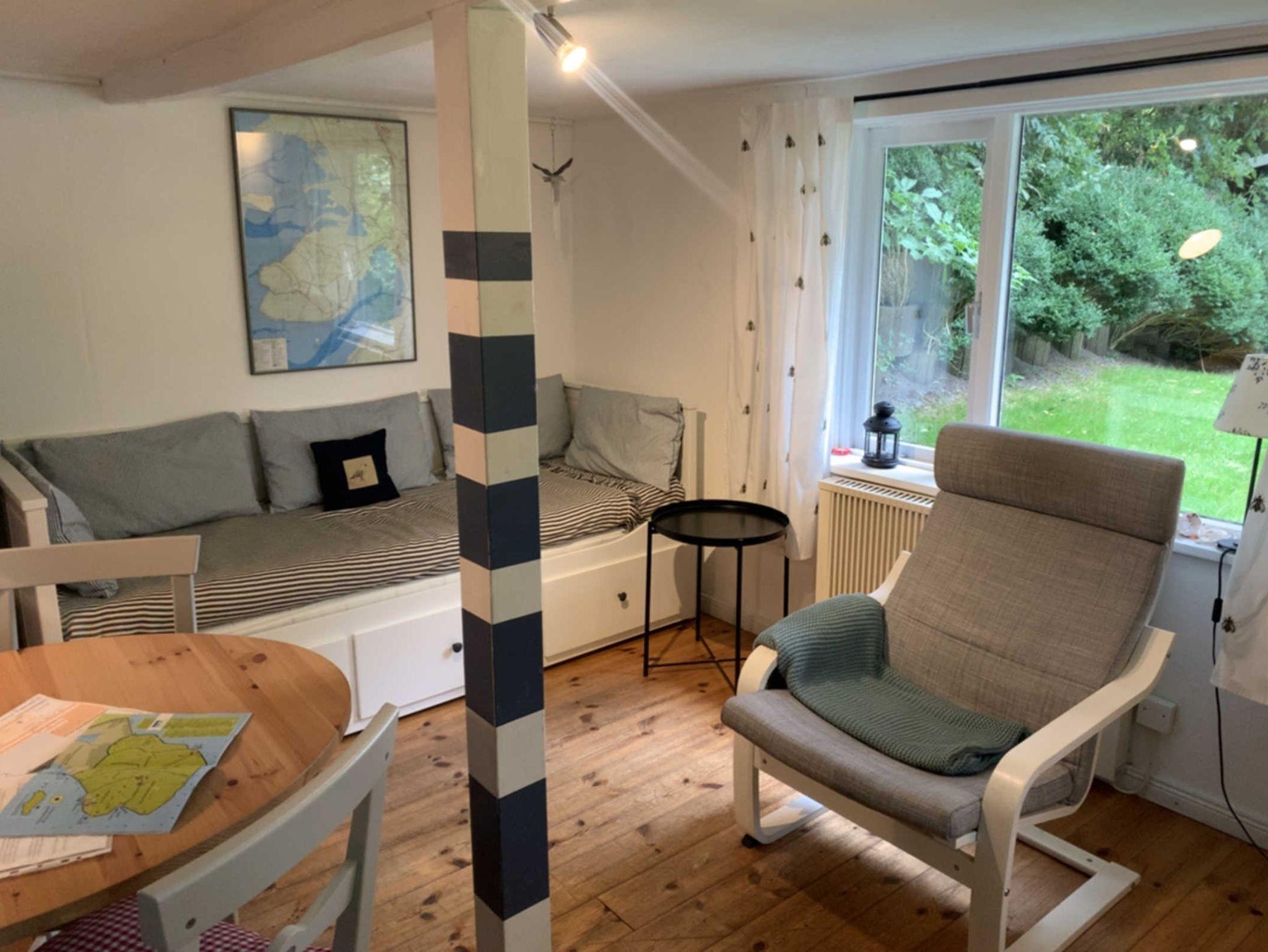 Zu dem Haus gehört auch ein großer Garten mit Sitz- und Spielmöglichkeiten und einem unvergleichlichem Blick auf Nordstrands Felder und Natur.