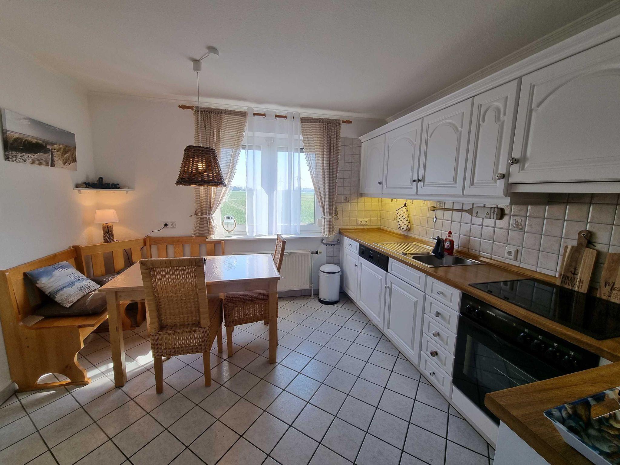 Über die einladende Diele, die schon Strand-Atmosphäre verbreitet, erreicht man die weiße Einbauküche mit gemütlicher Sitzecke samt Eckbank,