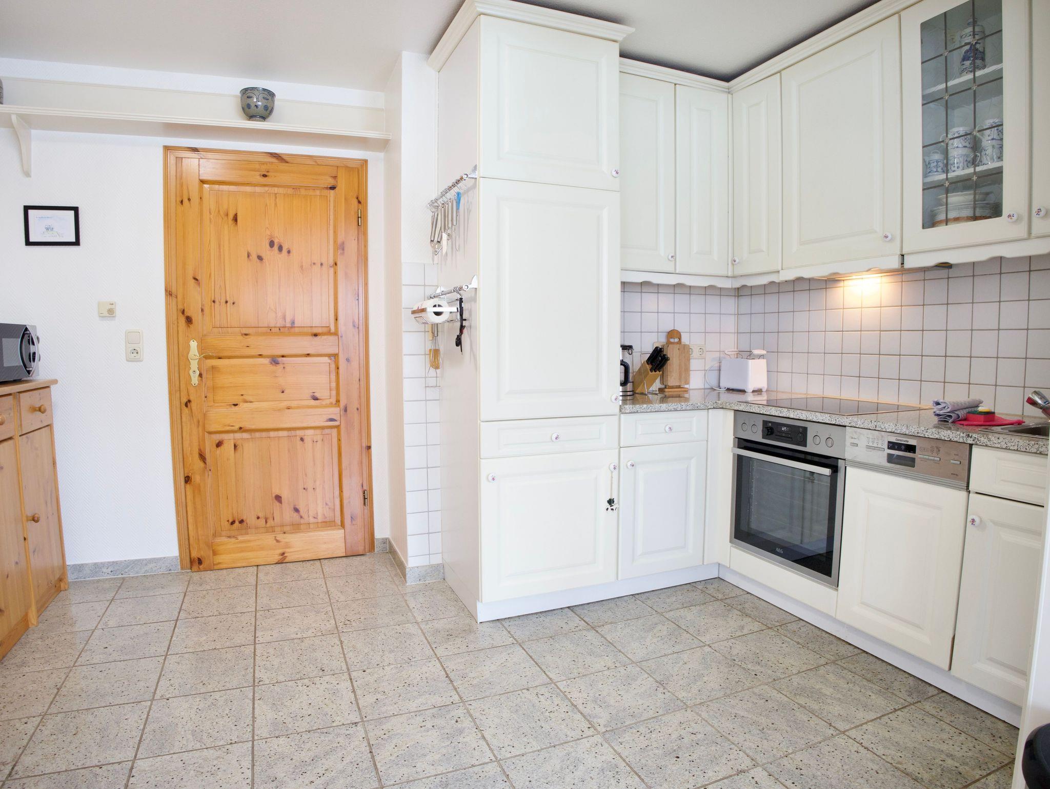 Im Obergeschoss stehen zwei weitere Schlafzimmer zur Verfügung, eines mit einem Doppelbett in der Größe 180 x 200 Zentimeter und eines mit zwei Einzelbetten in der Größe 90 x 200 Zentimeter. Ergänzt wird diese Ebene durch ein gemütliches Wohnzimmer, eine weitere Küche sowie ein zusätzliches Duschbad.