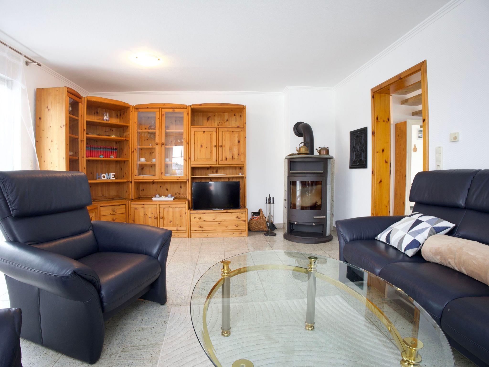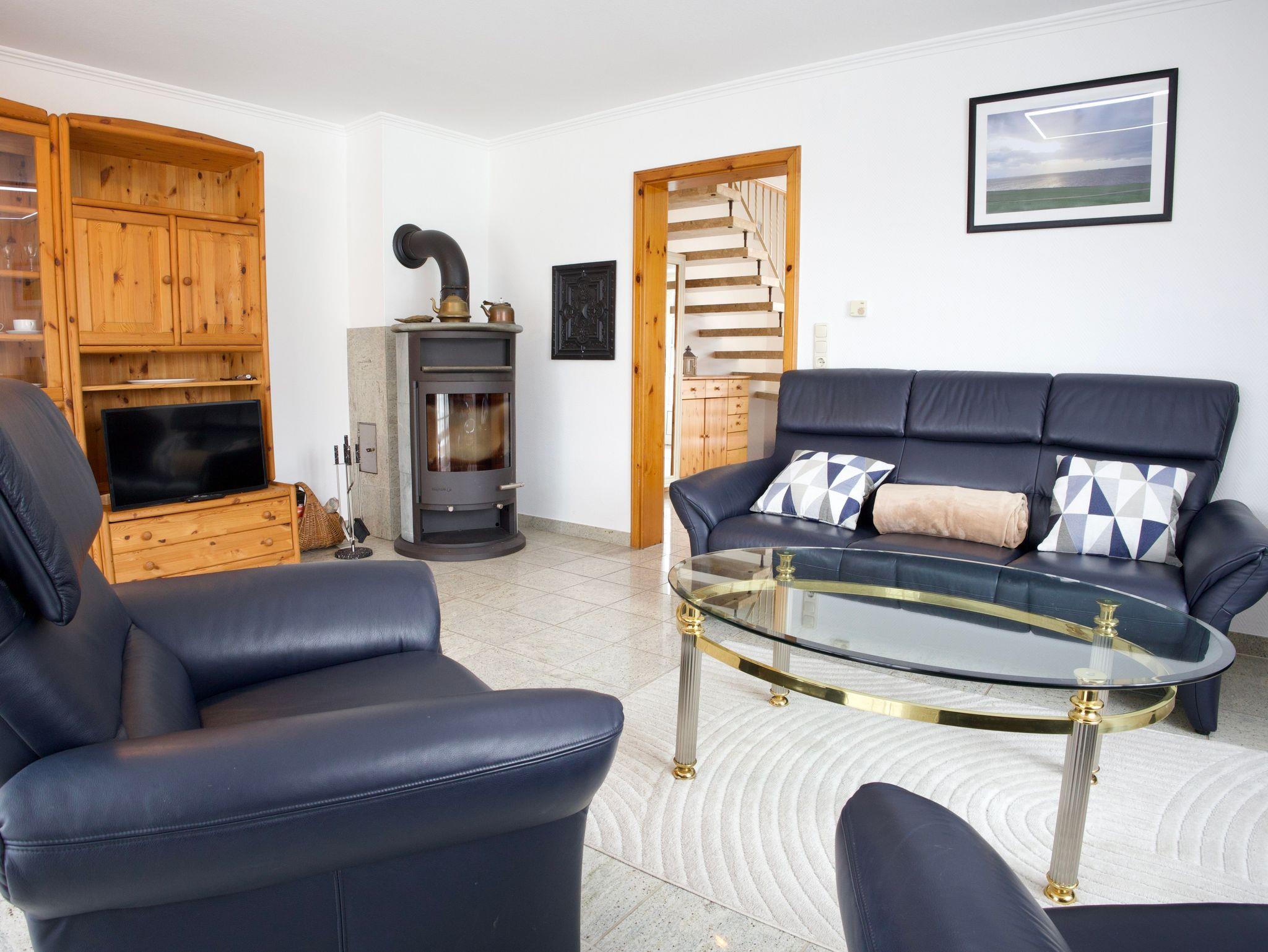 Der großzügige Wohnbereich bietet viel Platz für gemeinsame Stunden. Ein Kaminofen sorgt an kühleren Tagen für eine behagliche Atmosphäre und macht den Raum zu einem gemütlichen Mittelpunkt des Hauses. Von hier aus gelangen Sie direkt in den Garten mit Sonnenterrasse und Strandkorb, der zum Entspannen im Freien einlädt.