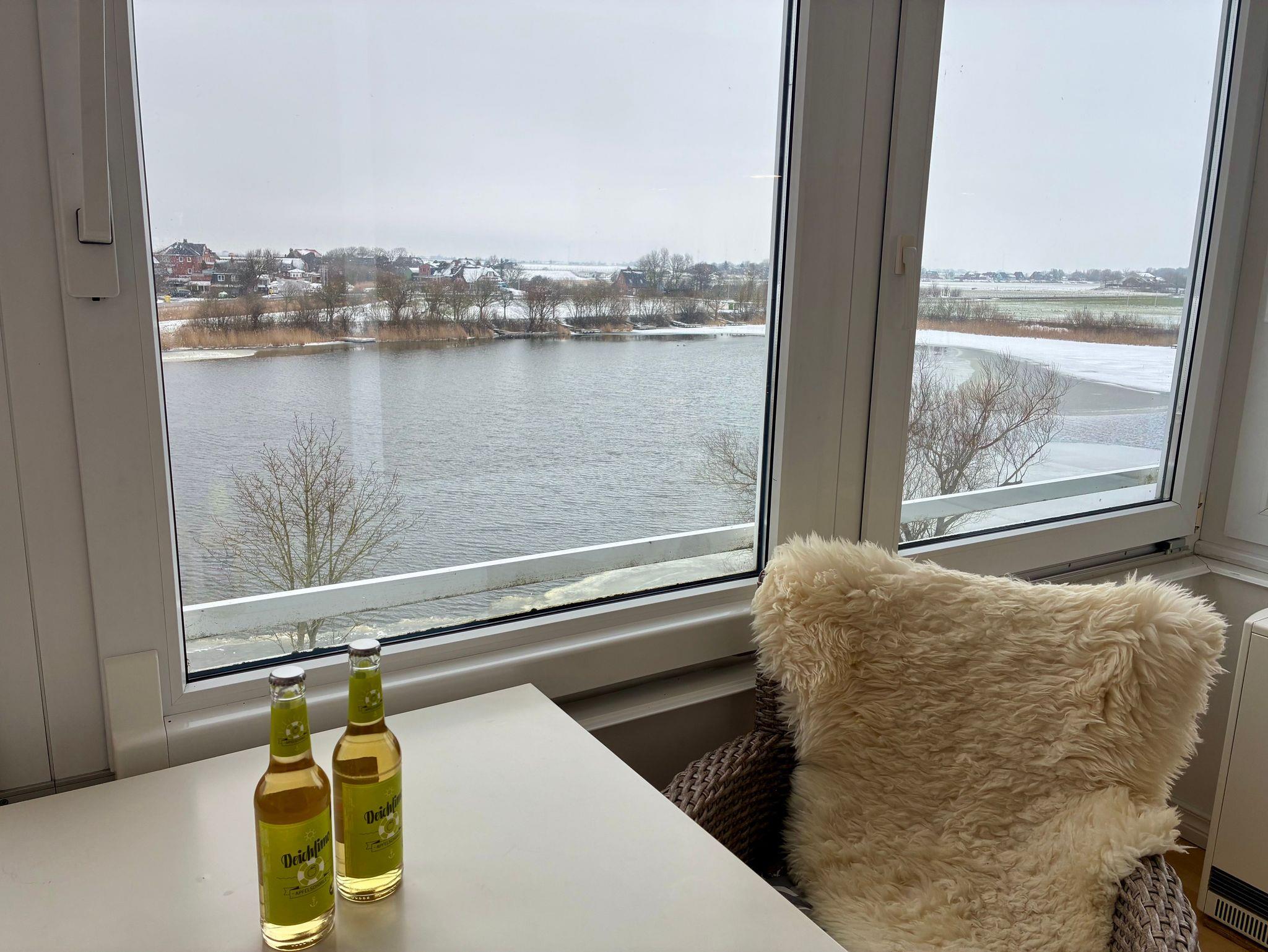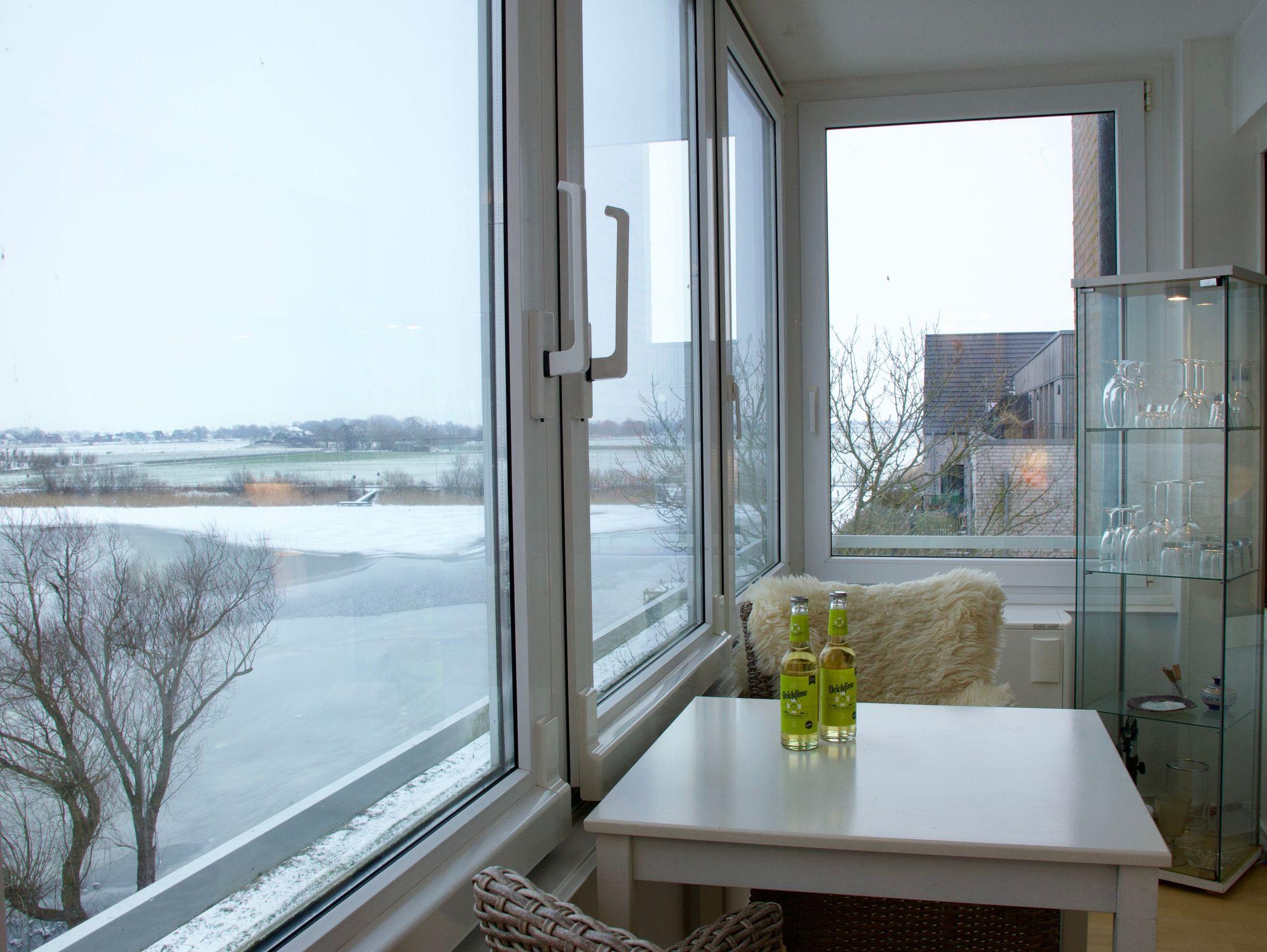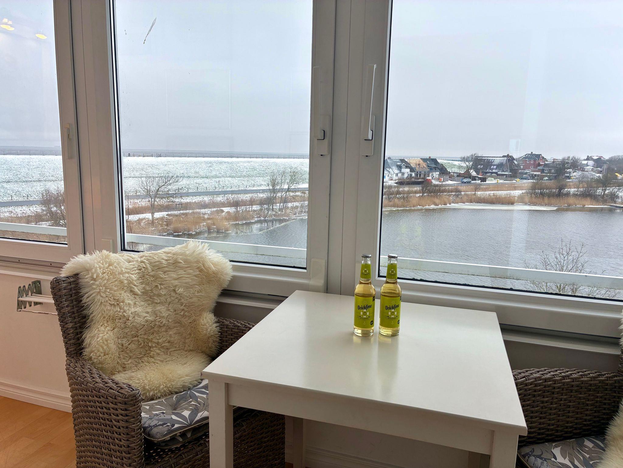 Ein besonderes Merkmal der Wohnung ist der Wintergarten mit gemütlicher Essecke. Von hier aus reicht der Blick über die Nordsee bis zu den Halligen und über Nordstrand, ergänzt durch den Ausblick auf den großen Angelteich direkt neben dem Haus, der die Aussicht um eine ruhige, naturnahe Komponente erweitert.