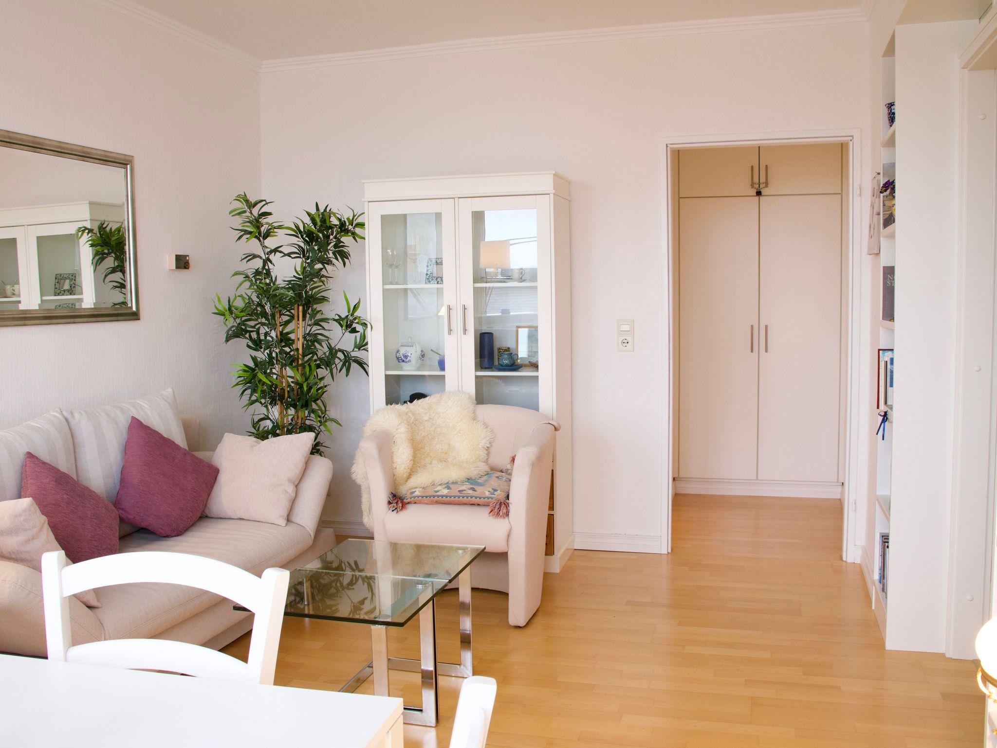 Schon beim Betreten fällt das helle, freundliche Raumgefühl auf. Große Panoramafenster lassen viel Tageslicht herein und geben den Blick frei über die Umgebung. Der Wohn- und Schlafraum ist modern, klar und bewusst zurückhaltend eingerichtet und schafft eine entspannte Atmosphäre. Ergänzt wird die Wohnung durch ein separates Wohnzimmer, das Raum für ruhige Stunden bietet. Ein Smart-TV sowie WLAN stehen hier zur Verfügung.