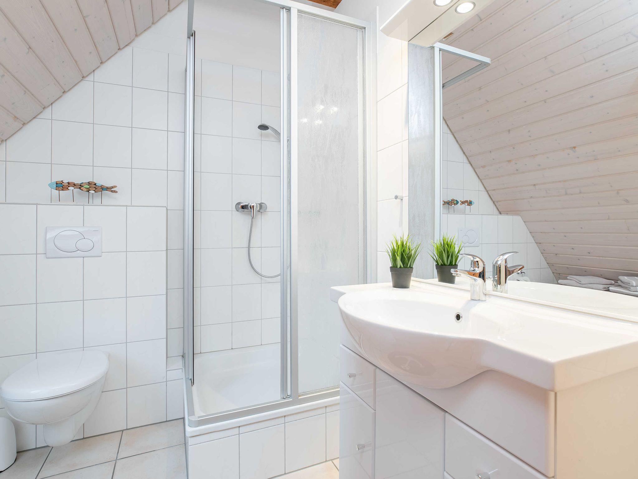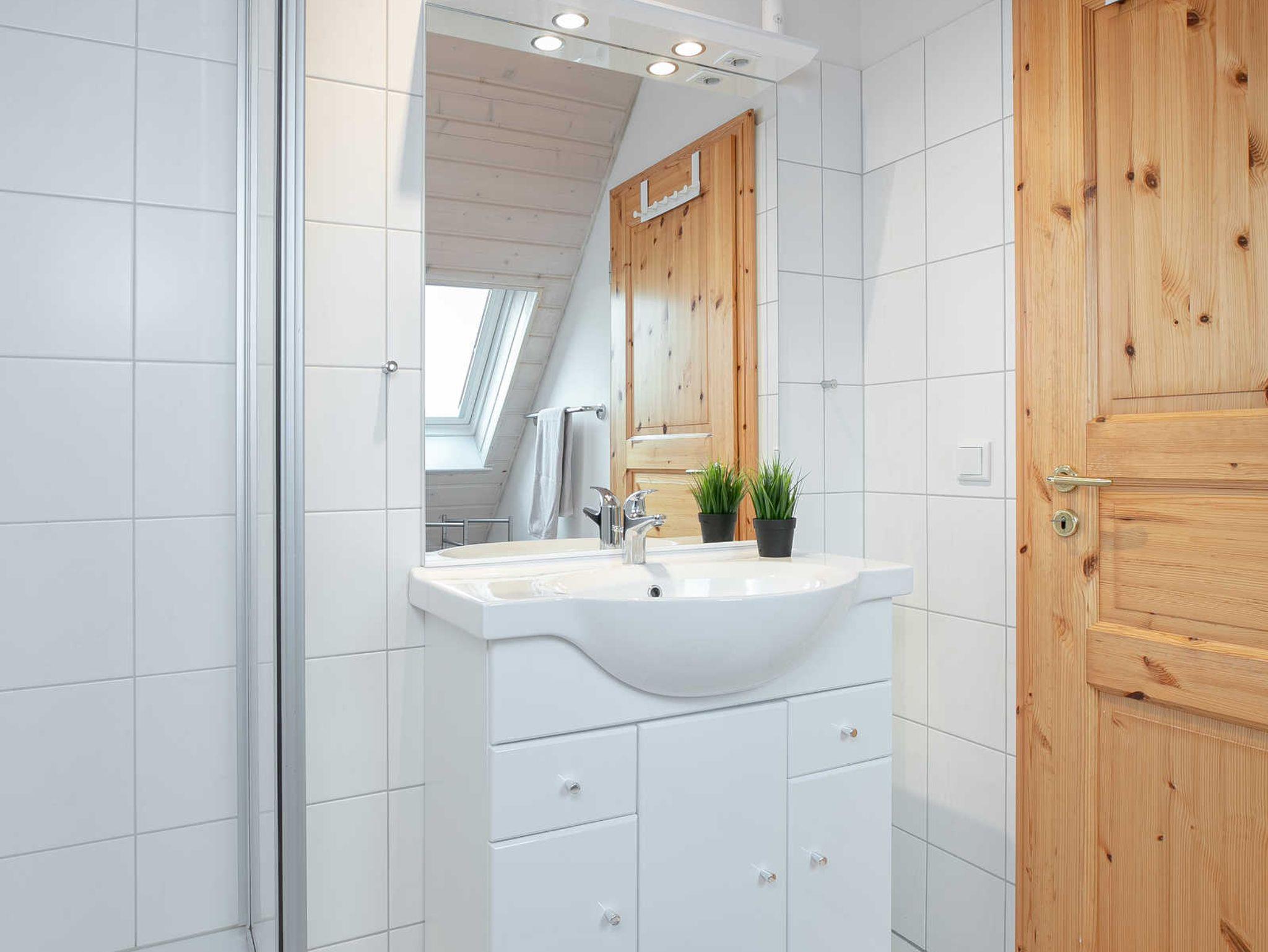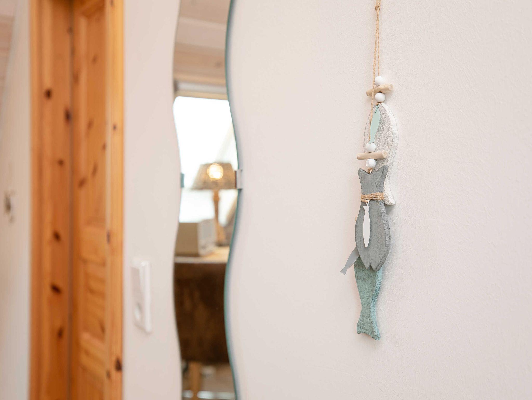 Alles ist im modernen Landhausstil in den Farbtönen weiß/sandfarben eingerichtet und mit maritimen Accessoires gestaltet.