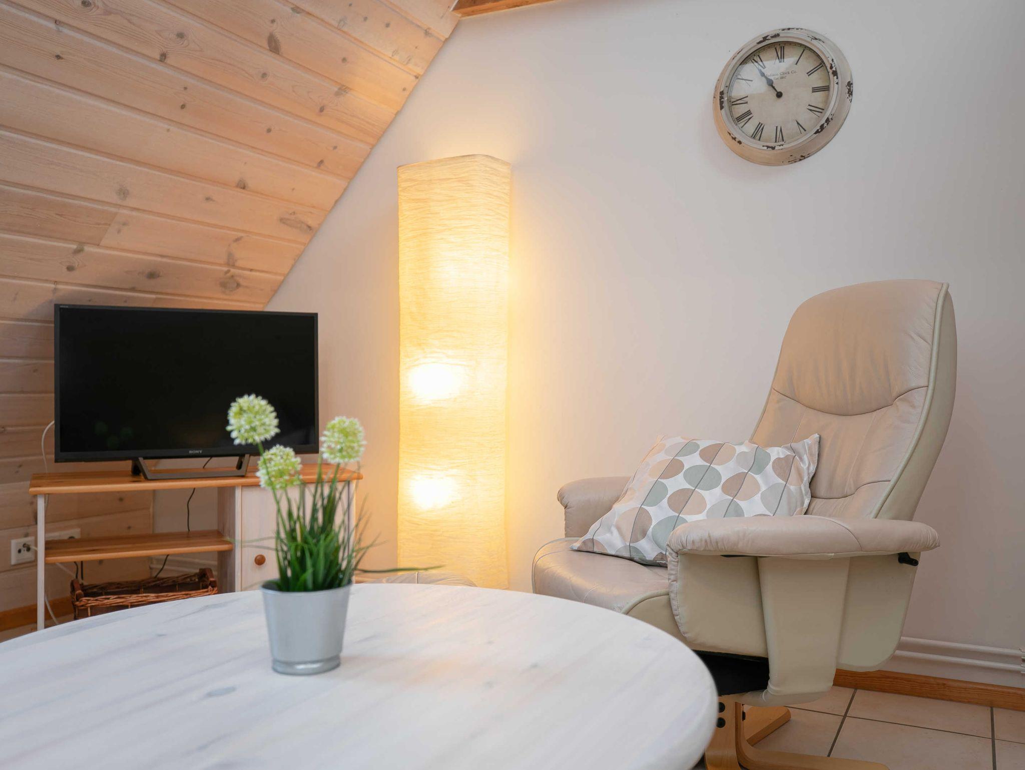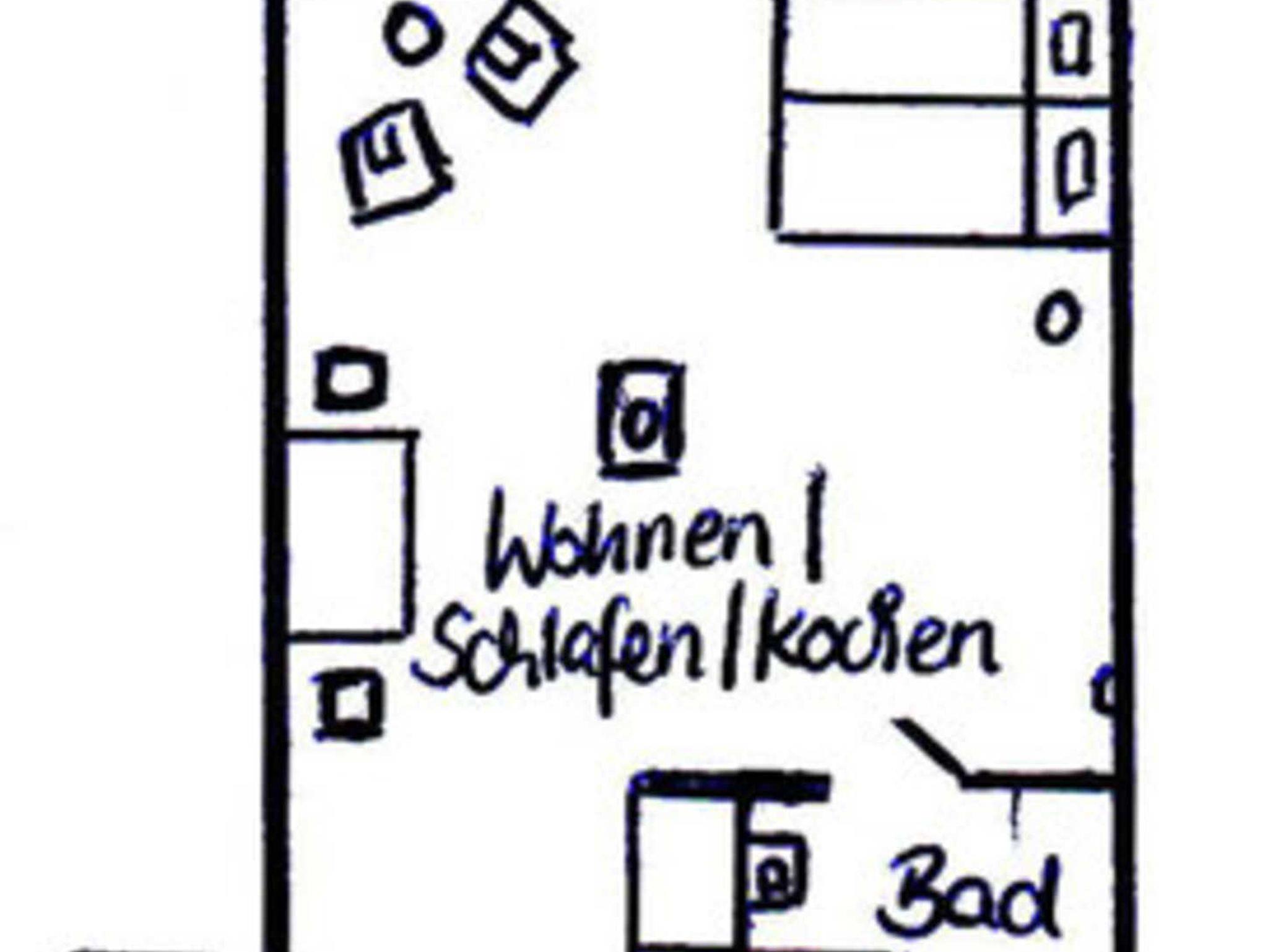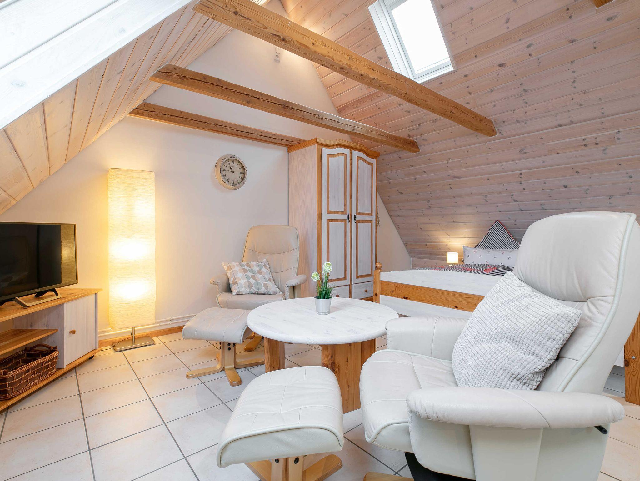 Die Wohnung hat einen kombinierten Wohn-, Ess- und Schlafbereich mit separatem Duschbad. Hier findest Du eine komplett ausgestattete Küchenzeile mit einem gemütlichen Essbereich, Relax Sessel mit