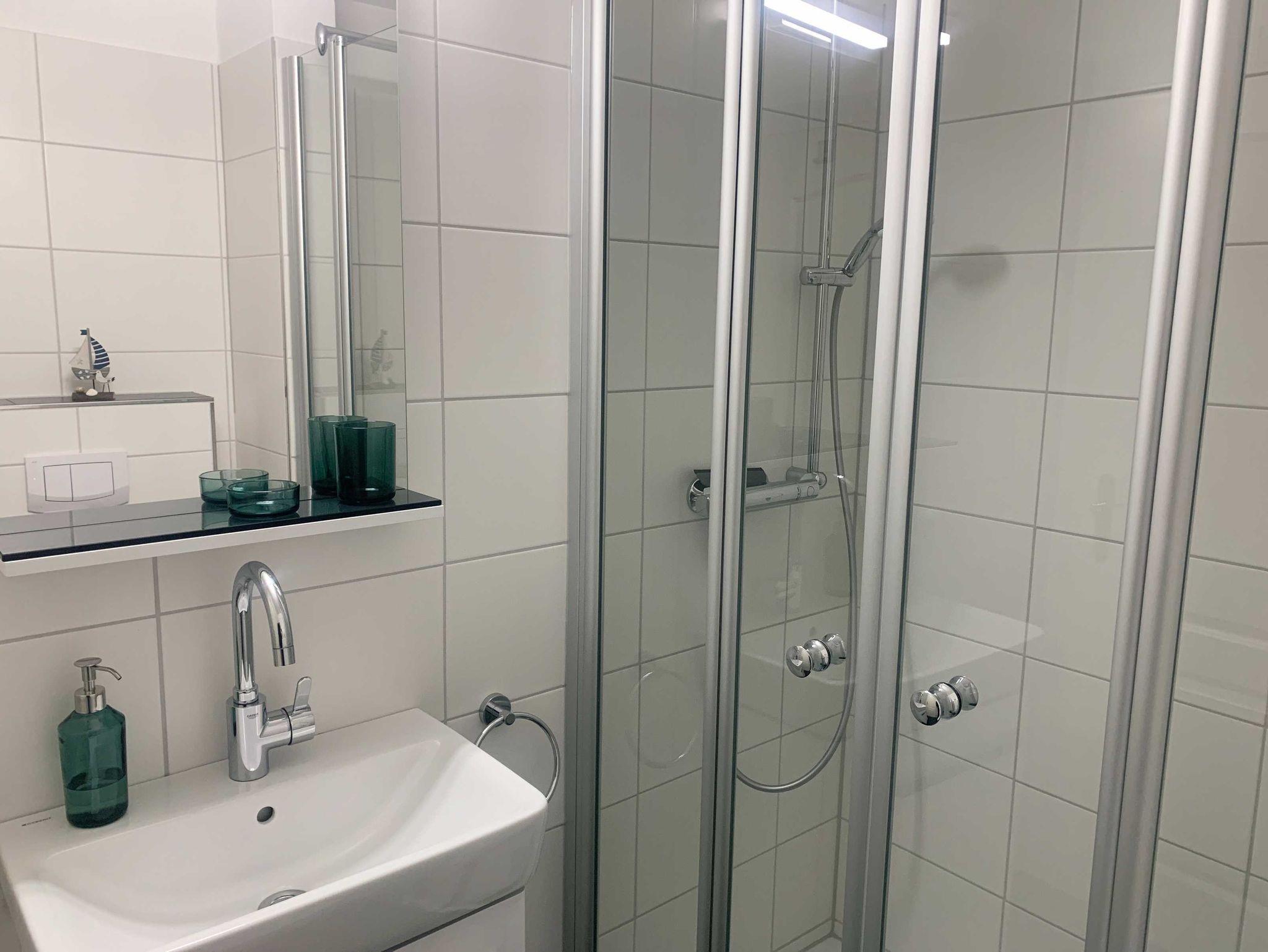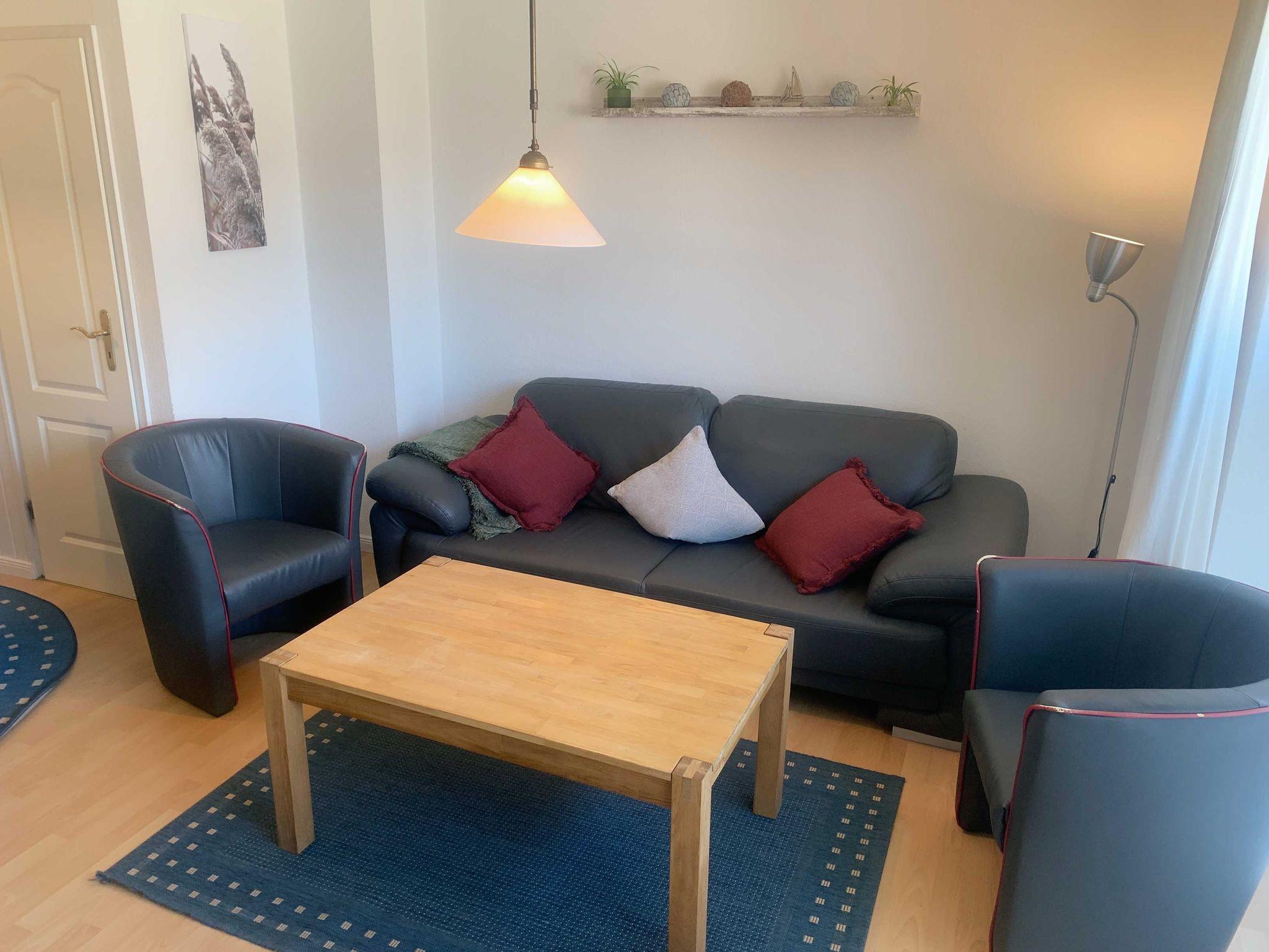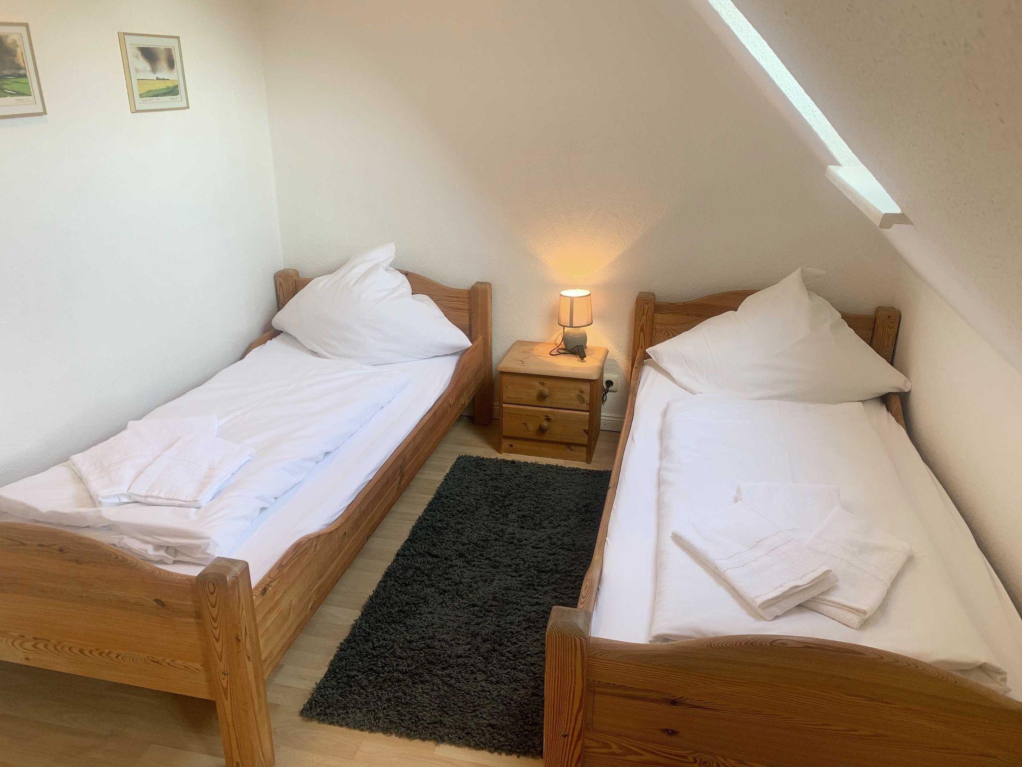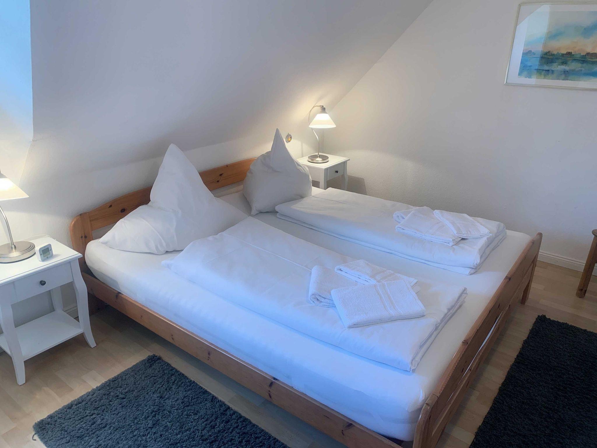 Ferienhaus mit 2 Schlafzimmern, Wohnbereich, Süd-Terrasse, direkt am Meer gelegen. Es befindet sich als ein Hausteil mit ca. 75qm Größe in einem Haus mit 3 Hausteilen. Es ist für 2 bis 4 Personen geeignet und verfügt im Obergeschoss über zwei Schlafzimmer. Eines mit einem Doppelbett und ein weiteres Schlafzimmer mit zwei Einzelbetten. Ebenfalls befindet sich dort das Bad / WC. Im Erdgeschoss ist der Wohnbereich. Ein geräumiges Wohnzimmer mit jeweils separatem Sitz- und Essbereich, Farb-TV und Radio. Vom Wohnzimmer aus geht es auf die möblierte Süd-Terrasse. Die Küche ist mit einer komplett ausgestatteten Einbauküche eingerichtet, Mikrowelle und Waschmaschine. Ein zusätzliches WC ist vom Flur aus zu erreichen. Eigener PKW-Stellplatz ist direkt vor dem Haus.