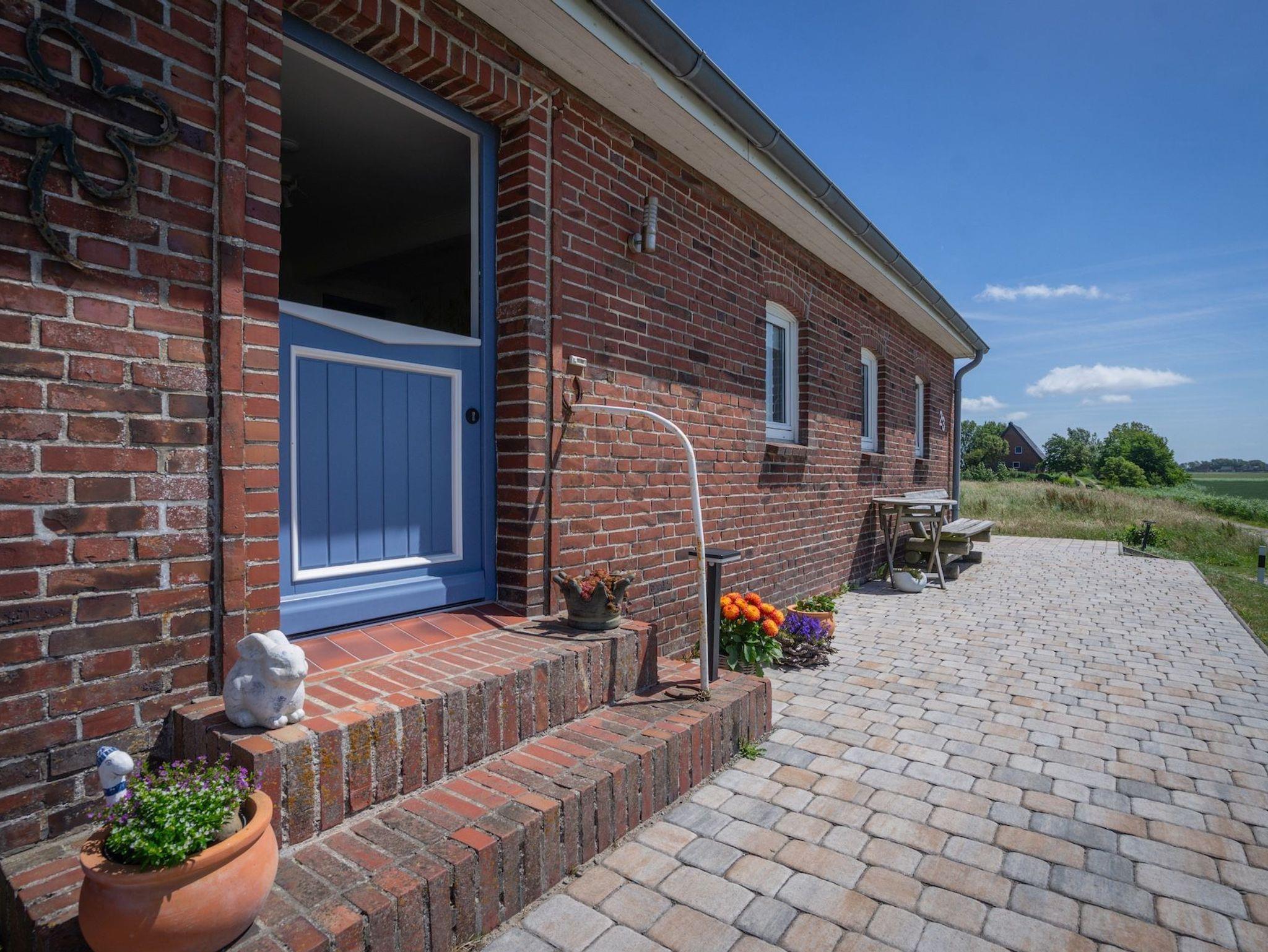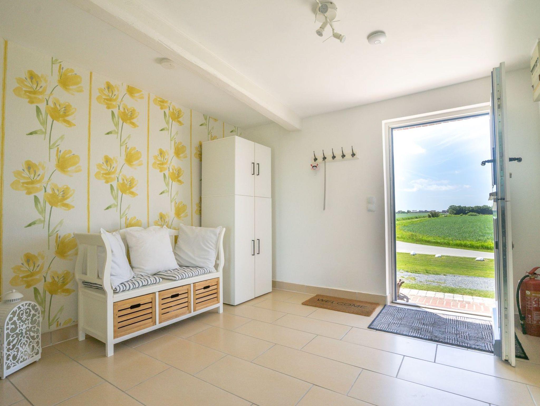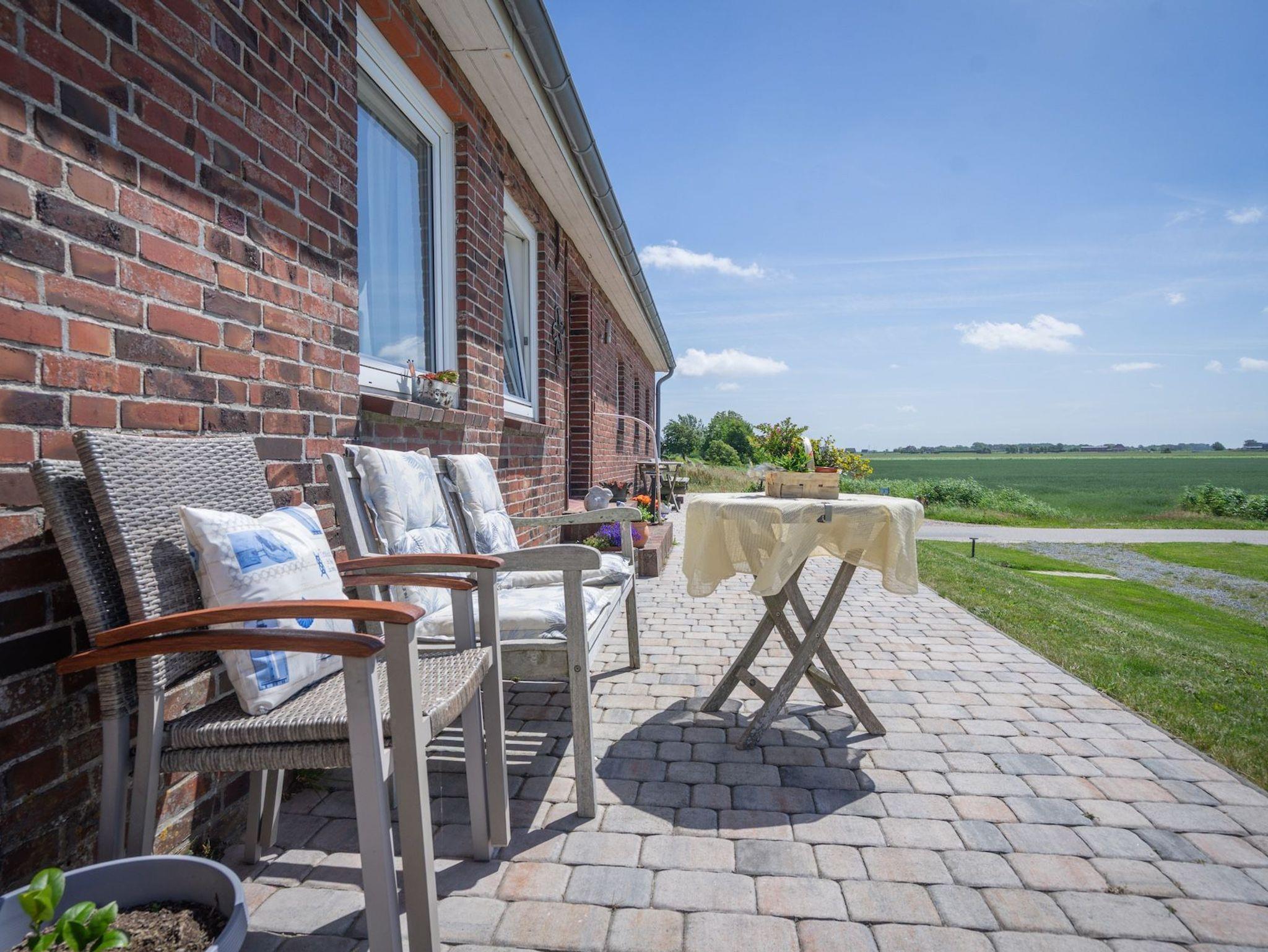 Moderne Ferienwohnung Grote Knutt mit Panoramablick auf Nordstrands Marschen, ideal für Familien und Naturliebhaber.
