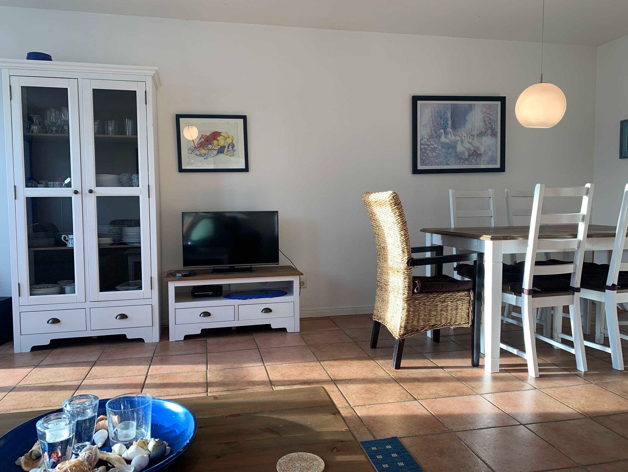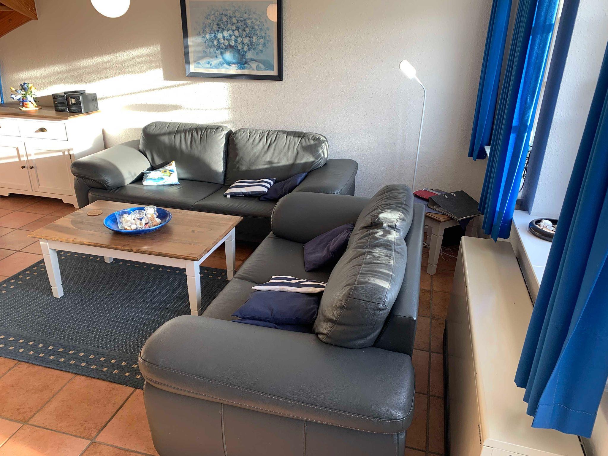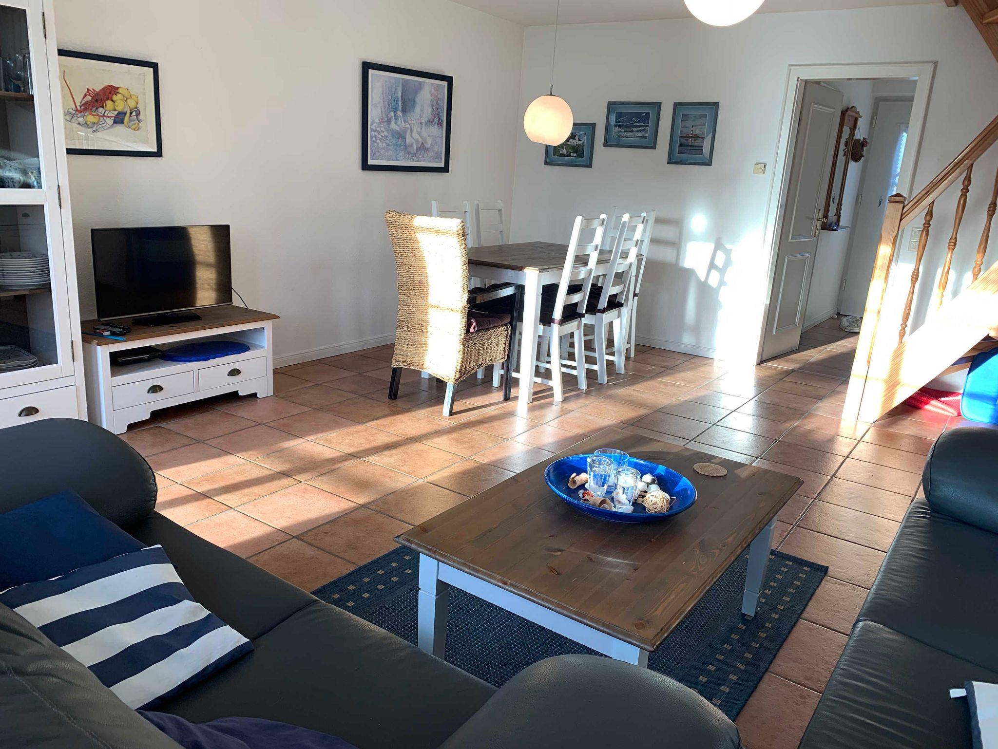 Im Erdgeschoss erwartet Sie ein einladendes Wohnzimmer mit separatem Wohn- und Essbereich. Die Küche ist vollständig ausgestattet und verfügt über eine Spülmaschine, Mikrowelle und weitere praktische Küchengeräte. Vom Flur aus erreichen Sie ein zusätzliches Gäste-WC. Vom Wohnzimmer aus gelangen Sie auf die sonnige, möblierte Südterrasse mit eigenem Strandkorb ? perfekt zum Entspannen.