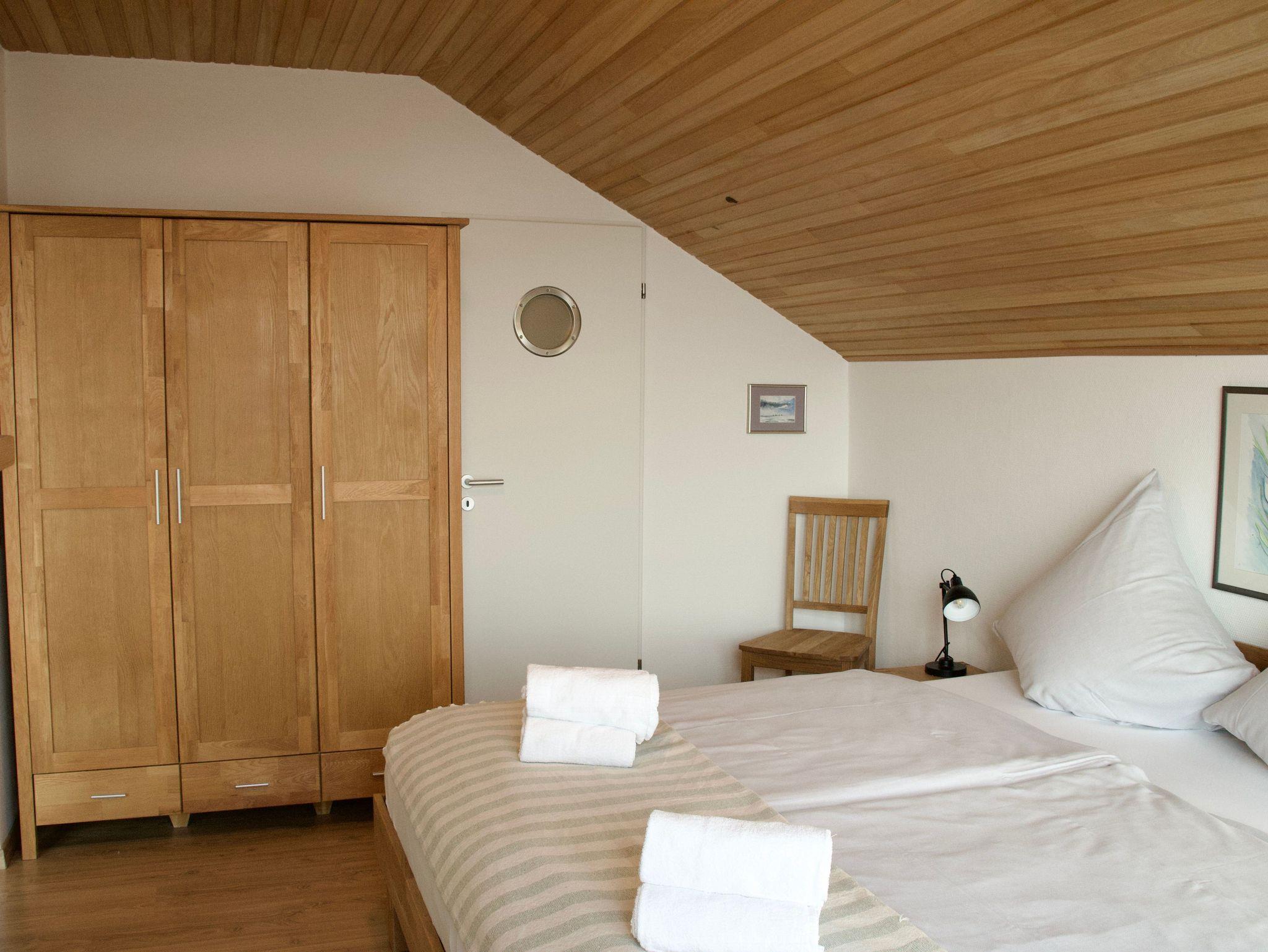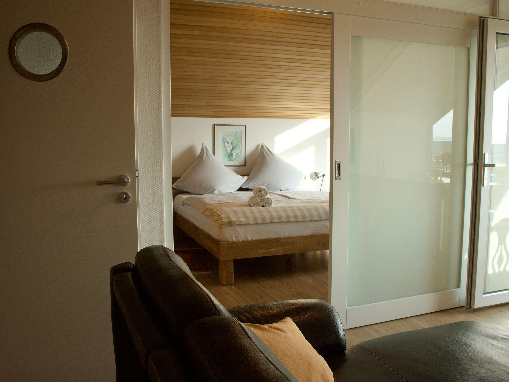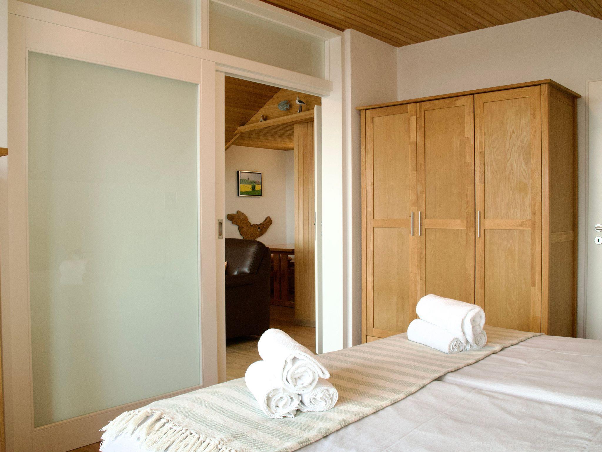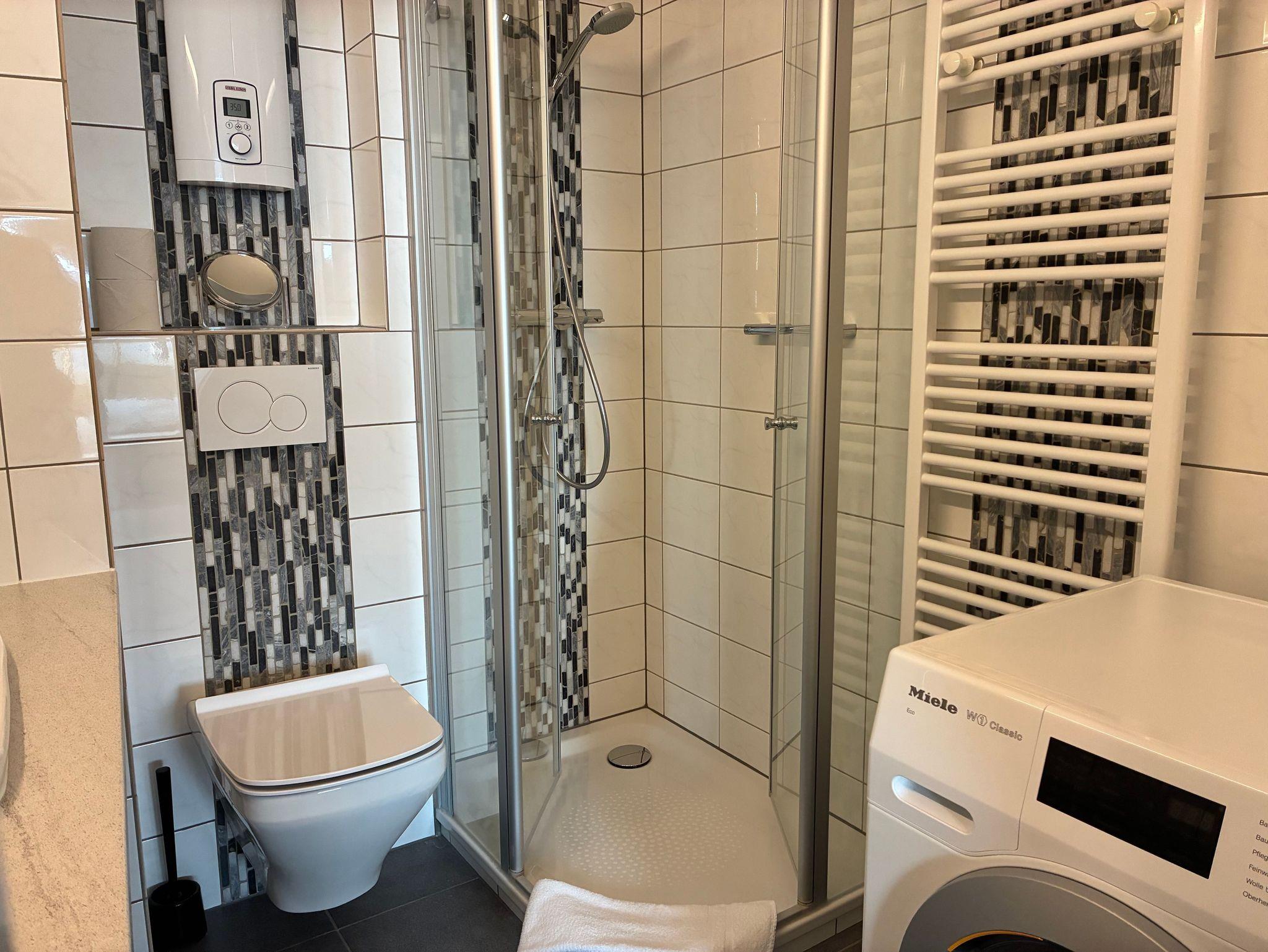 Das Schlafzimmer ist mit einem komfortablen Doppelbett ausgestattet und bietet einen ruhigen Rückzugsort. Das moderne Duschbad schließt direkt an und verfügt über eine Handtuchheizung sowie eine Waschmaschine, die den Aufenthalt auch bei längeren Buchungen angenehm ergänzt.