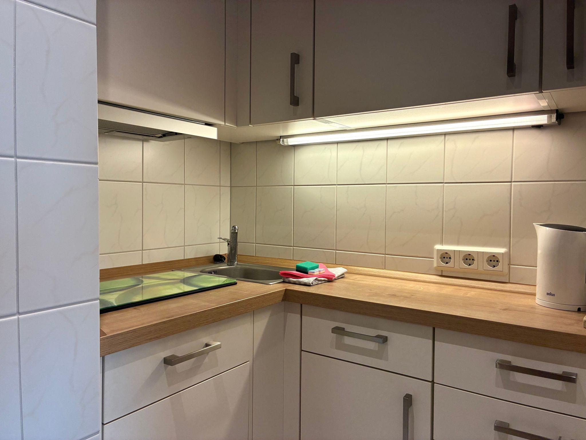 Die Küche ist vollständig eingerichtet und verfügt über einen Geschirrspüler, eine Kaffeemaschine sowie eine Gefriermöglichkeit, sodass die Selbstversorgung im Urlaub unkompliziert gelingt.