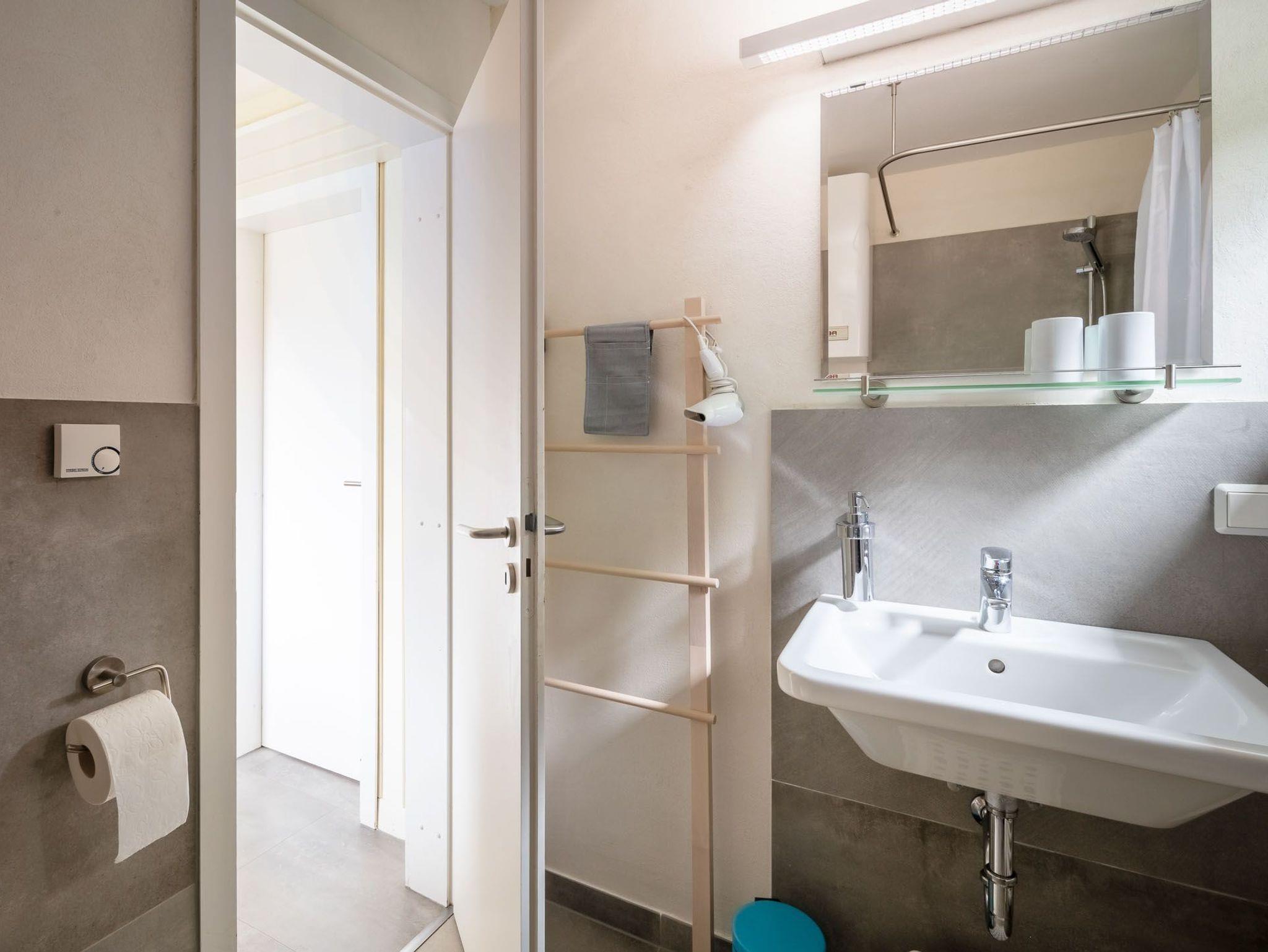 Das Schlafzimmer verfügt über ein Doppelbett (180x200cm) und ein weiteres Schlafzimmer mit ausziehbarem Doppelbett (160x200cm) sorgen für angenehmen Schlafkomfort für bis 4 Personen. Ein schönes Duschbad mit ebenerdiger Dusche, Fön, hängendem WC und beheiztem Handtuchwärmer bieten modernes Urlaubswohngefühl. Ein eigener PKW-Stellplatz, der mit dem Namen des Hauses gekenzzeichnet ist und Waschmaschine/Trockner im Gemeinschaftsserviceraum stehen ebenfalls zur Verfügung. Fahrräder können geschützt abgestellt werden. EIne Erstausstattung an Bettwäsche und Handtüchern kann optional für 20€ pro Person hinzugebucht werden.