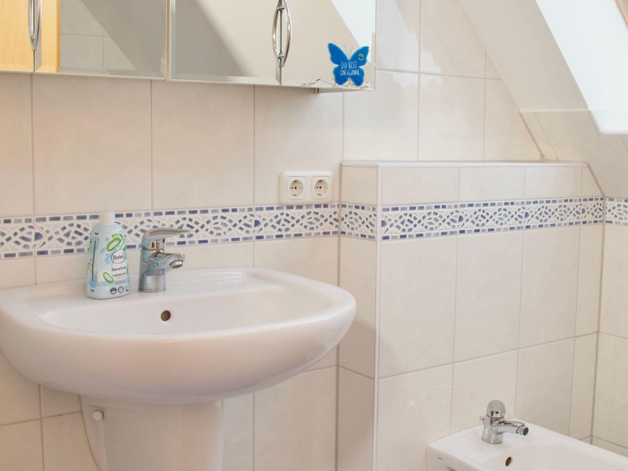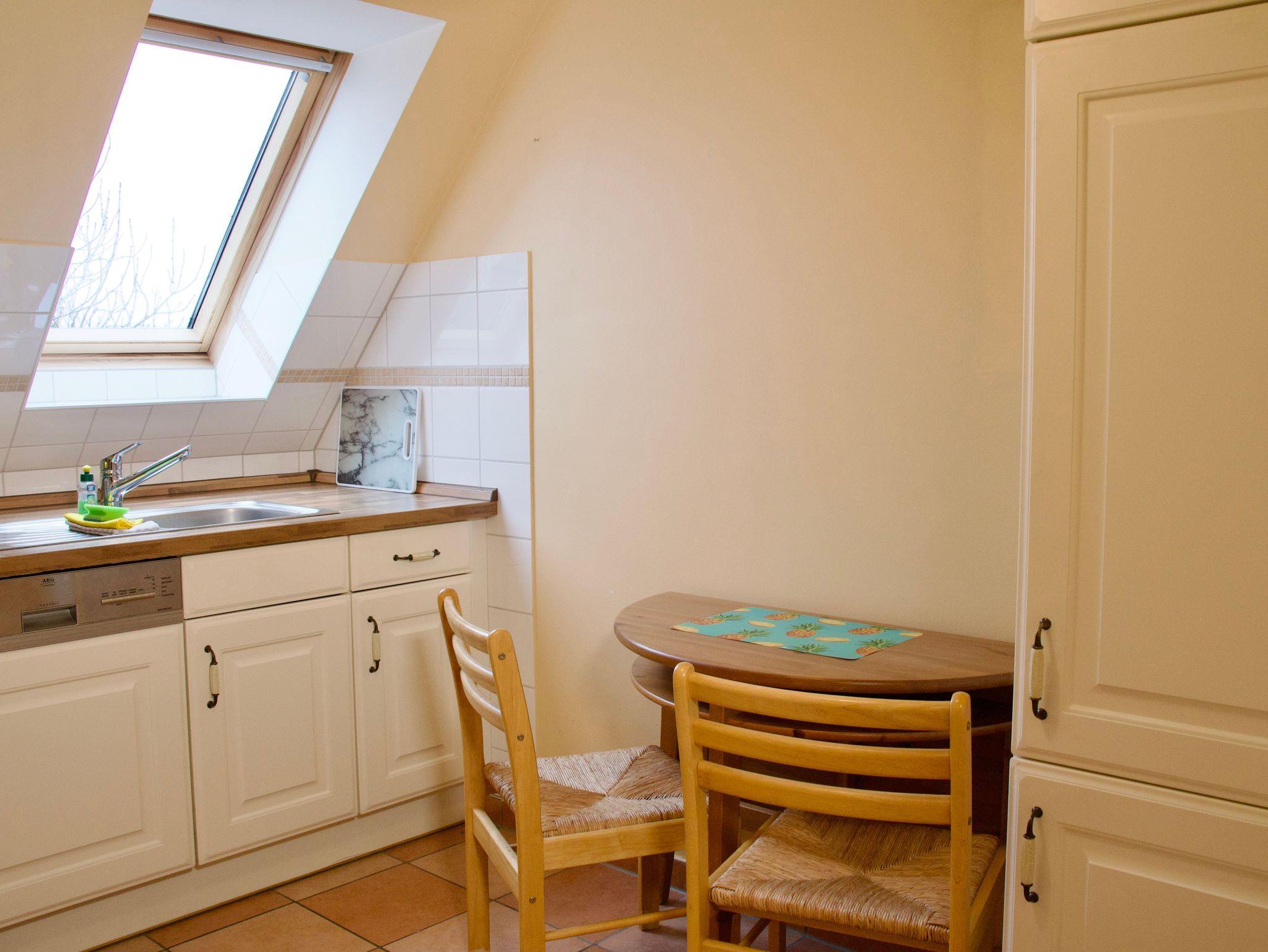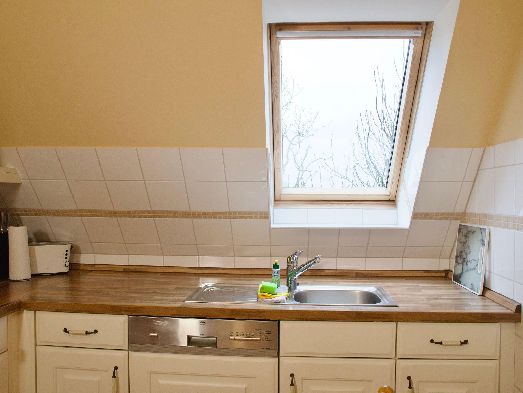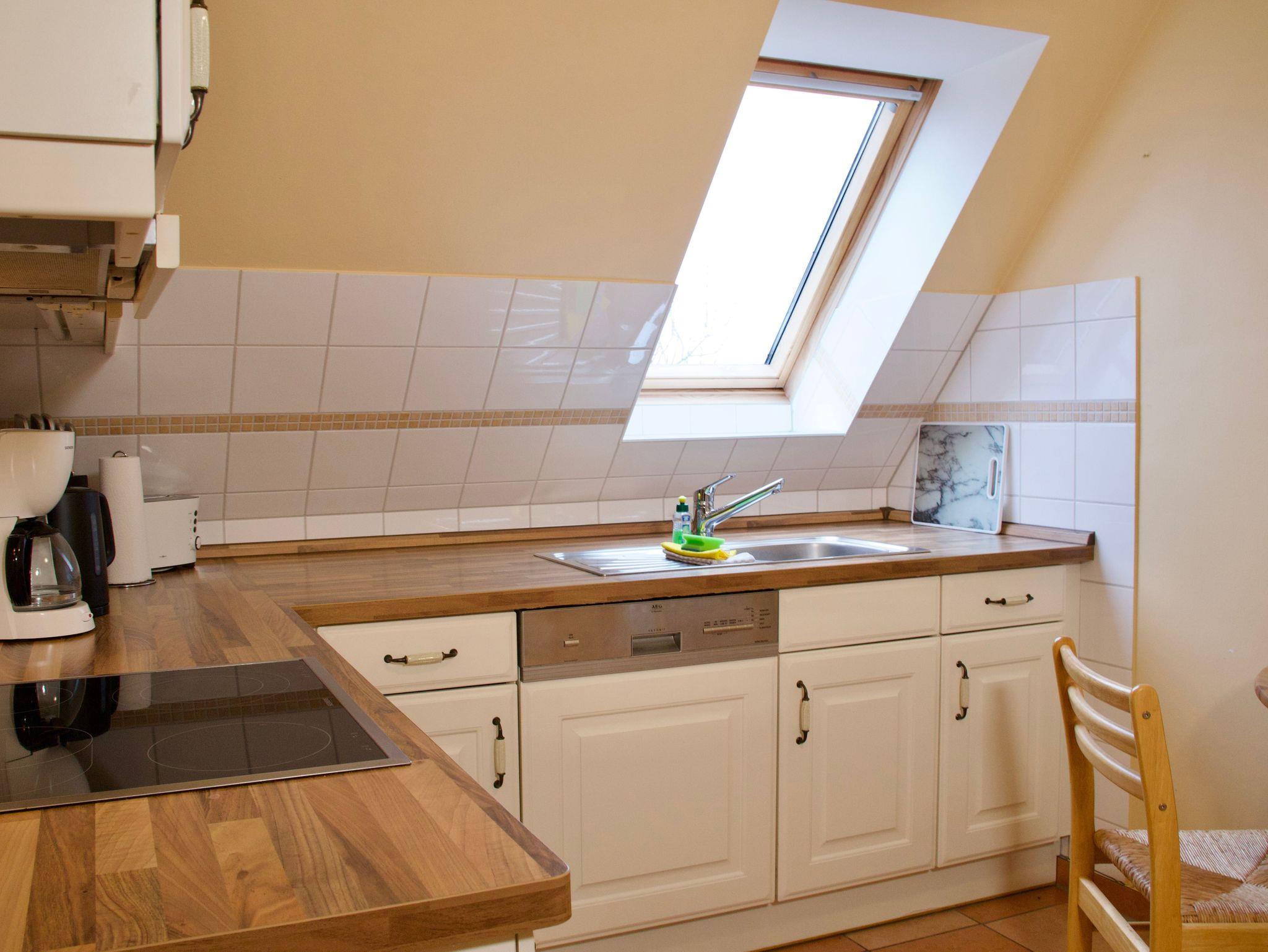 Die Küche ist hell gestaltet, mit Holzelementen versehen und lässt keine Wünsche offen. Ein Geschirrspüler, eine Kaffeemaschine sowie eine Gefriermöglichkeit stehen für die Selbstversorgung im Urlaub bereit. Auch eine Waschmaschine ist vorhanden und fügt sich praktisch in den Alltag während Ihres Aufenthalts ein. Das maritim gestaltete Badezimmer verfügt über ein Fenster sowie eine Dusche mit niedrigem Einstieg und wirkt freundlich und funktional zugleich.