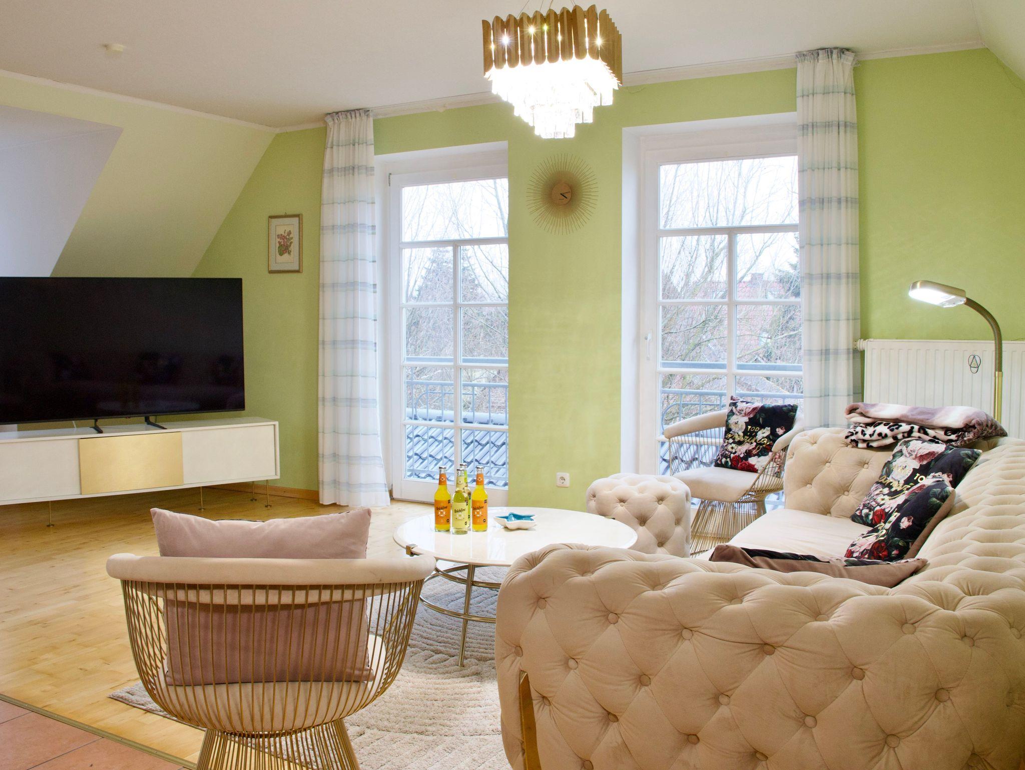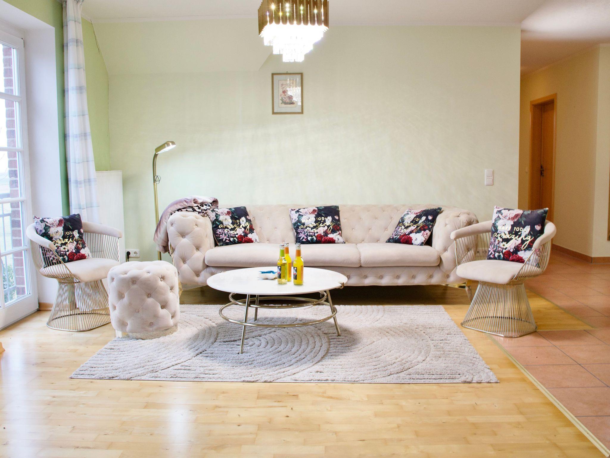 Im ersten Stock des Anwesens befindet sich die Wohnung Twee, eine großzügige und warm eingerichtete Ferienwohnung, die durch ihre ruhige Atmosphäre und den Blick ins Grüne überzeugt. Helle Räume, klare Linien und eine behagliche Gestaltung schaffen ein Wohngefühl, das sofort zum Ankommen einlädt.