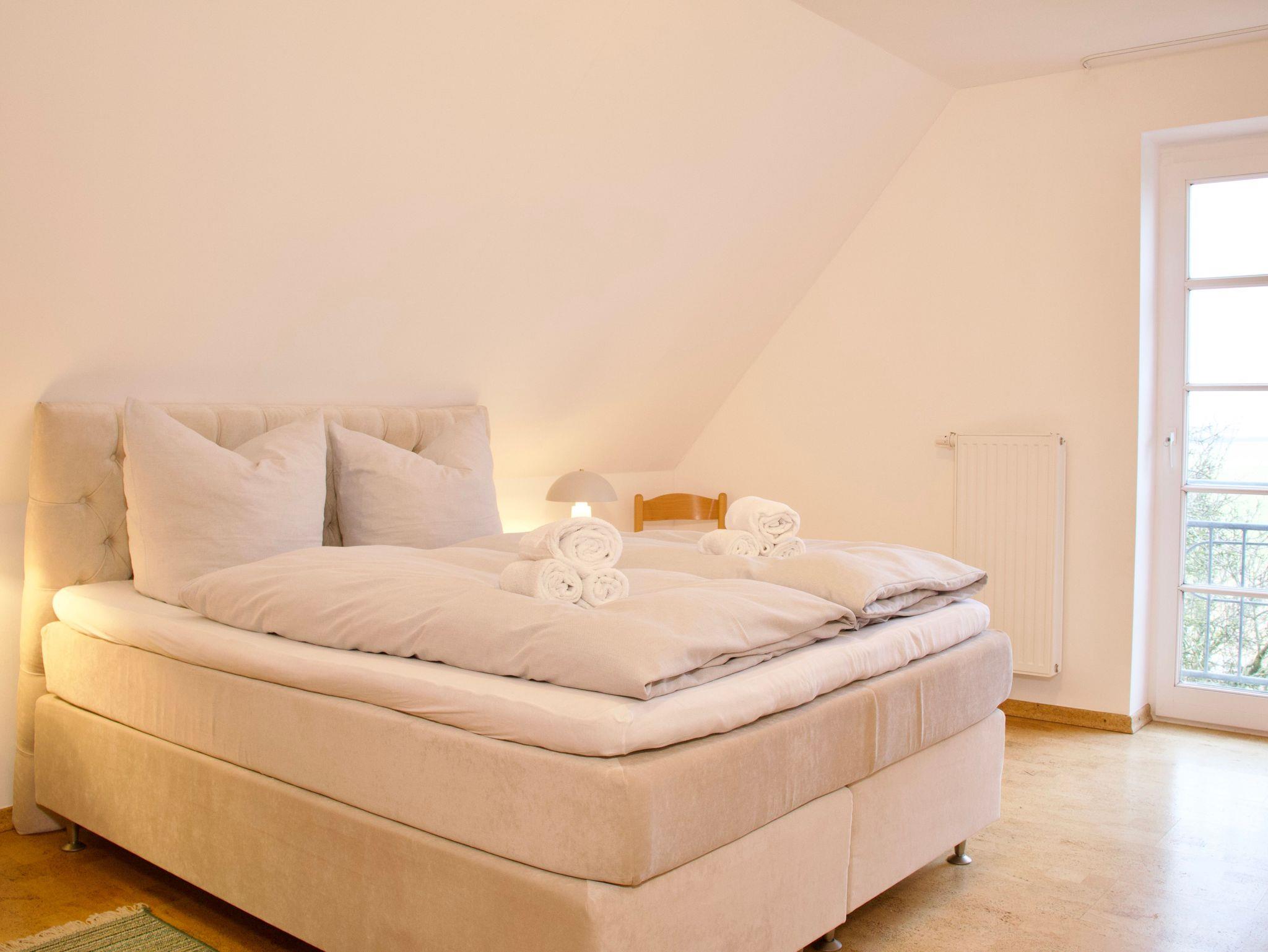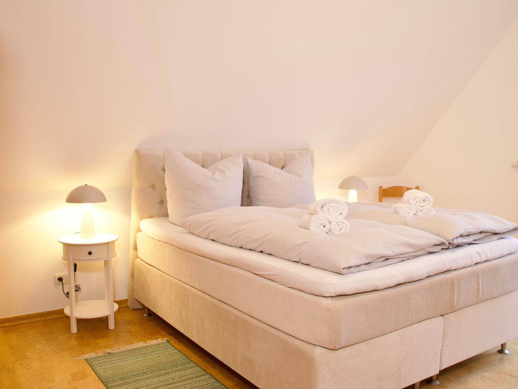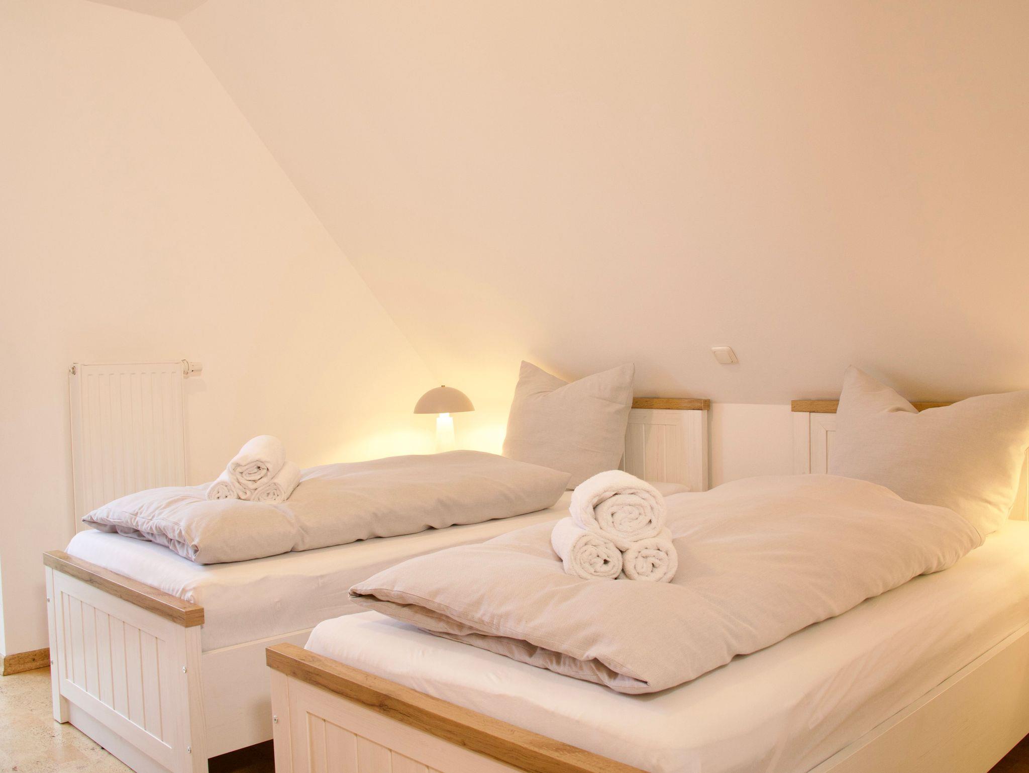 Die Wohnung verfügt über zwei Schlafzimmer, eines mit einem Doppelbett, das andere mit zwei Einzelbetten. Beide Räume sind hell und klar gestaltet. Große Fenster lassen viel Tageslicht einfallen und unterstreichen die offene, freundliche Wirkung der Schlafräume.