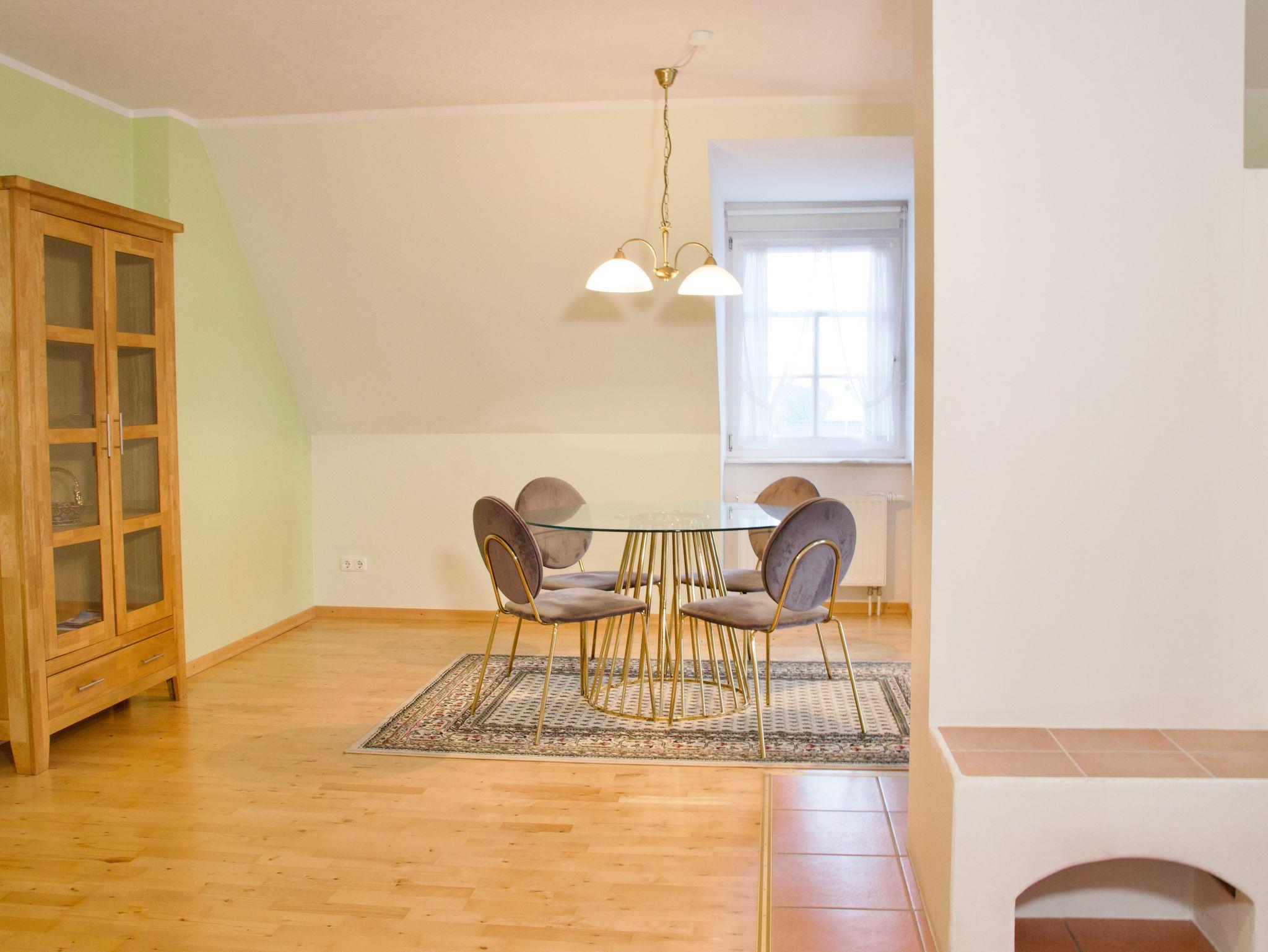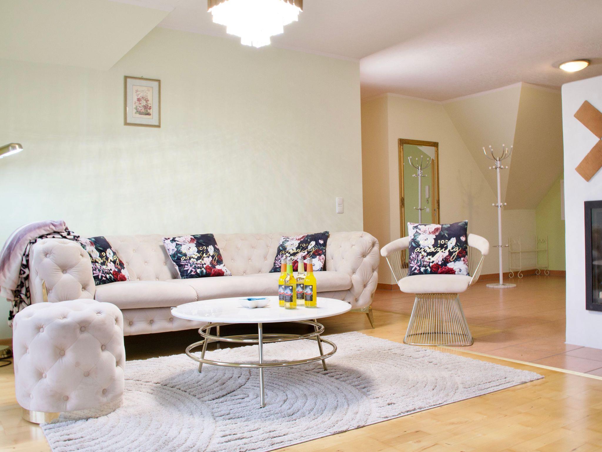 Herzstück der Wohnung ist das große Wohnzimmer. Eine gemütliche Sitzecke, der Esstisch sowie der Kamin bilden einen offenen Wohnbereich mit viel Platz für gemeinsame Zeit. Der Blick aus dem Wohnzimmer reicht weit über die umliegenden Felder und vermittelt ein Gefühl von Ruhe und Weite. Für entspannte Abende steht hier ein 65-Zoll-Smart-TV zur Verfügung, der den Wohnkomfort dezent ergänzt.