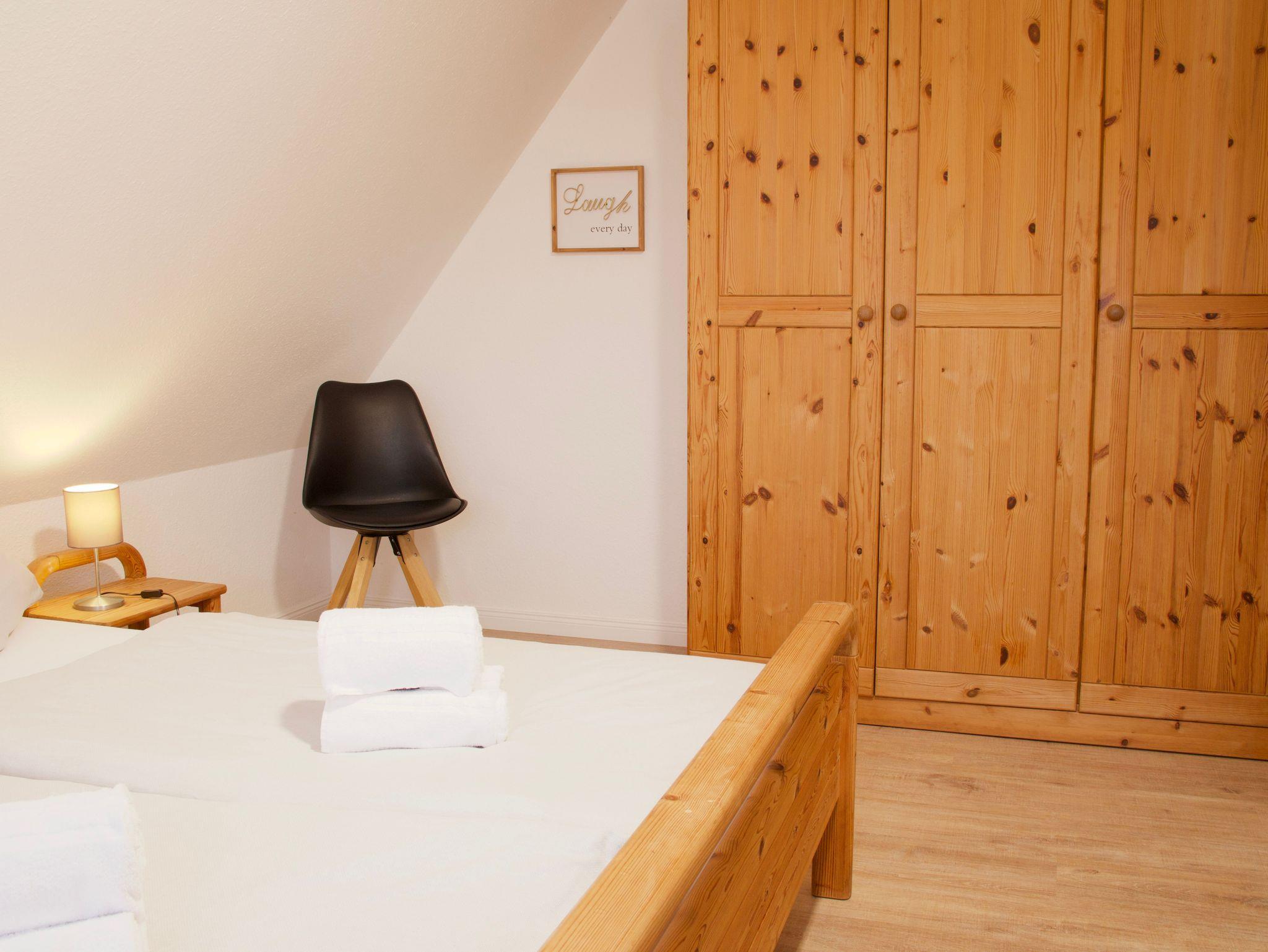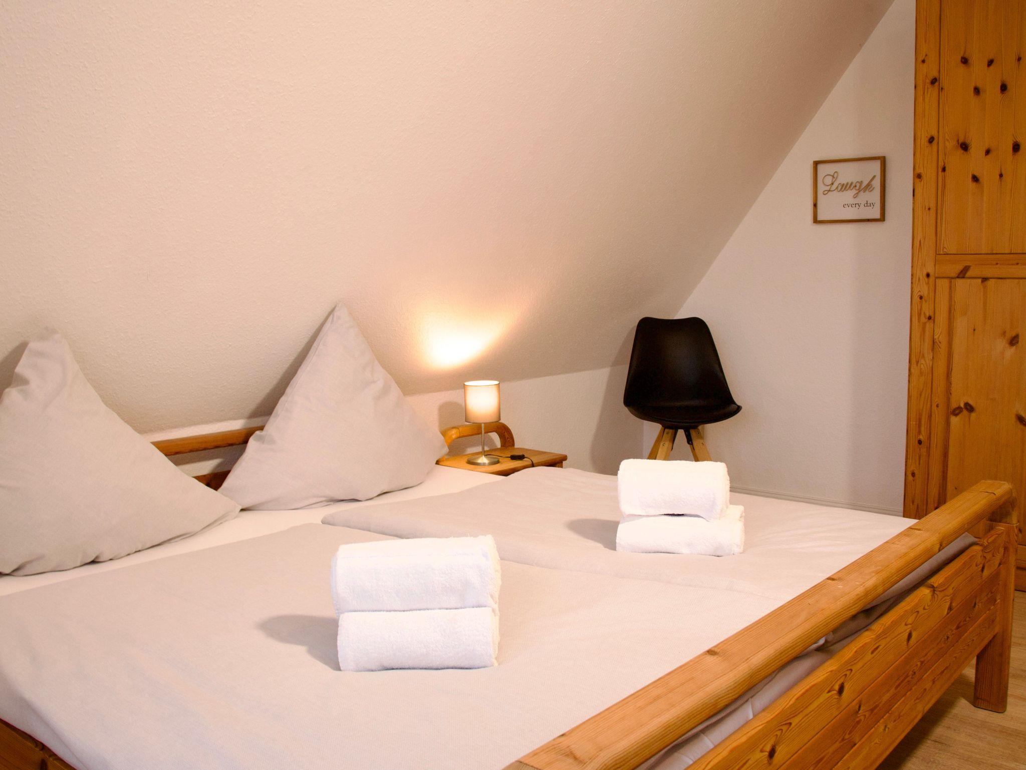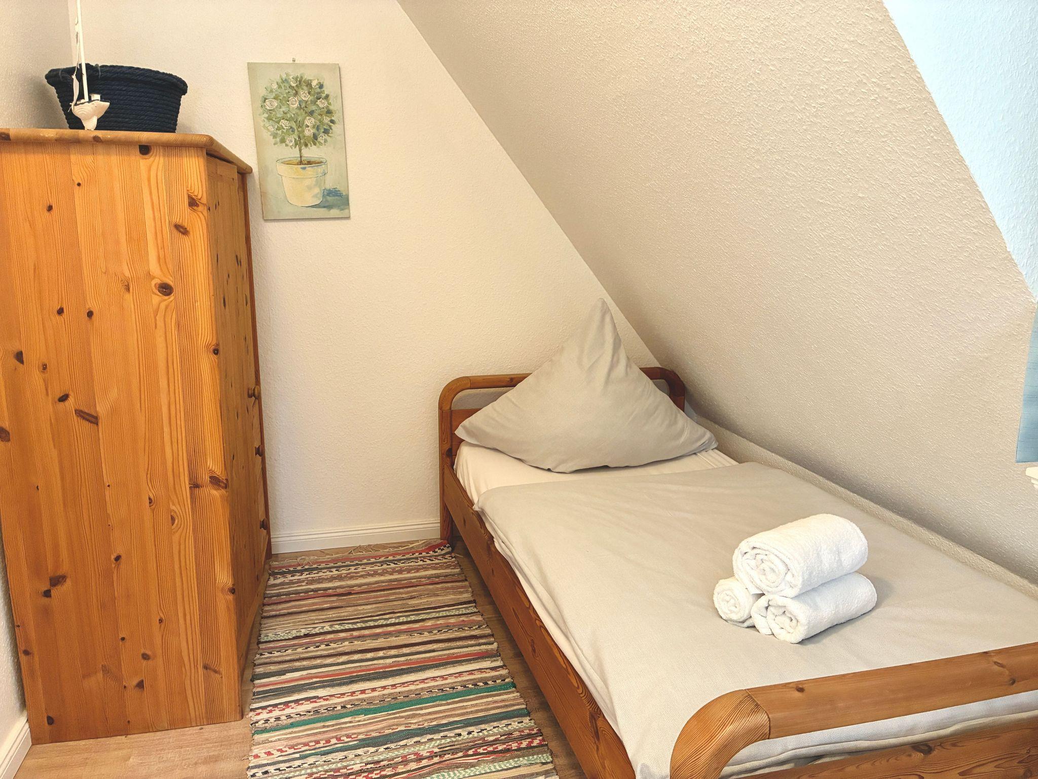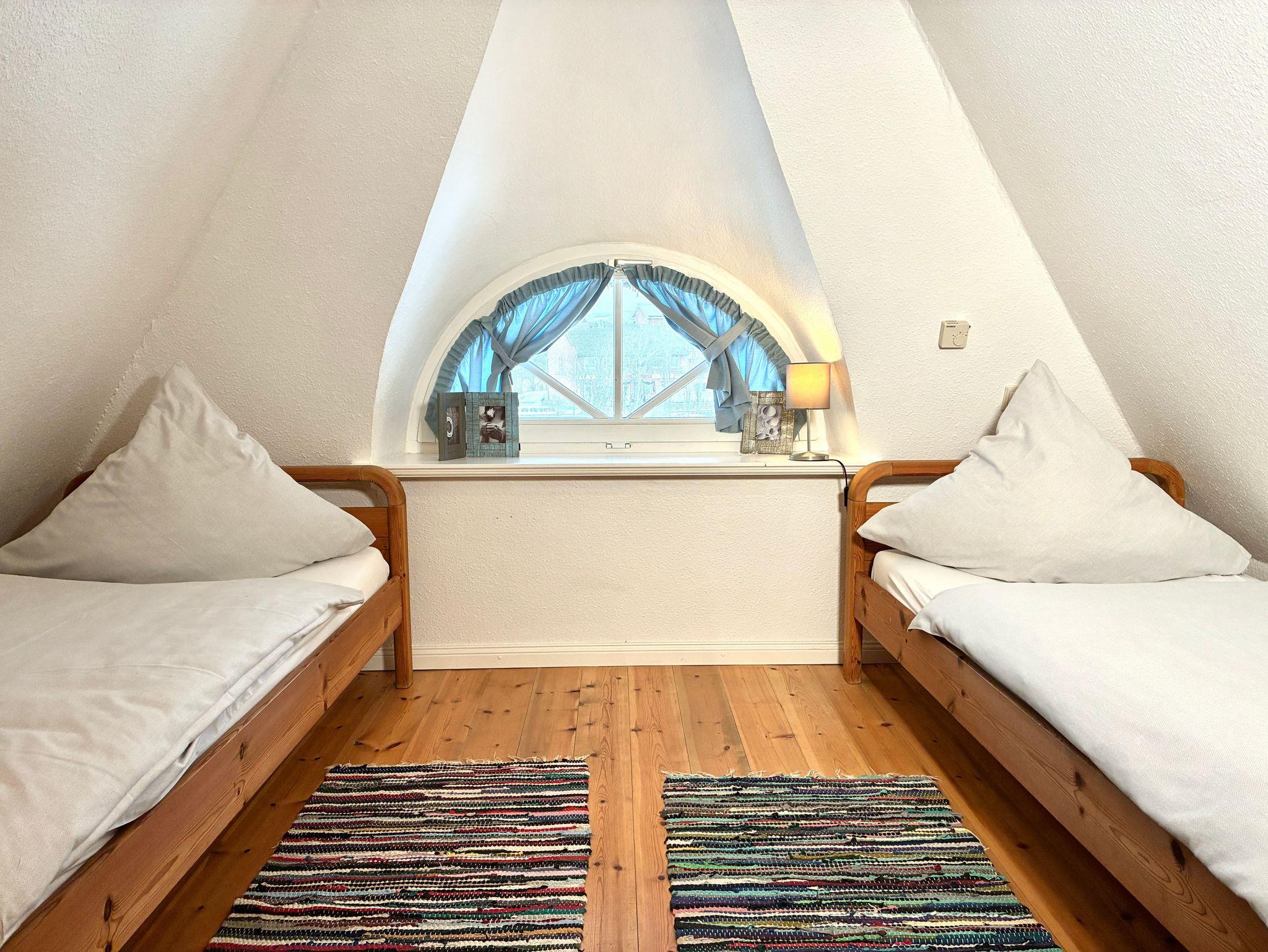 Im ersten Obergeschoss befinden sich zwei Schlafzimmer, eines mit einem Doppelbett und eines mit zwei Einzelbetten, sowie ein Duschbad mit WC. Ein drittes Schlafzimmer mit zwei weiteren Einzelbetten liegt im ausgebauten Giebelzimmer und bietet einen zusätzlichen, angenehm abgeschirmten Schlafbereich.