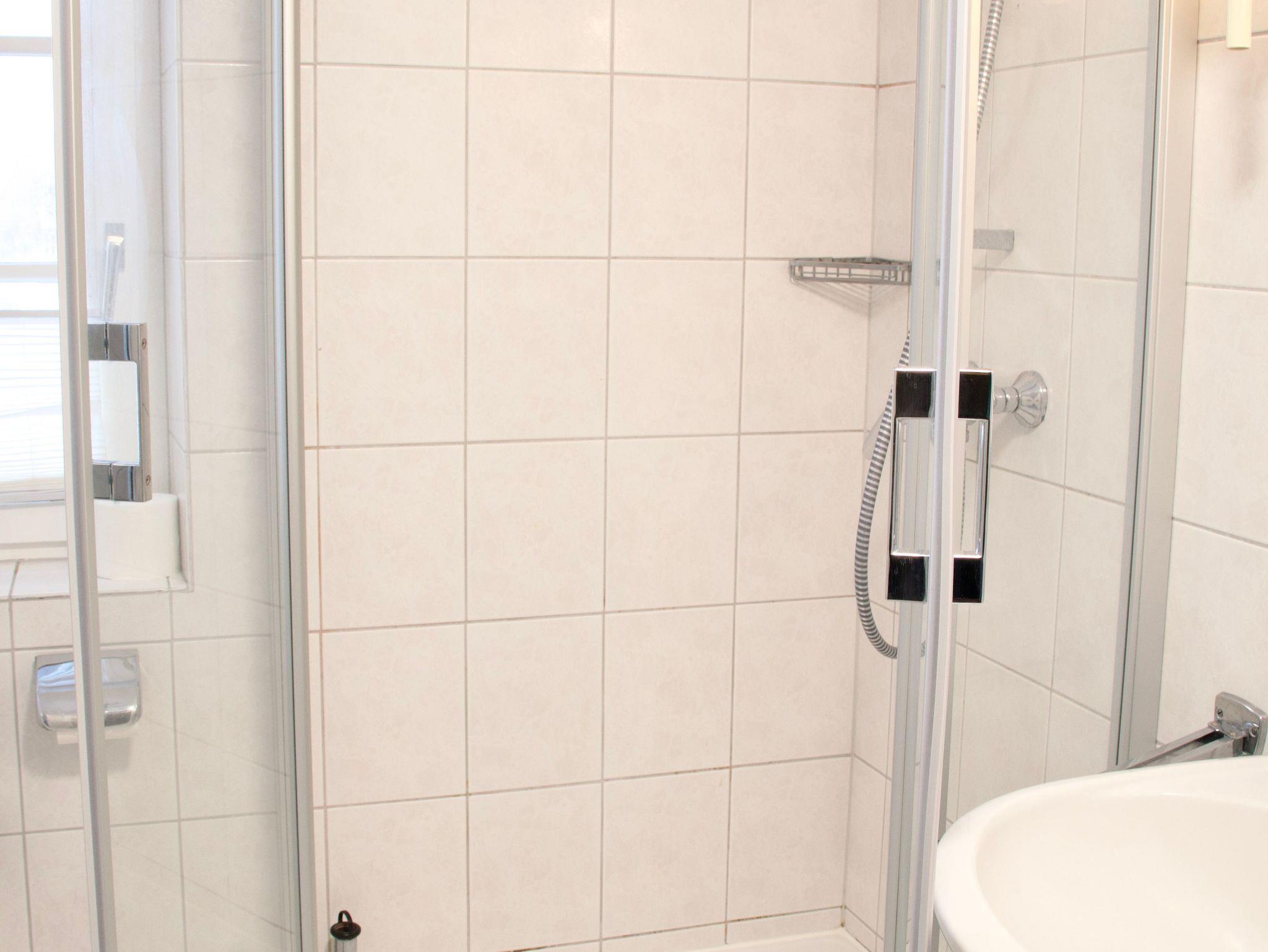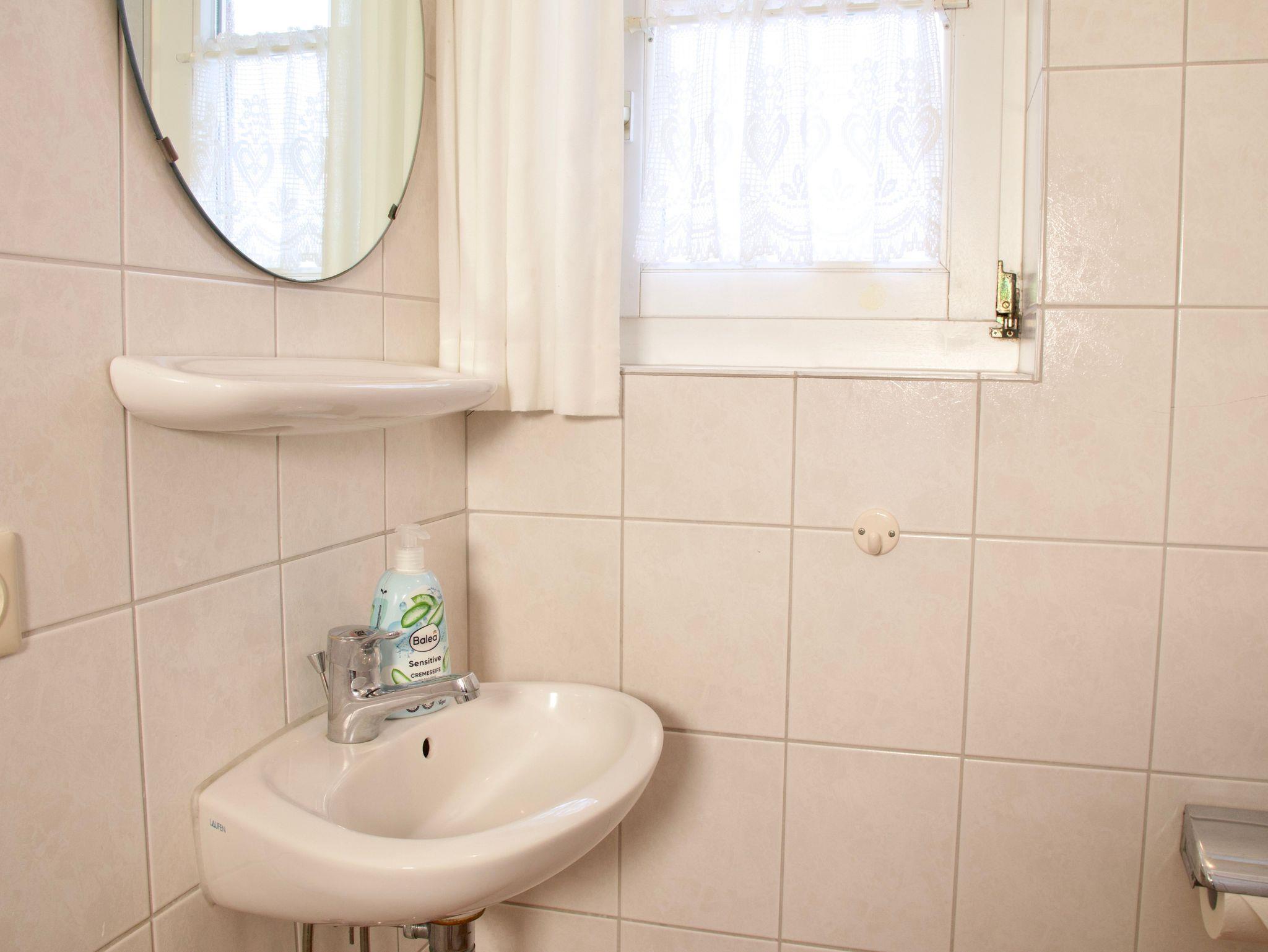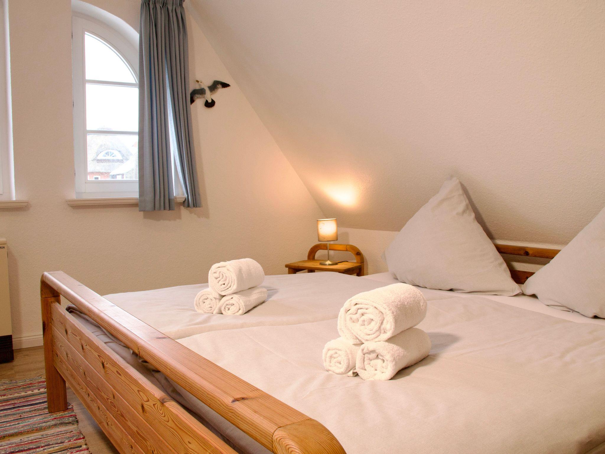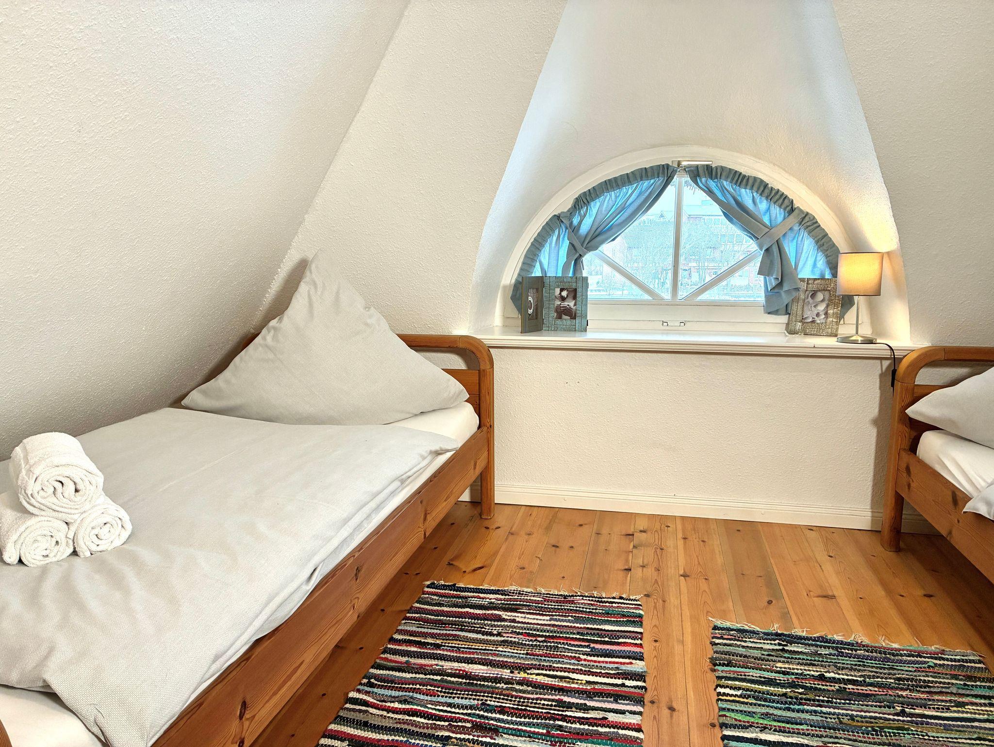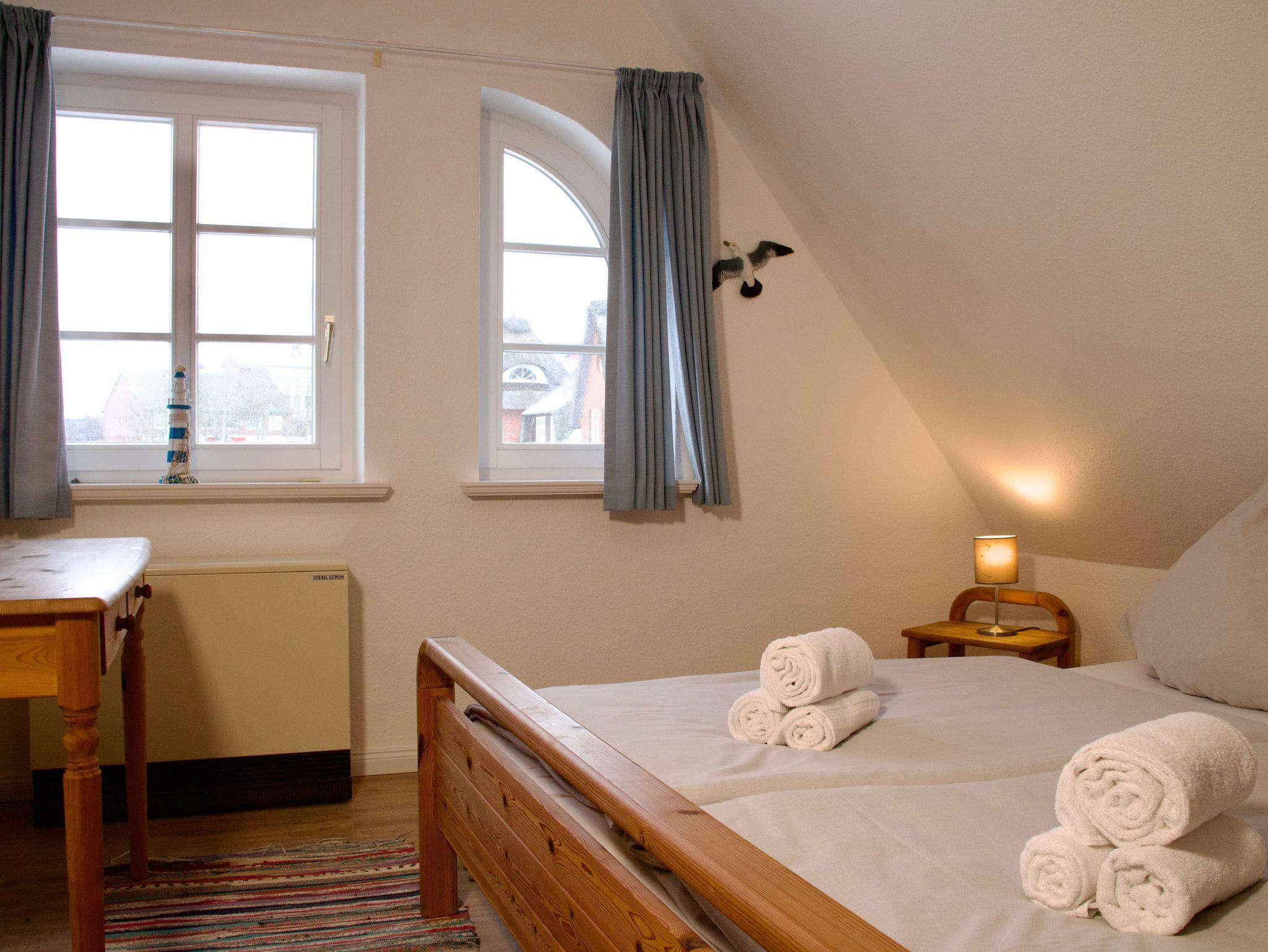 Im ersten Obergeschoss befinden sich zwei Schlafzimmer, eines mit einem Doppelbett und eines mit zwei Einzelbetten, sowie ein Duschbad mit WC. Ein drittes Schlafzimmer mit zwei weiteren Einzelbetten liegt im ausgebauten Giebelzimmer und bietet einen zusätzlichen, angenehm abgeschirmten Schlafbereich.