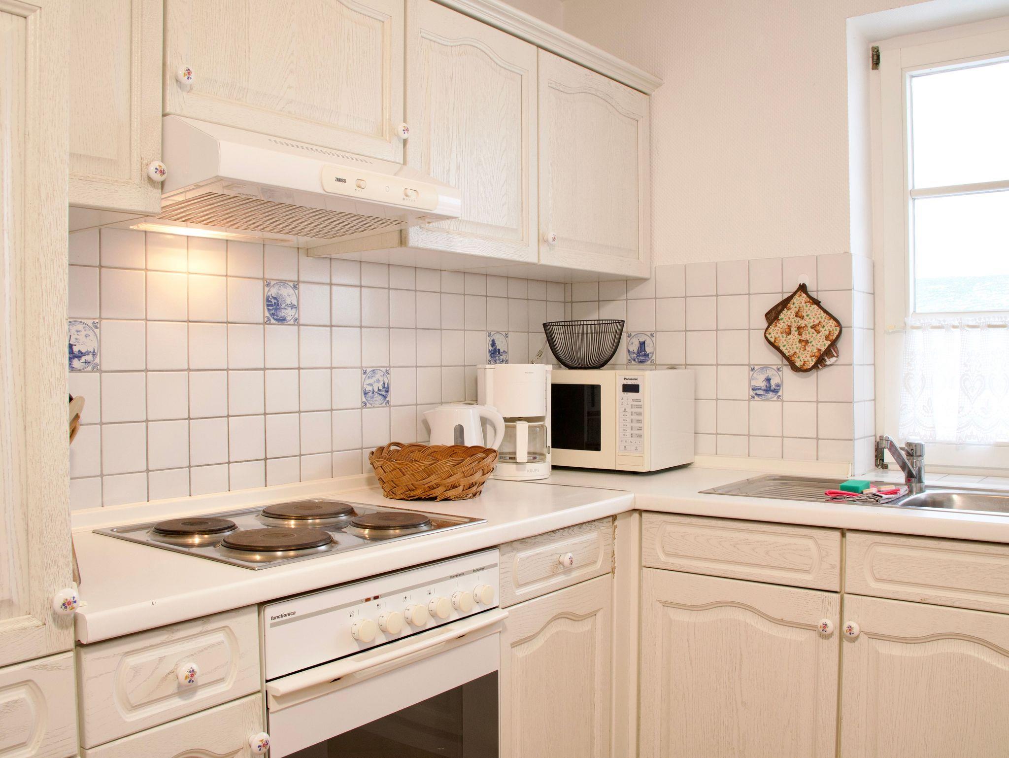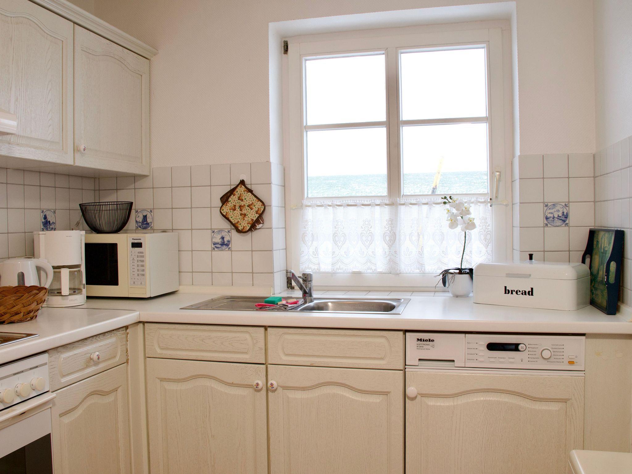 Die Küche ist separat gehalten und vollständig ausgestattet. Sie bietet ausreichend Platz für die tägliche Selbstversorgung und verfügt unter anderem über eine Spülmaschine, eine Kaffeemaschine sowie eine Gefriermöglichkeit. Auch eine Waschmaschine steht zur Verfügung und ist besonders bei längeren Aufenthalten praktisch.