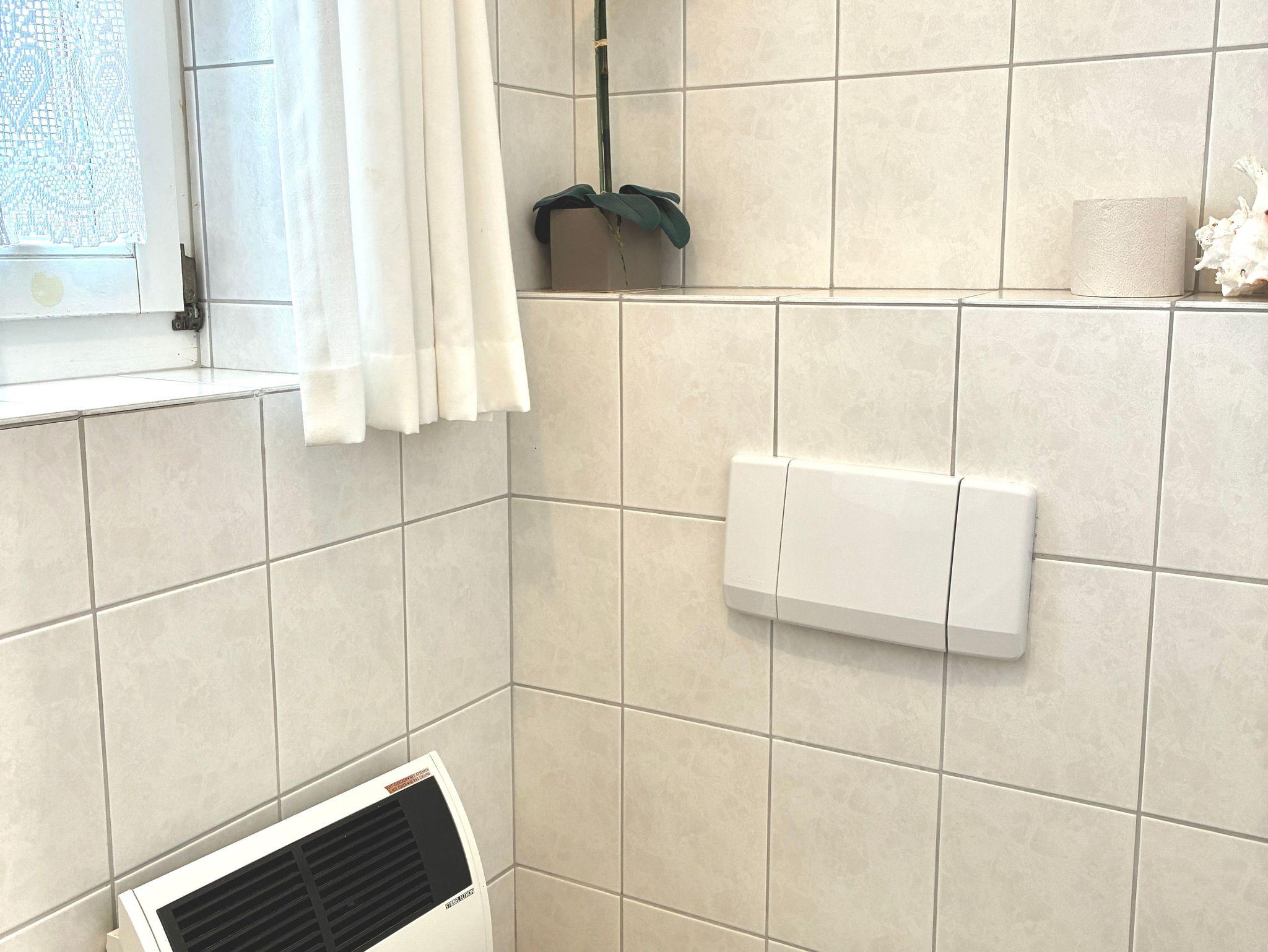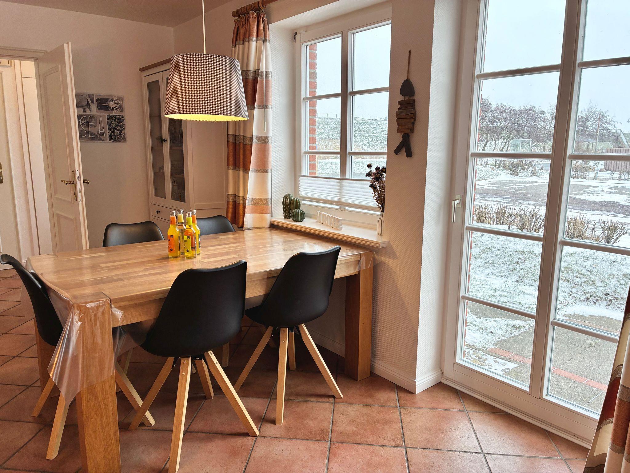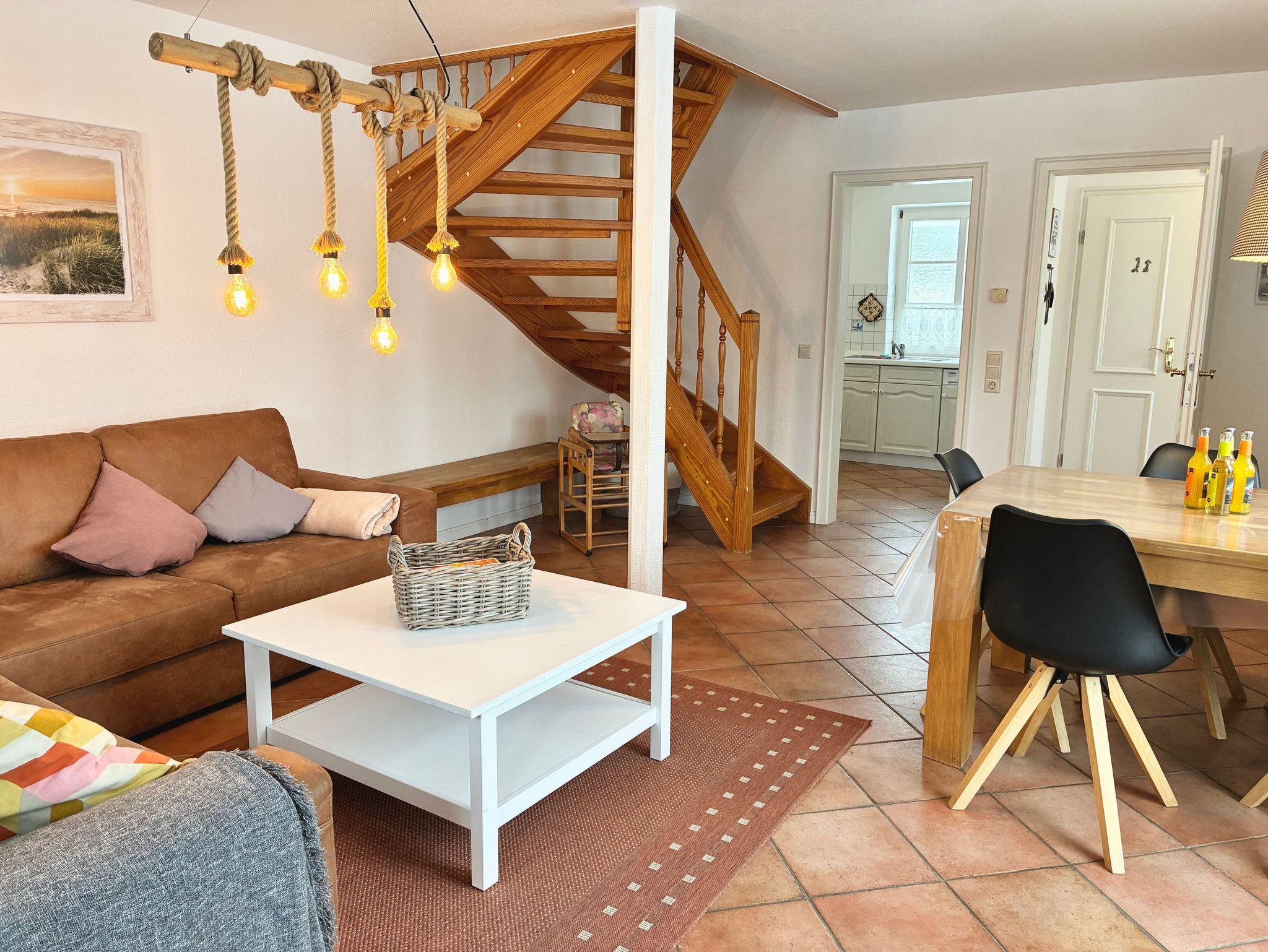 Im Erdgeschoss erwartet Sie ein großzügiger Wohnbereich, in dem Wohnen und Essen harmonisch miteinander verbunden sind. Helle Materialien und natürliche Akzente prägen die Einrichtung und verleihen dem Haus eine ruhige, wohnliche Atmosphäre. Große Fenster und die Terrassentür sorgen für viel Tageslicht und schaffen ein freundliches, ruhiges Raumgefühl. Von hier aus gelangen Sie direkt auf die nach Süden ausgerichtete, möblierte Terrasse mit eigenem Strandkorb. Ein separates Gäste-WC ist vom Flur aus erreichbar und ergänzt den Wohnkomfort im Erdgeschoss.