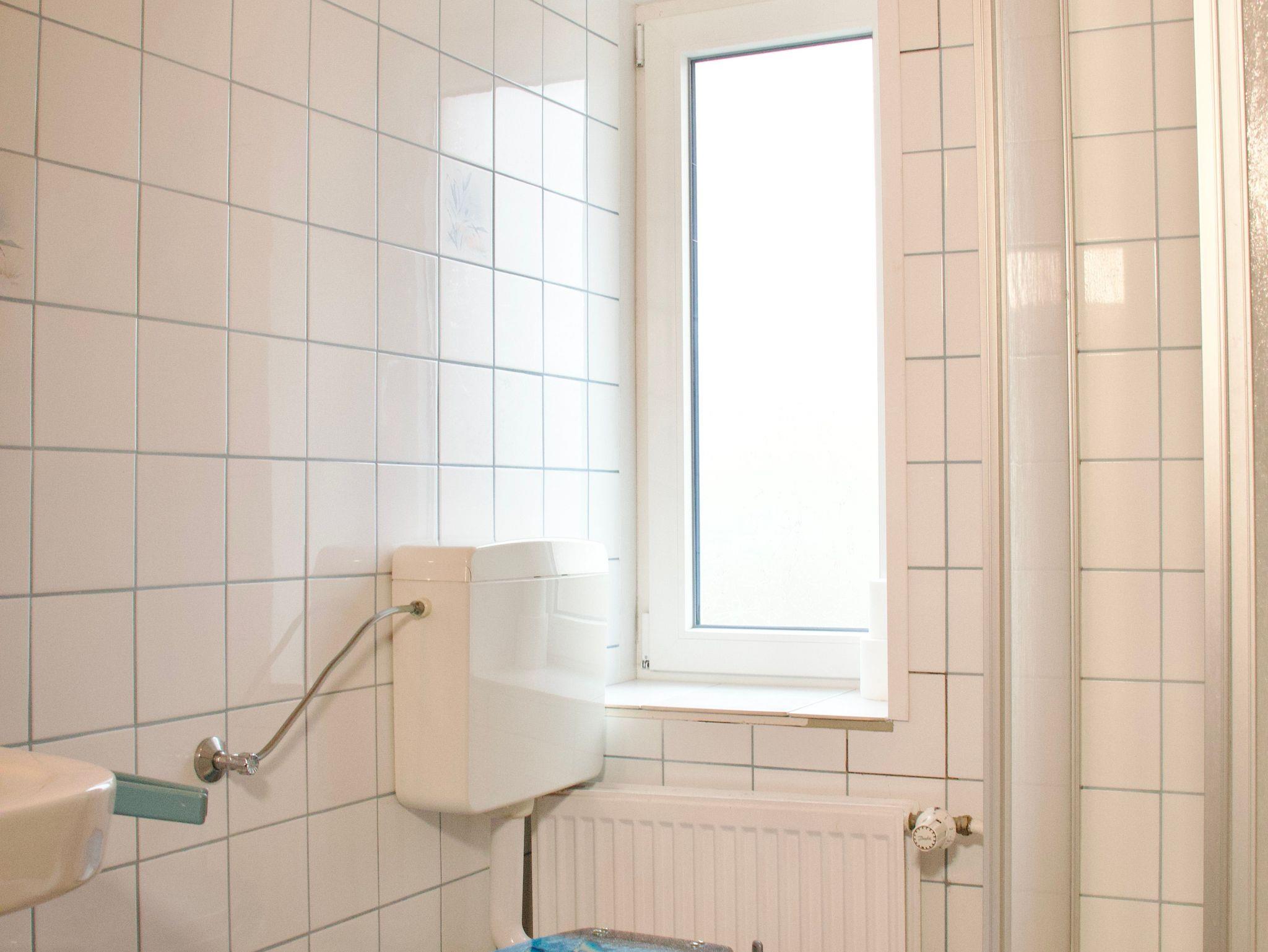 Das helle Duschbad mit Fenster ist funktional gestaltet und sorgt durch Tageslicht für eine freundliche Atmosphäre.