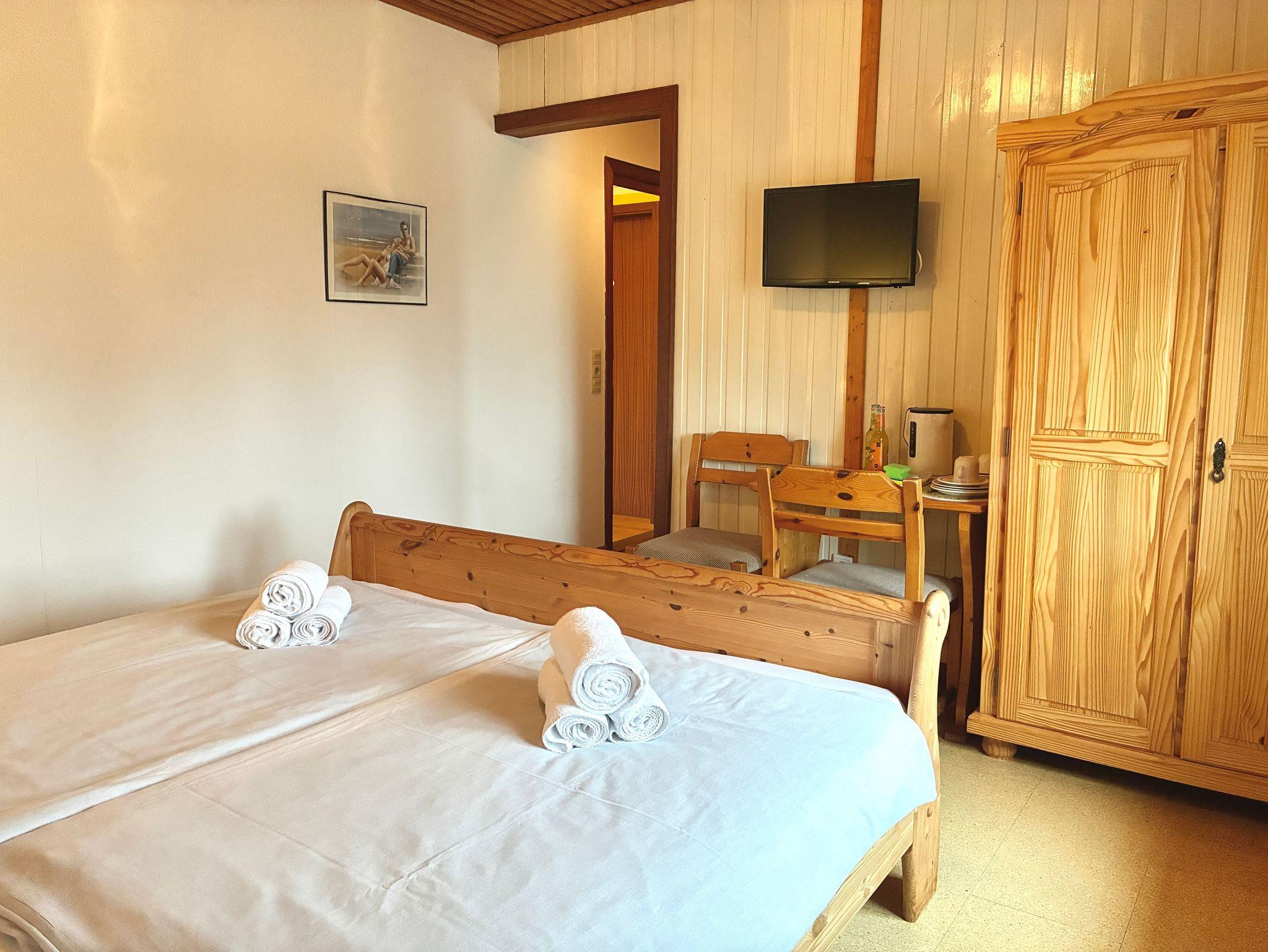Das Studio verfügt über einen kombinierten Wohn- und Schlafbereich mit Doppelbett und TV. Die Einrichtung ist geprägt von warmen Naturmaterialien und einer ruhigen Farbgebung. Vertäfelte Wandflächen im Schlafbereich unterstreichen die behagliche Atmosphäre und verleihen dem Raum einen wohnlichen, zurückhaltenden Charakter.